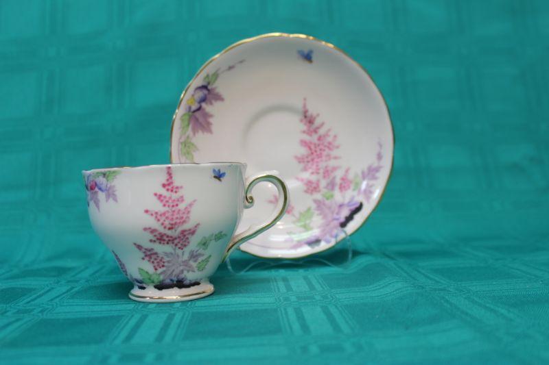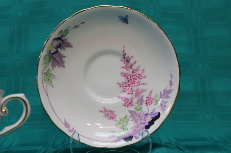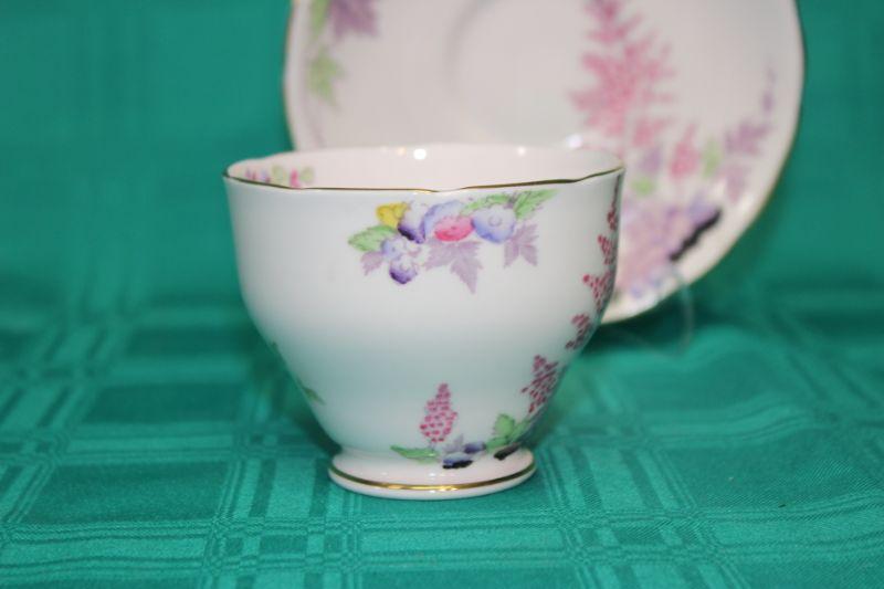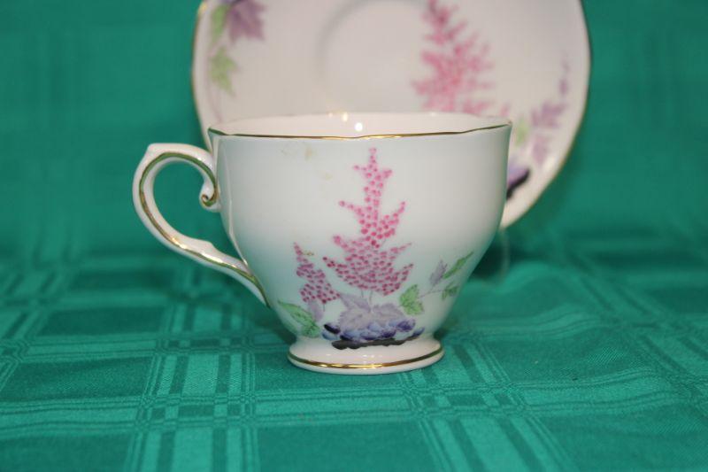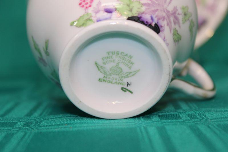 Pale pink with a pink and purple floral pattern. Tea cup and saucer from Tuscan Fine Bone China. Made in England. There is a crack in the saucer (photo)