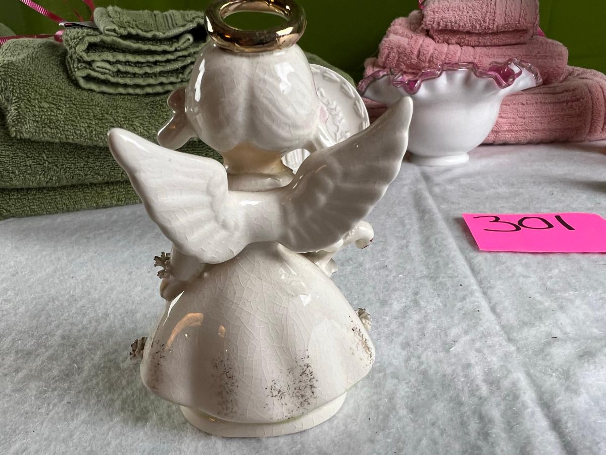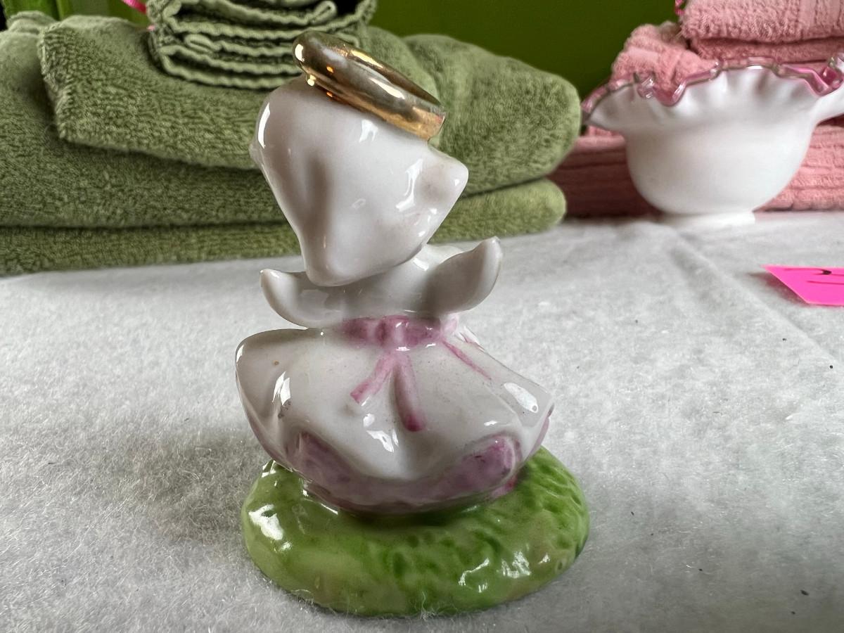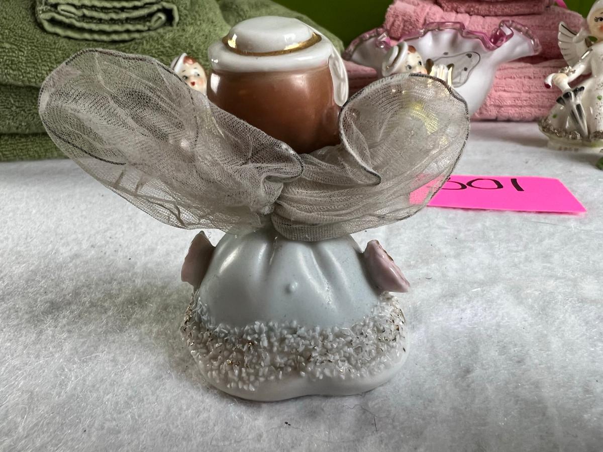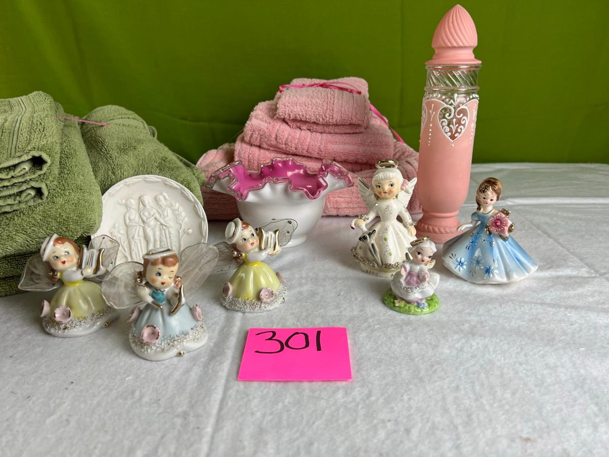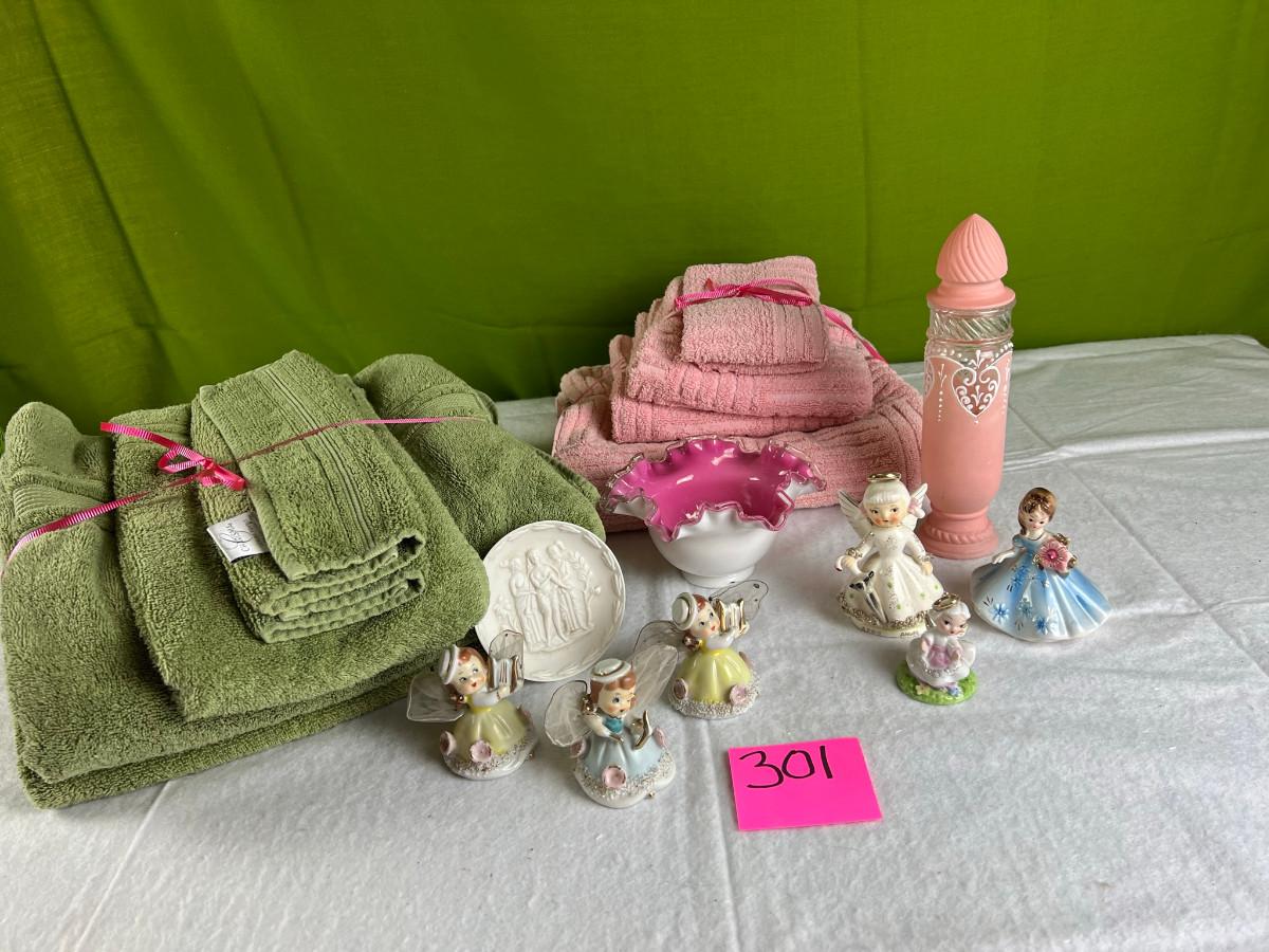 Vintage tall pink glass with lid 10.5" x 2" Marly on bottom, pink and white bowl 4" x 6.5", April Angel neck glued, white dish with 3 women 6.5", large angel Josef original 5" x 3.5", medium angel 4" x 2.5", small angel 3" x 2" 2 sets of towels 1. Green Charisma Luxury (2 bath, 1 hand, 2 wash) 2. Pink Colormate supreme field Crest (1 bath, 2 hand, 2 wash)