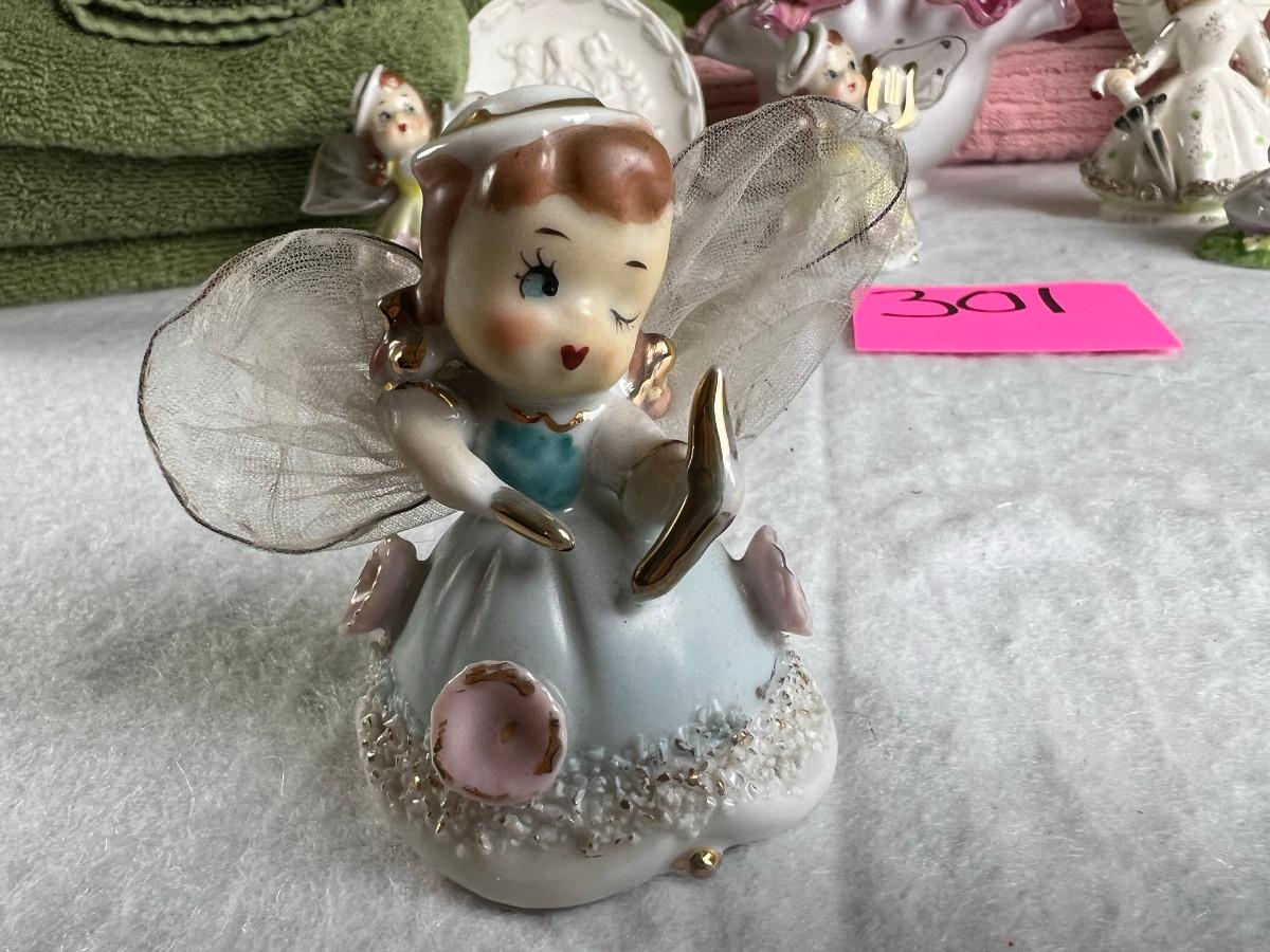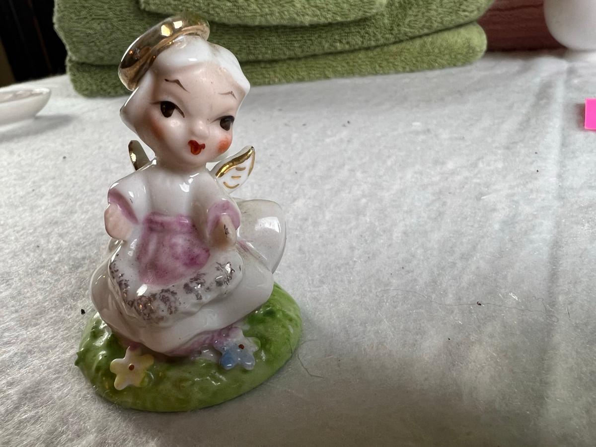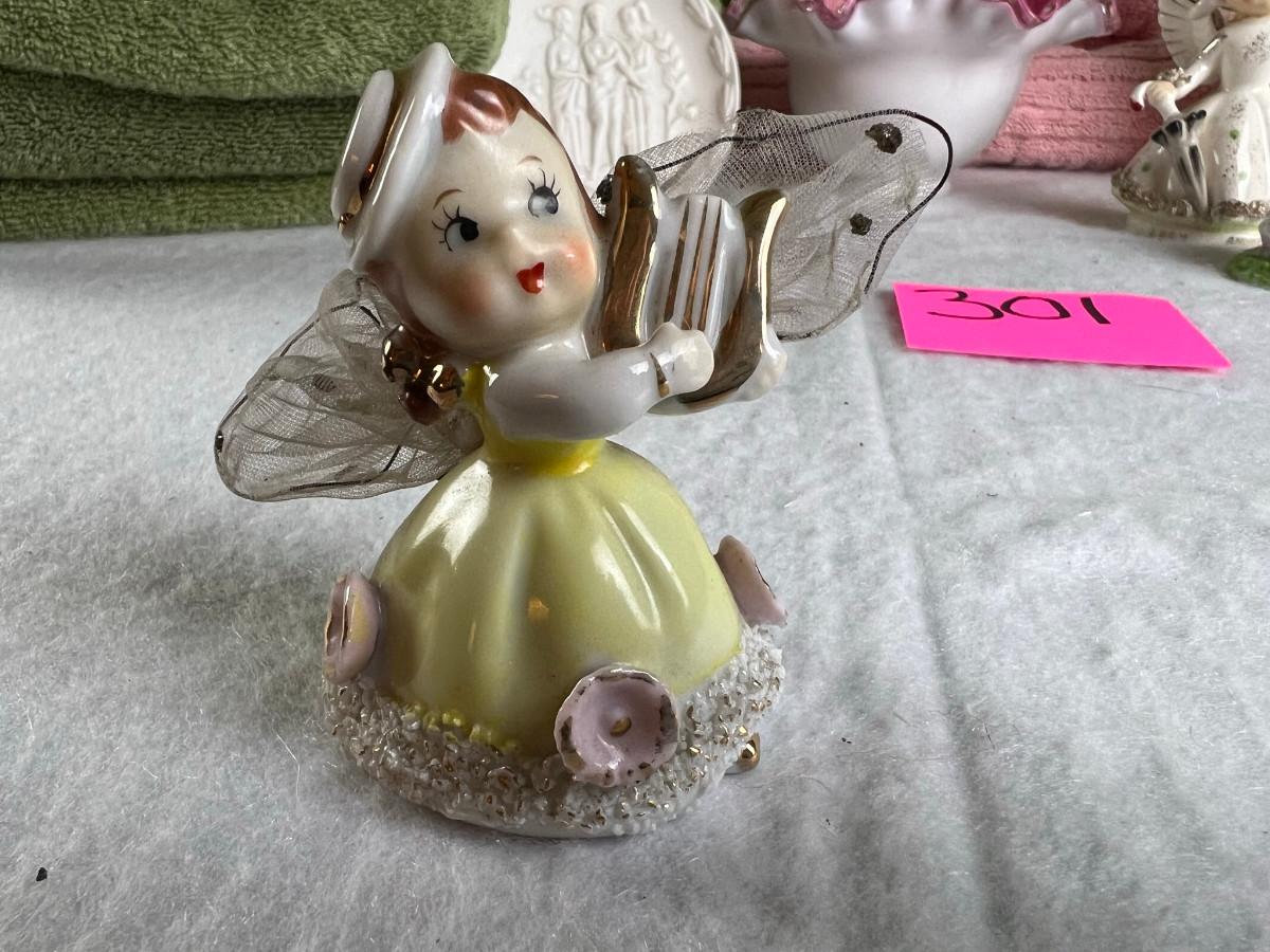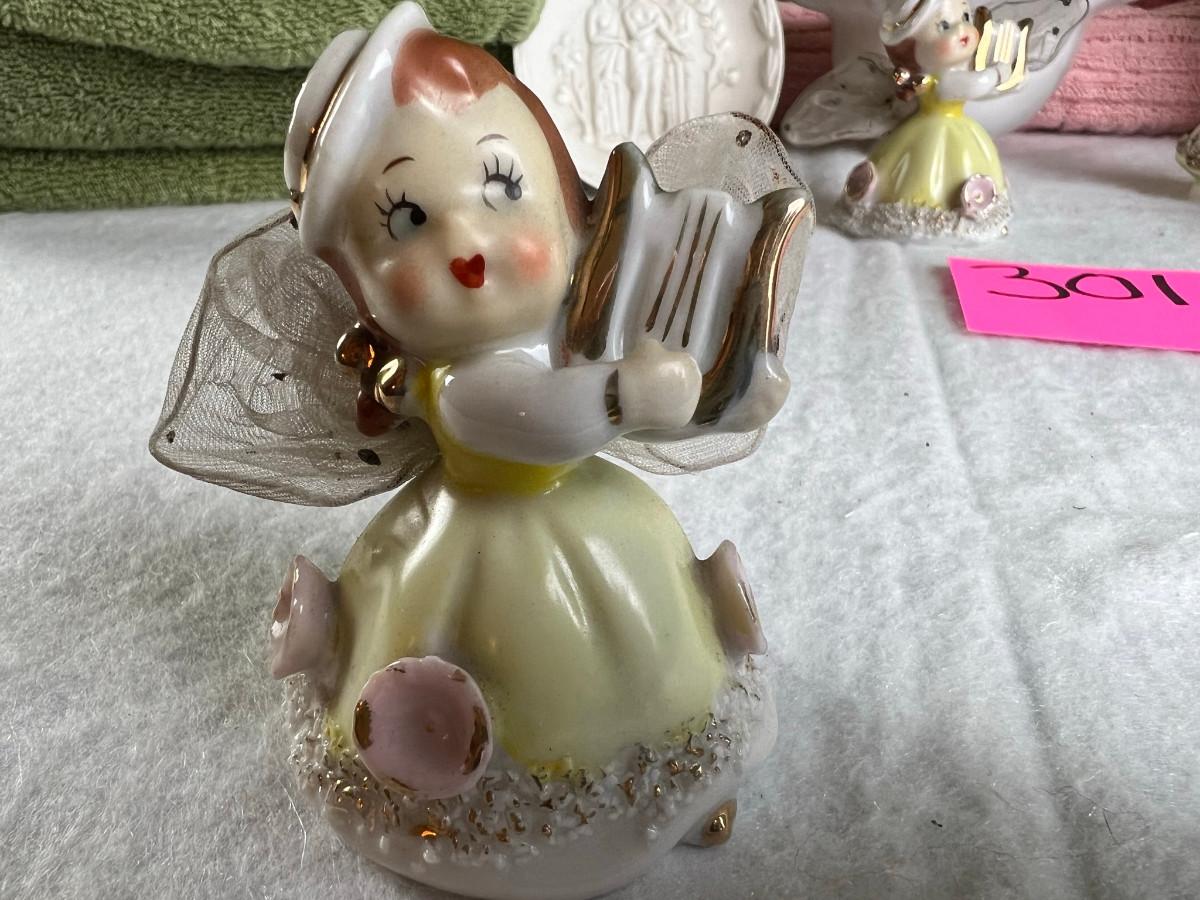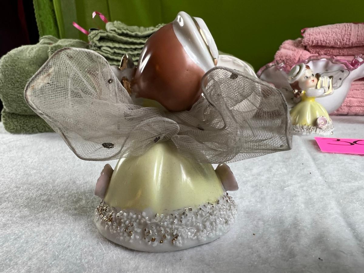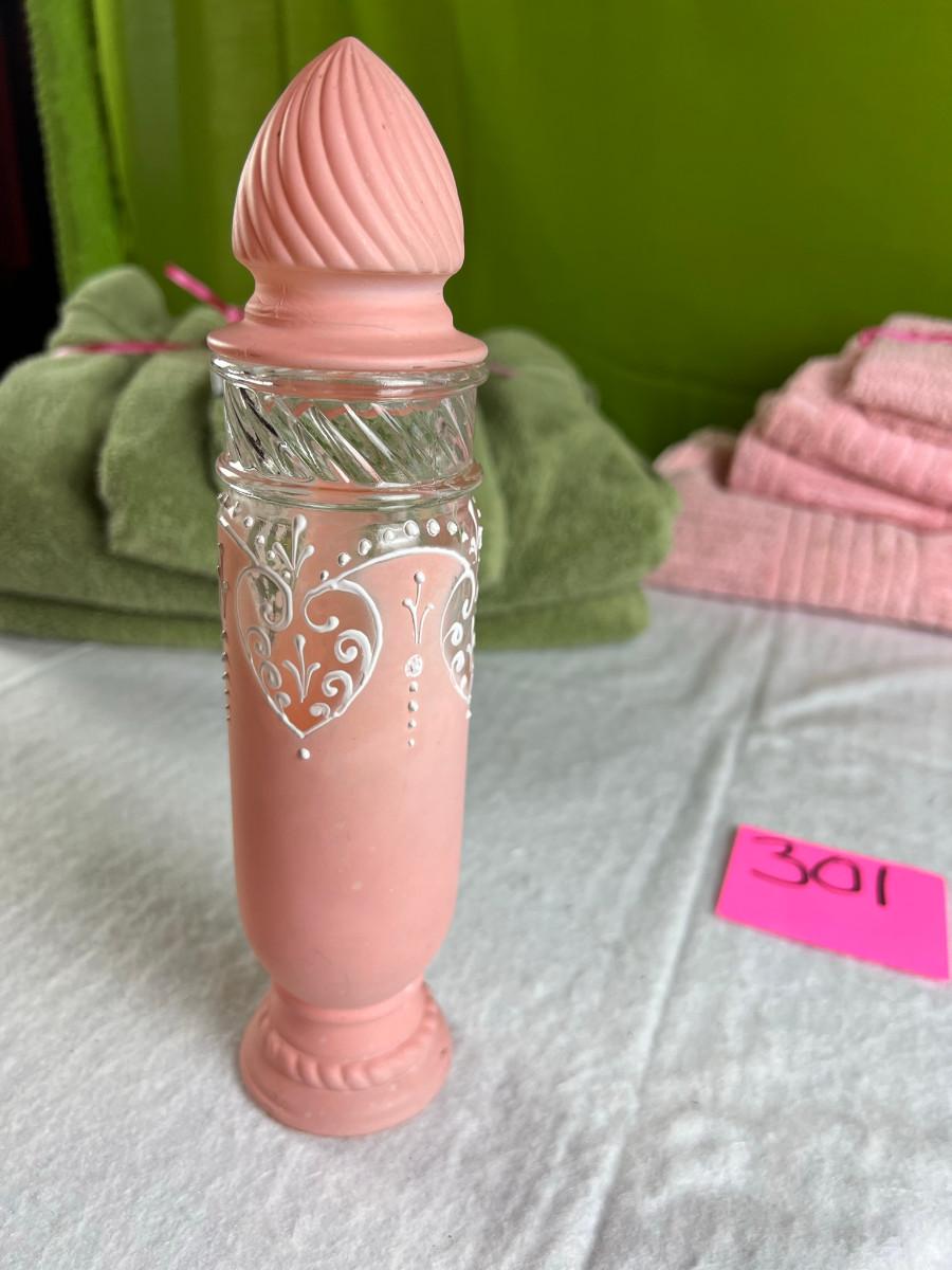 Vintage tall pink glass with lid 10.5" x 2" Marly on bottom, pink and white bowl 4" x 6.5", April Angel neck glued, white dish with 3 women 6.5", large angel Josef original 5" x 3.5", medium angel 4" x 2.5", small angel 3" x 2" 2 sets of towels 1. Green Charisma Luxury (2 bath, 1 hand, 2 wash) 2. Pink Colormate supreme field Crest (1 bath, 2 hand, 2 wash)