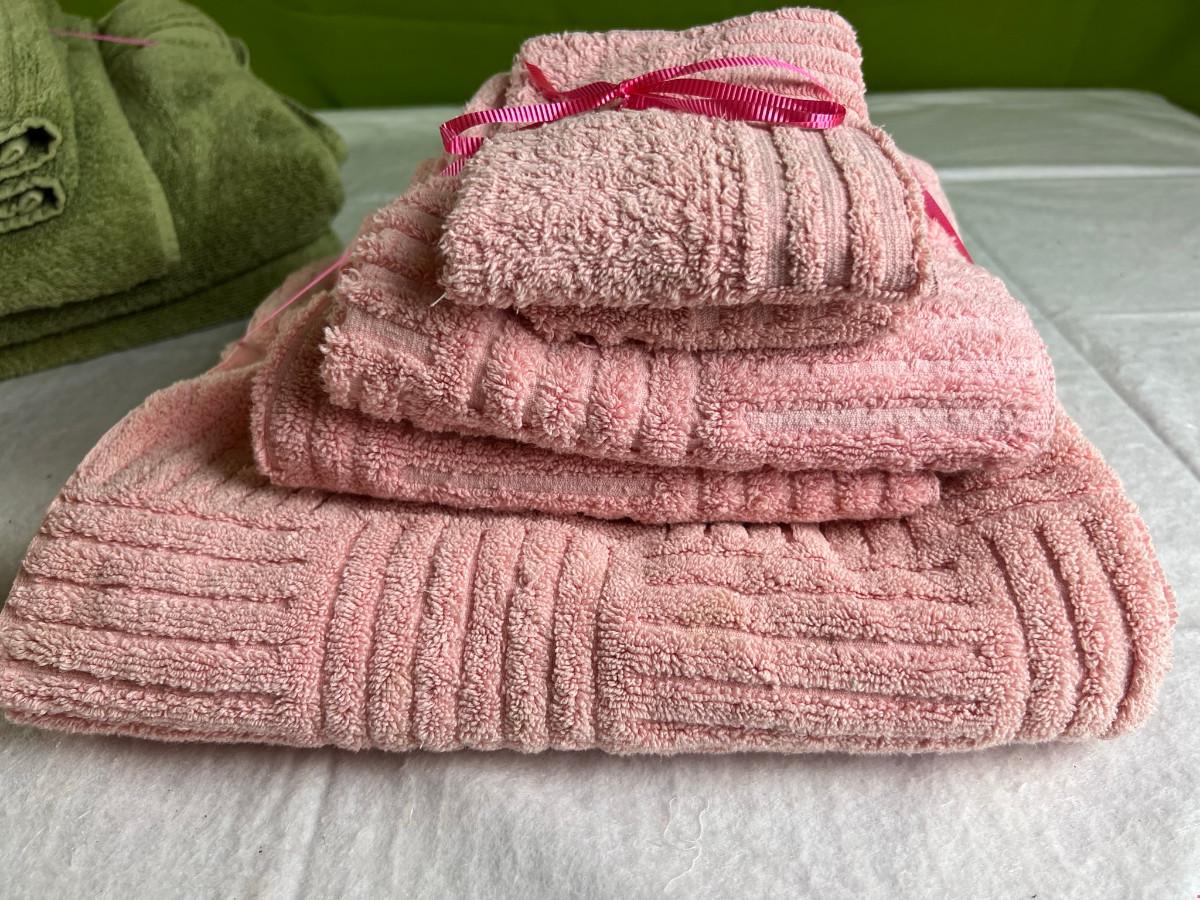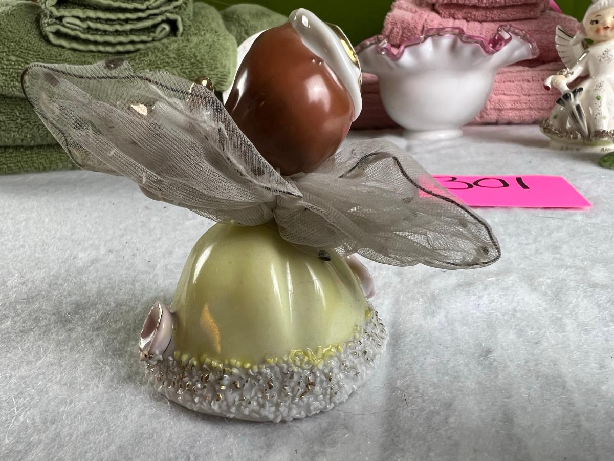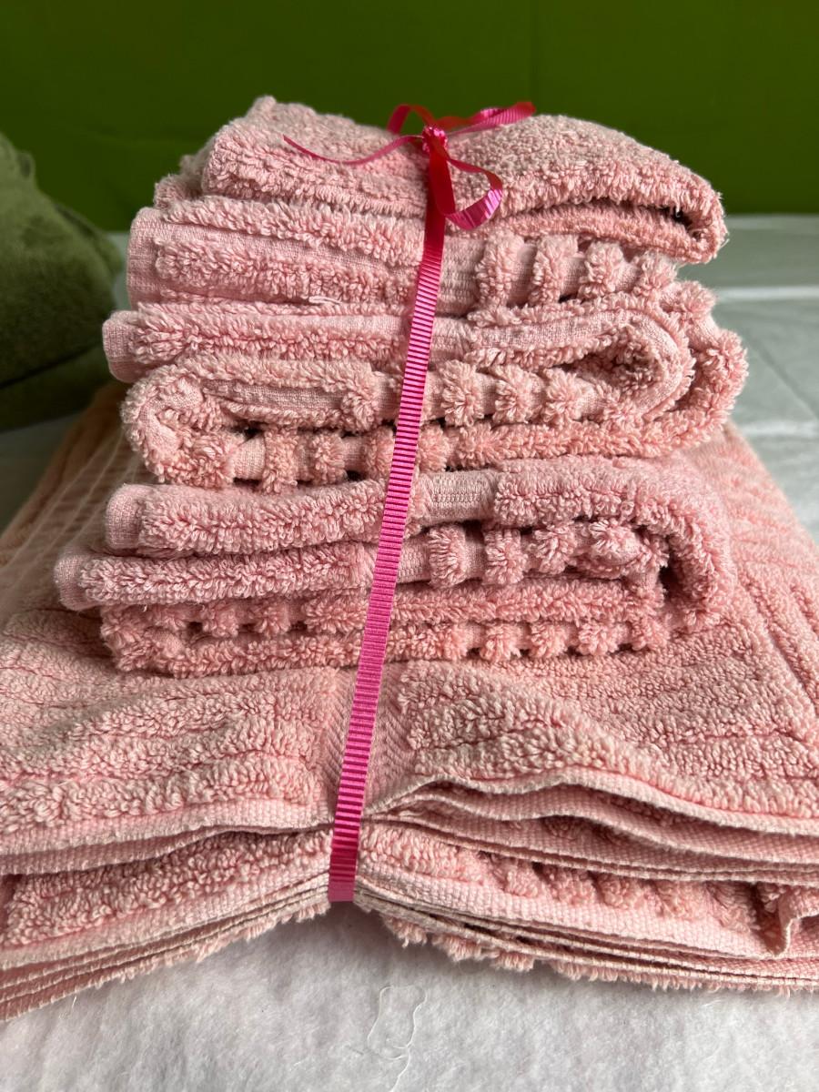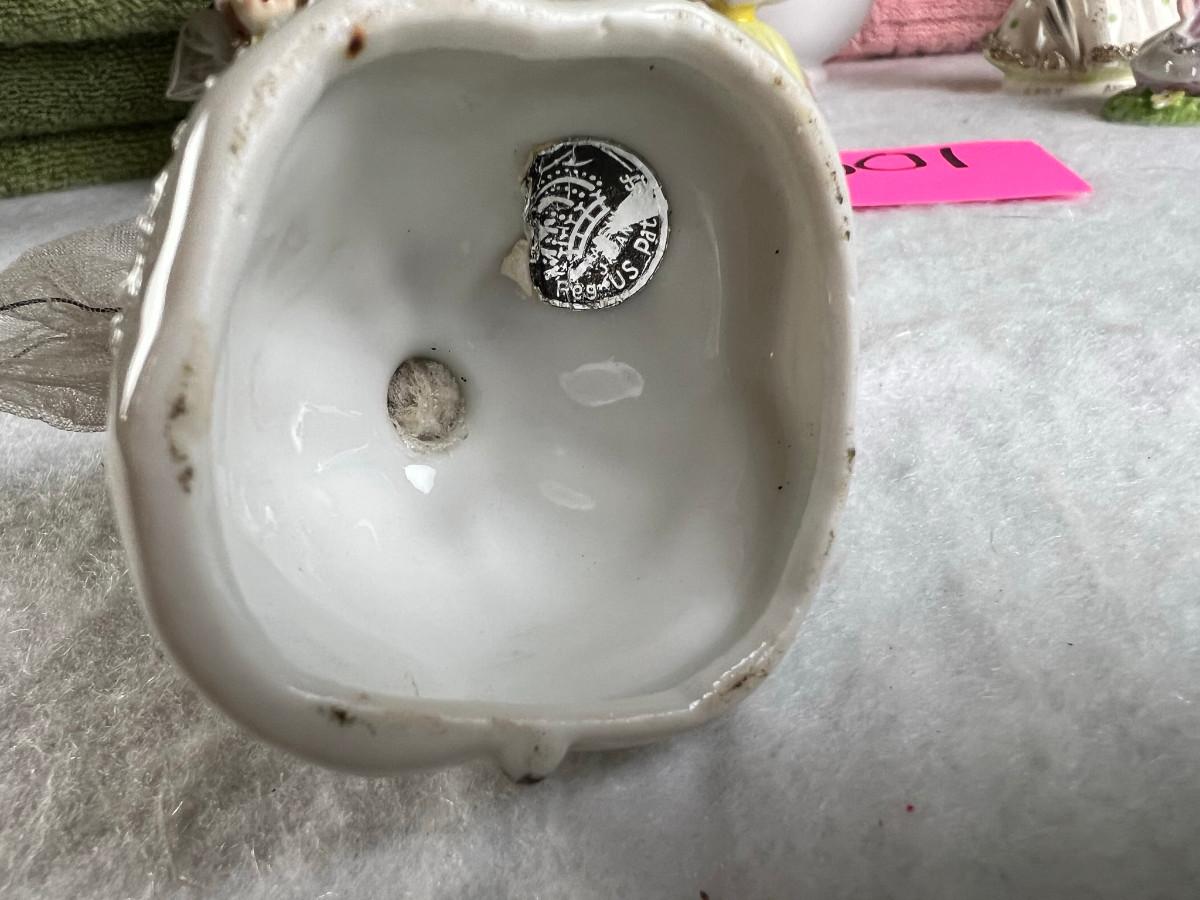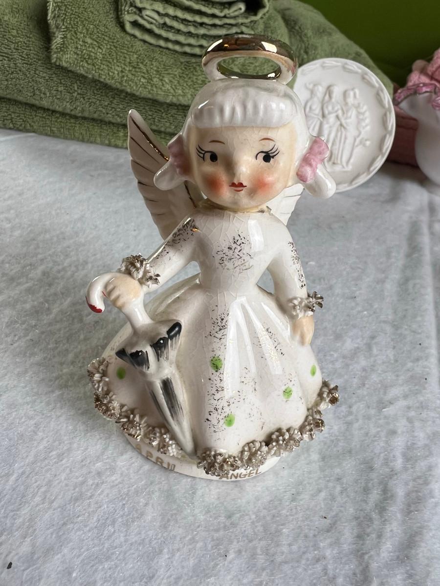 Vintage tall pink glass with lid 10.5" x 2" Marly on bottom, pink and white bowl 4" x 6.5", April Angel neck glued, white dish with 3 women 6.5", large angel Josef original 5" x 3.5", medium angel 4" x 2.5", small angel 3" x 2" 2 sets of towels 1. Green Charisma Luxury (2 bath, 1 hand, 2 wash) 2. Pink Colormate supreme field Crest (1 bath, 2 hand, 2 wash)