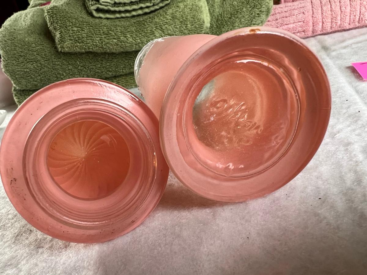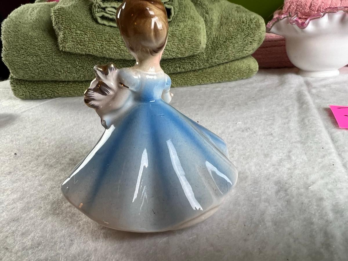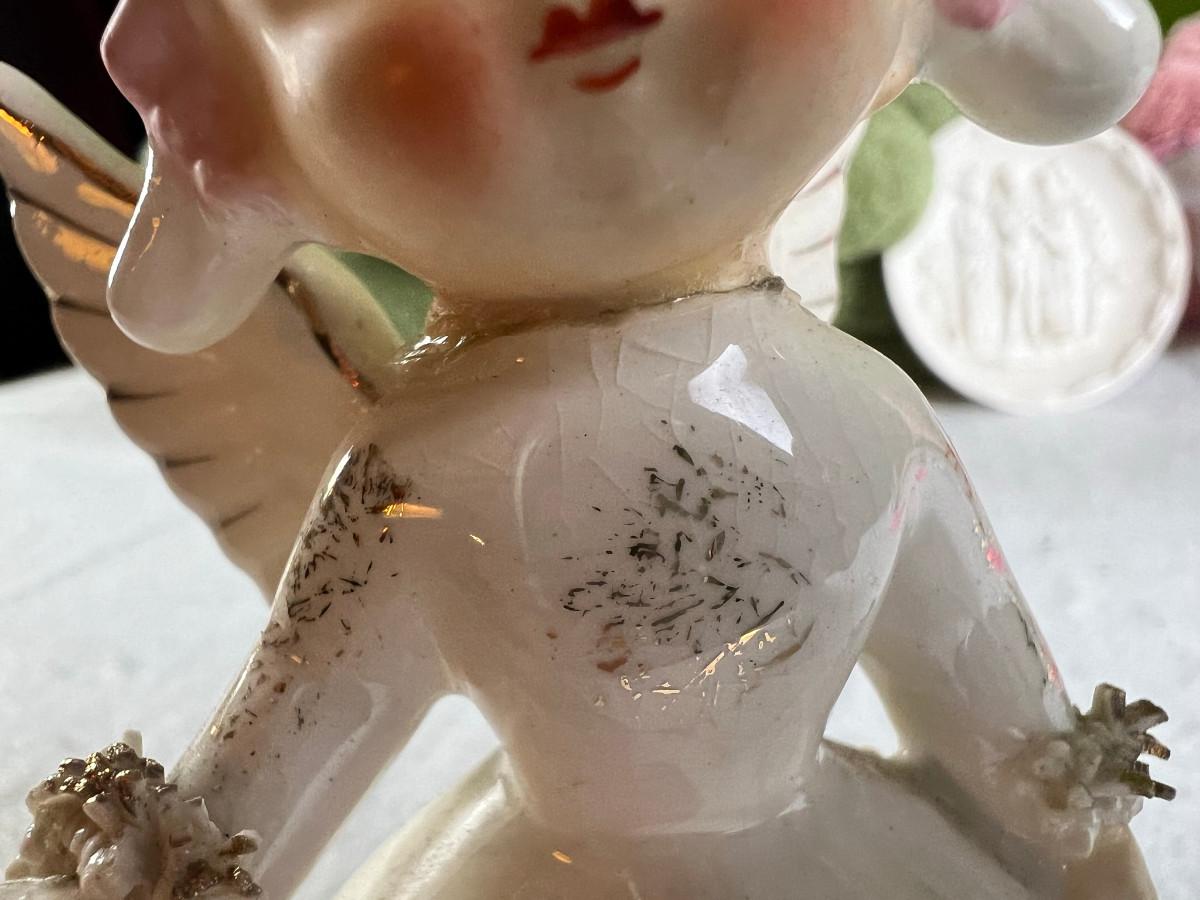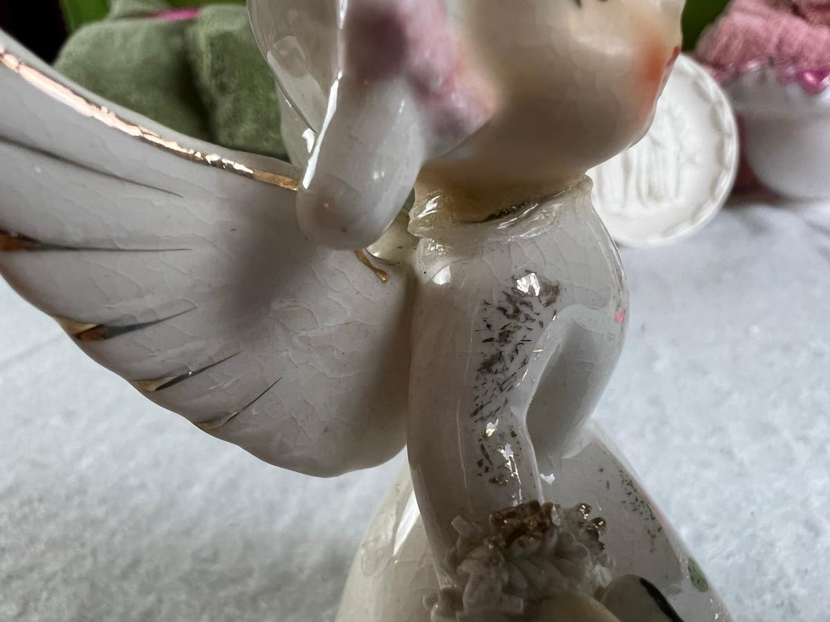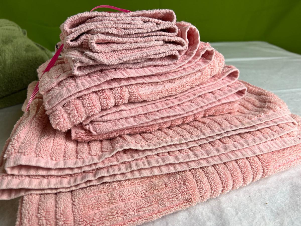 Vintage tall pink glass with lid 10.5" x 2" Marly on bottom, pink and white bowl 4" x 6.5", April Angel neck glued, white dish with 3 women 6.5", large angel Josef original 5" x 3.5", medium angel 4" x 2.5", small angel 3" x 2" 2 sets of towels 1. Green Charisma Luxury (2 bath, 1 hand, 2 wash) 2. Pink Colormate supreme field Crest (1 bath, 2 hand, 2 wash)