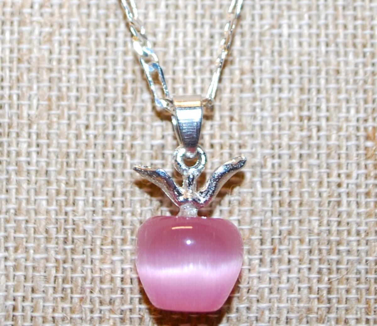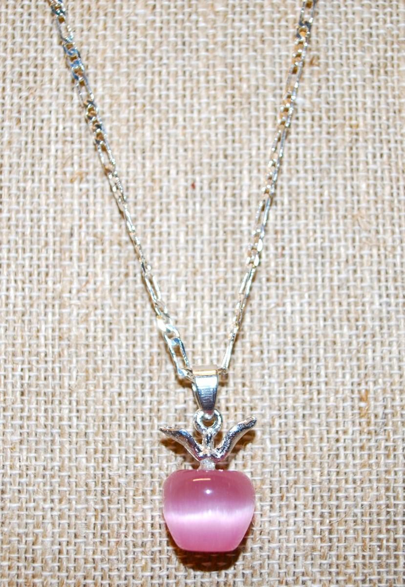 Pink Apple PENDANT (1") on a Glittery Silver Tone Necklace Chain 20" L