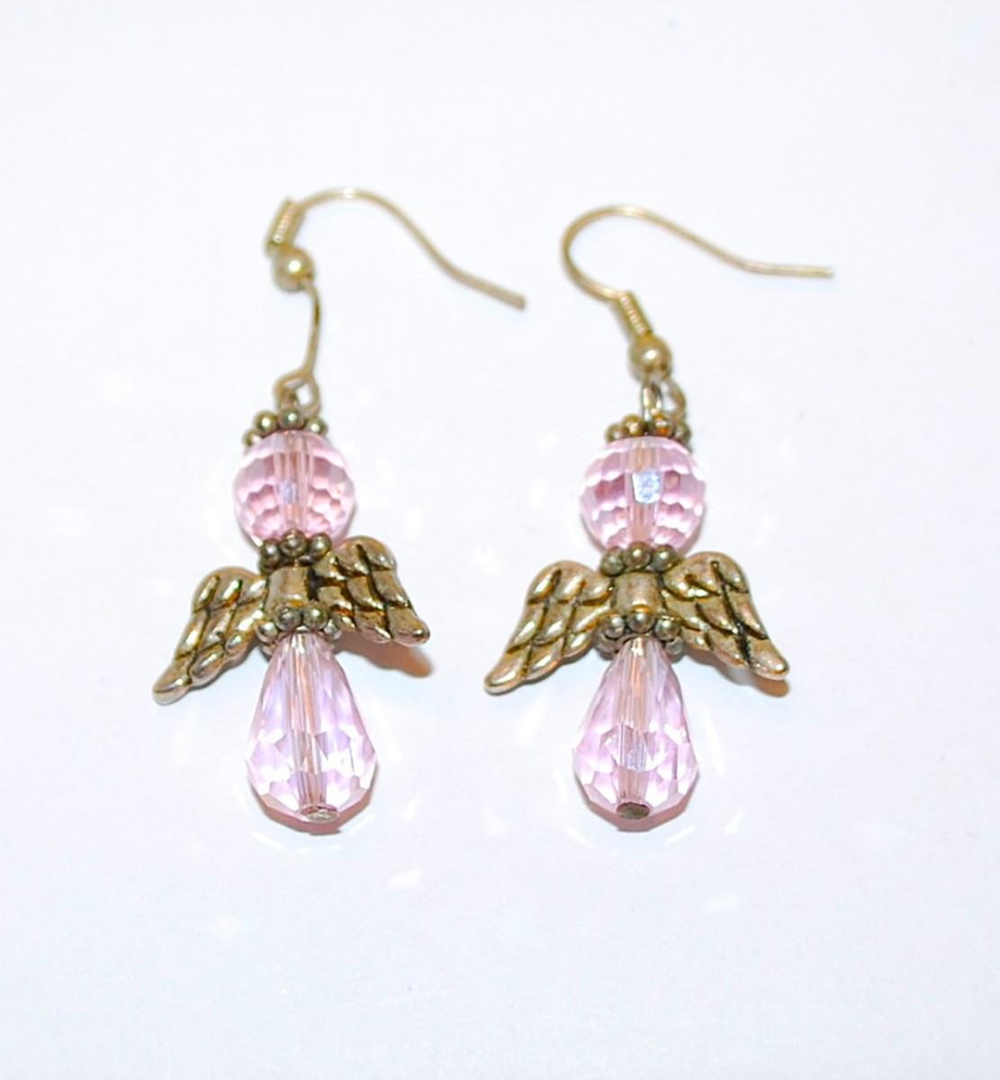 Pink Beads "ANGEL" EARRINGS Set with Metal "Wings" and a Wire Hook Clasp
