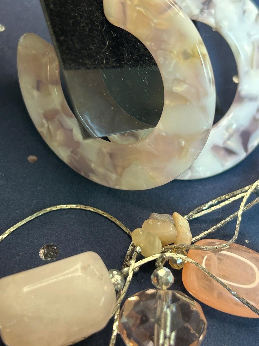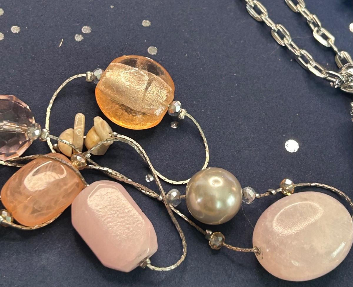The long necklace has rose quartz & beads, the bracelets are Alex & Ani. All earrings are pierced.