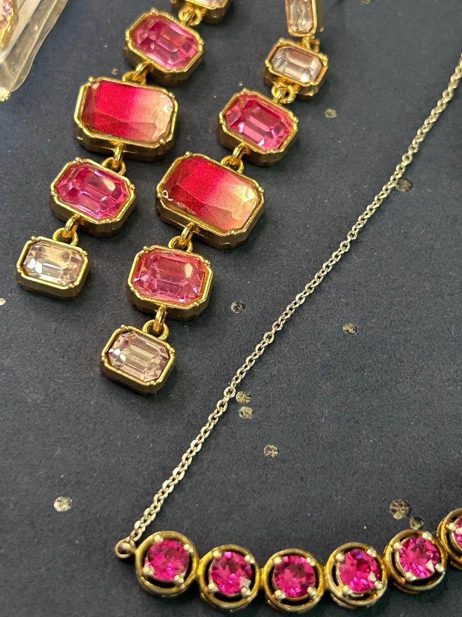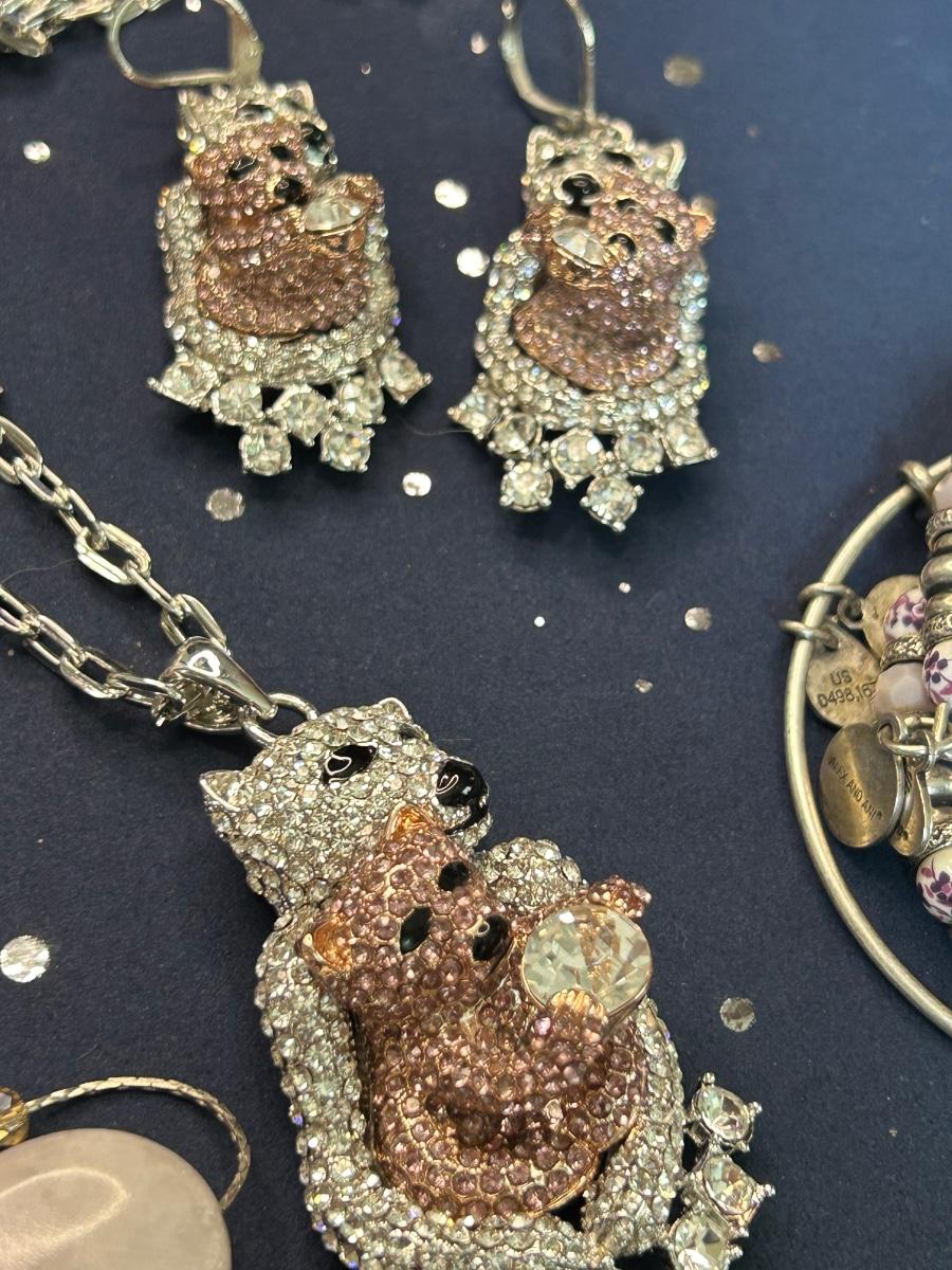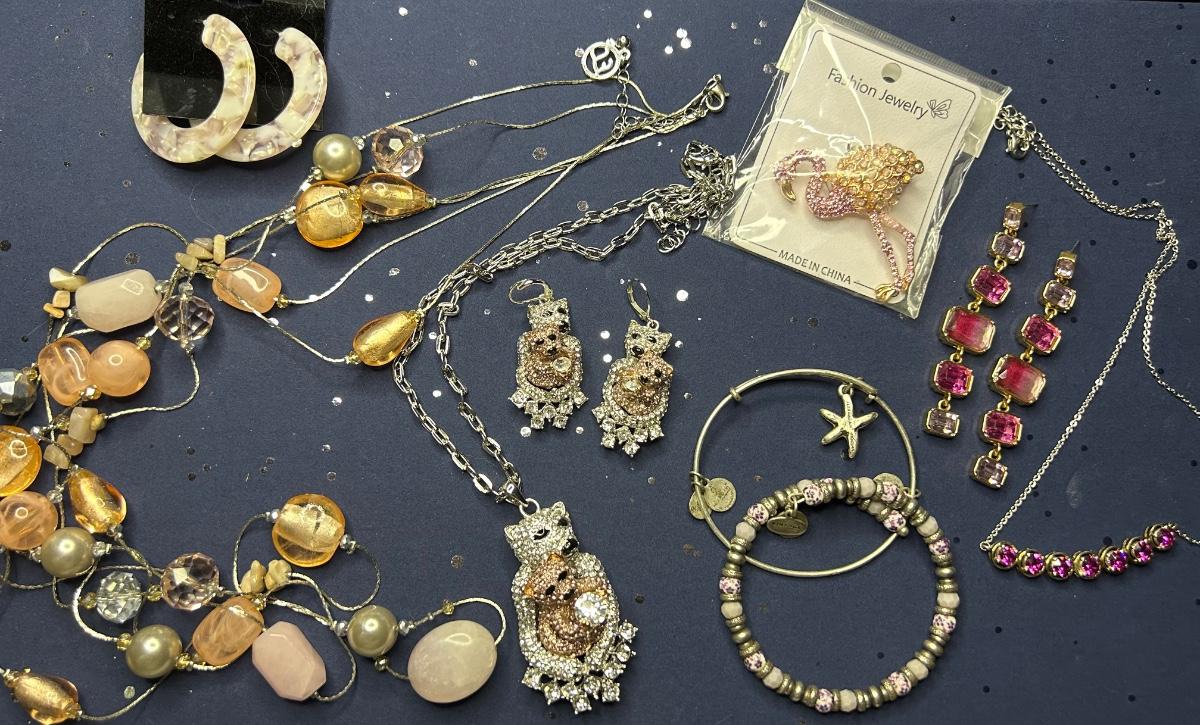 The long necklace has rose quartz & beads, the bracelets are Alex & Ani. All earrings are pierced.