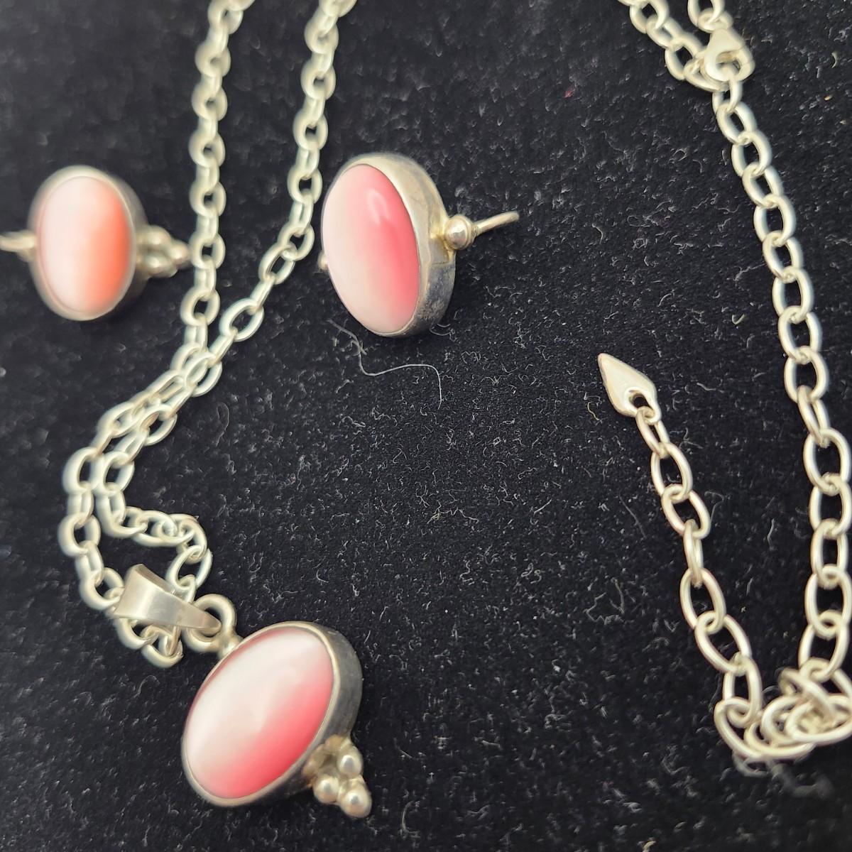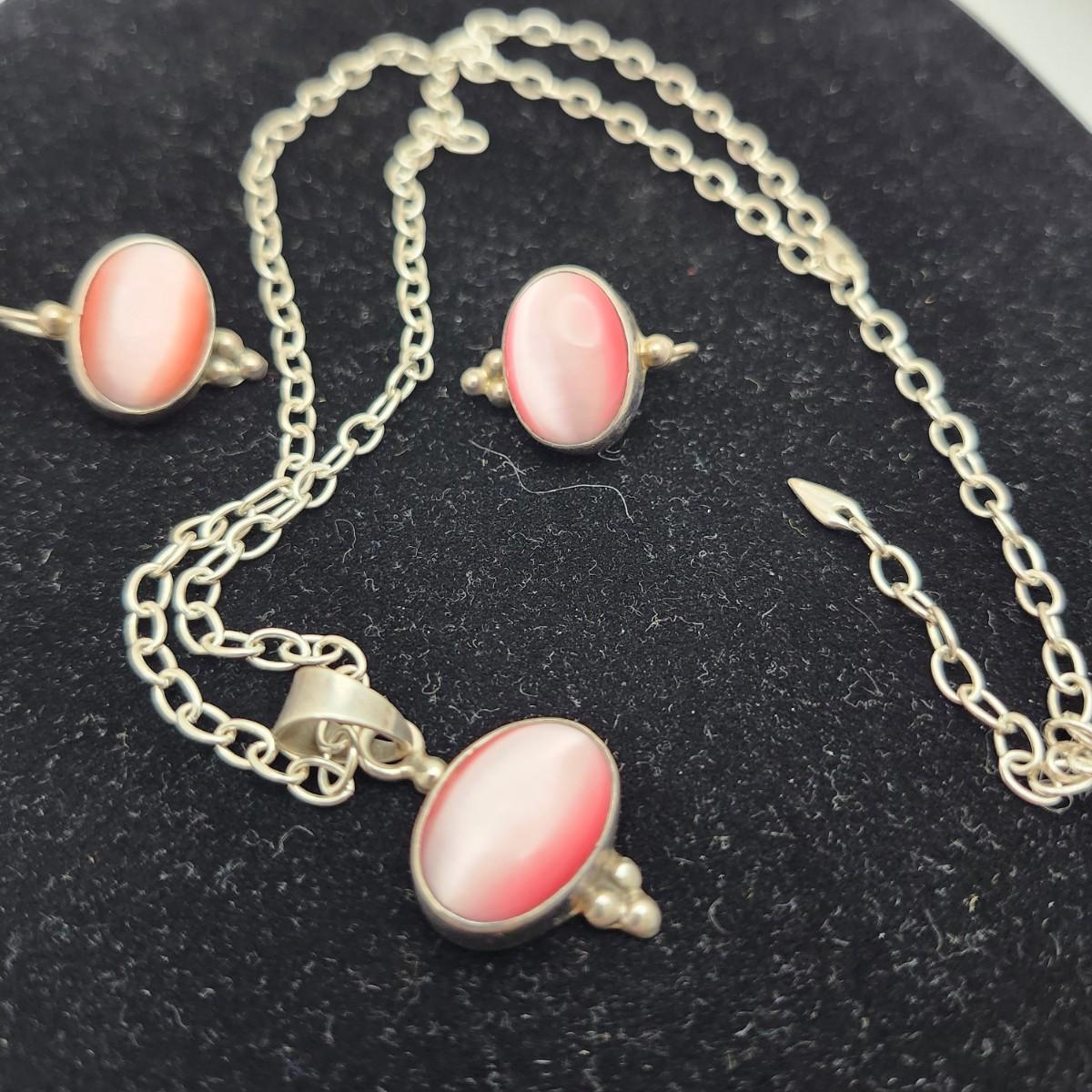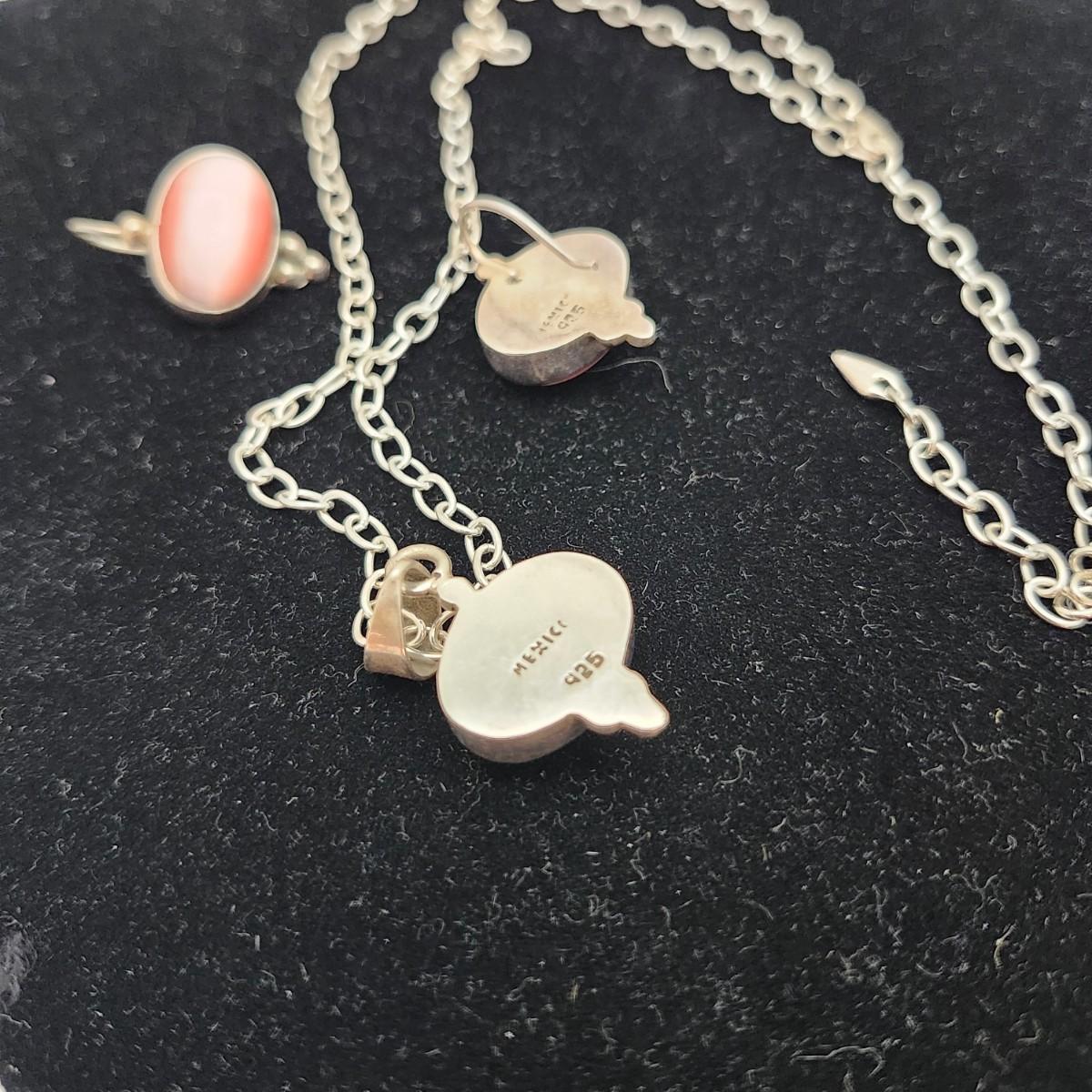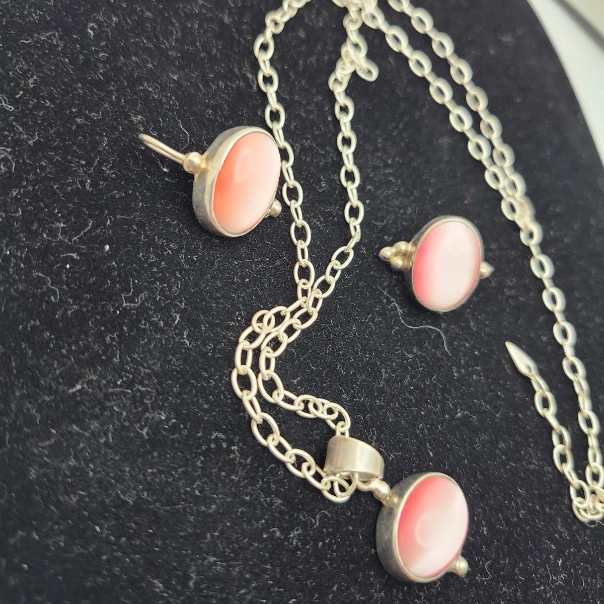 The pendant is on a 21 inch 925 chain, the earrings are french hook.
