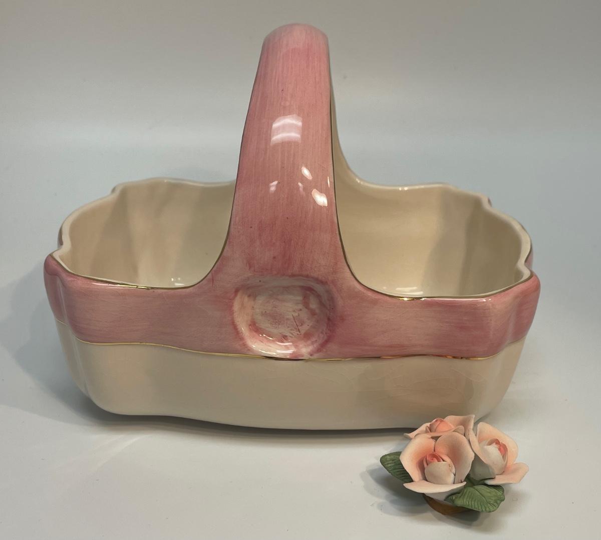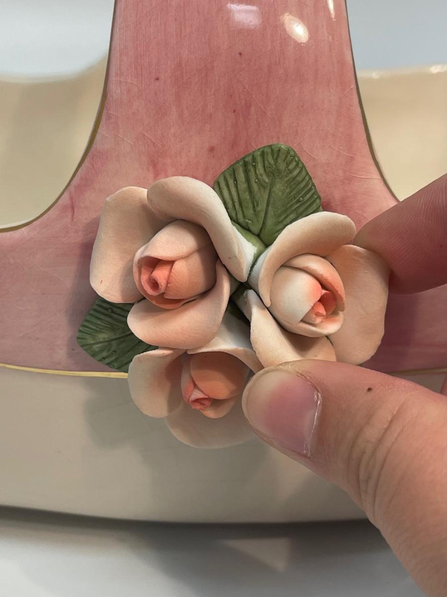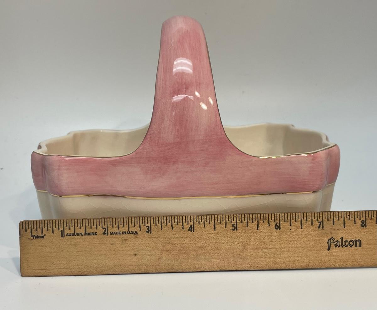The basket is in good condition. The bottom has some discoloration. On one side of the basket, the rose fell off but it can be glued on easily. The item is approximately 7” long and made in China.