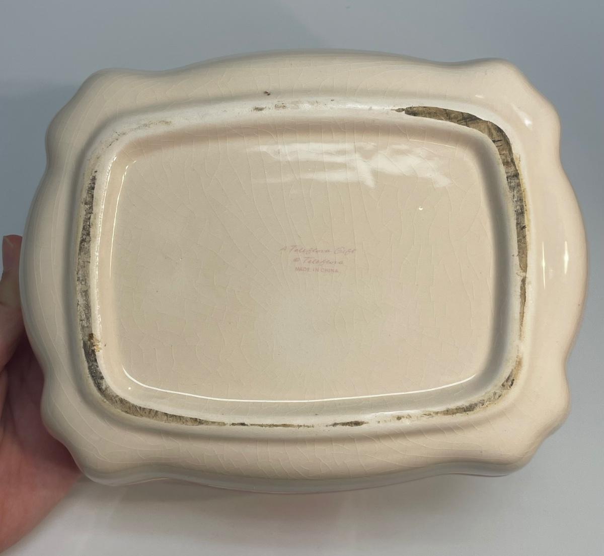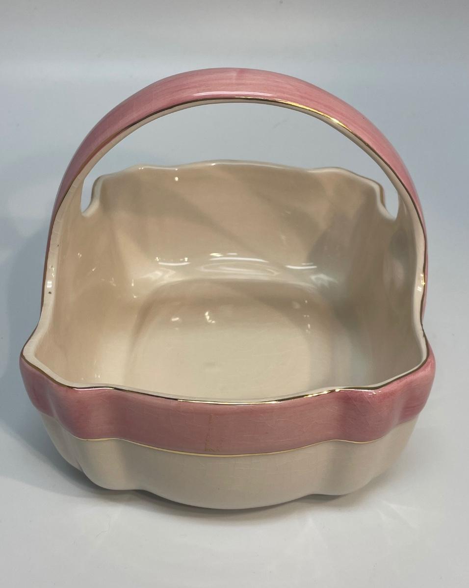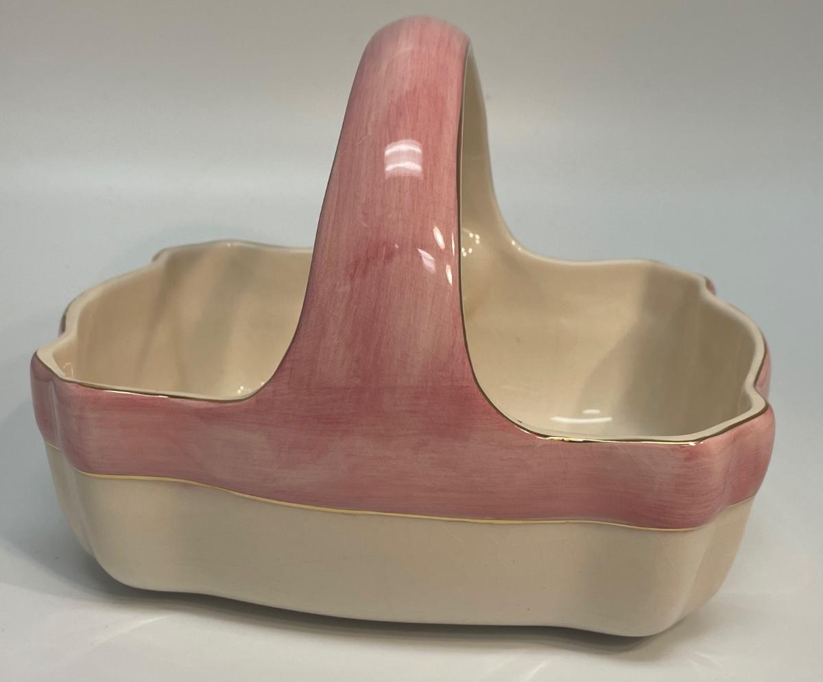 The basket is in good condition. The bottom has some discoloration. On one side of the basket, the rose fell off but it can be glued on easily. The item is approximately 7” long and made in China.