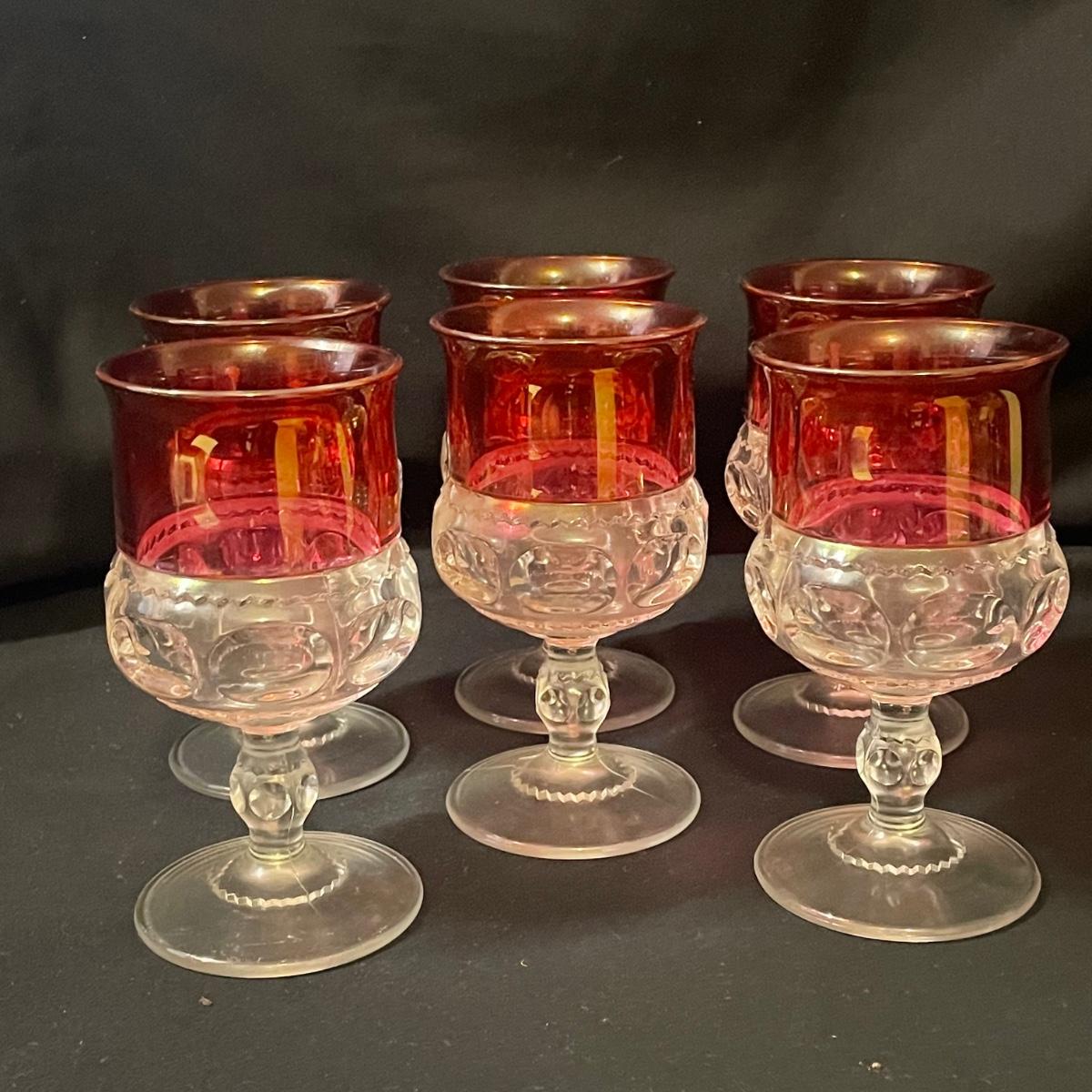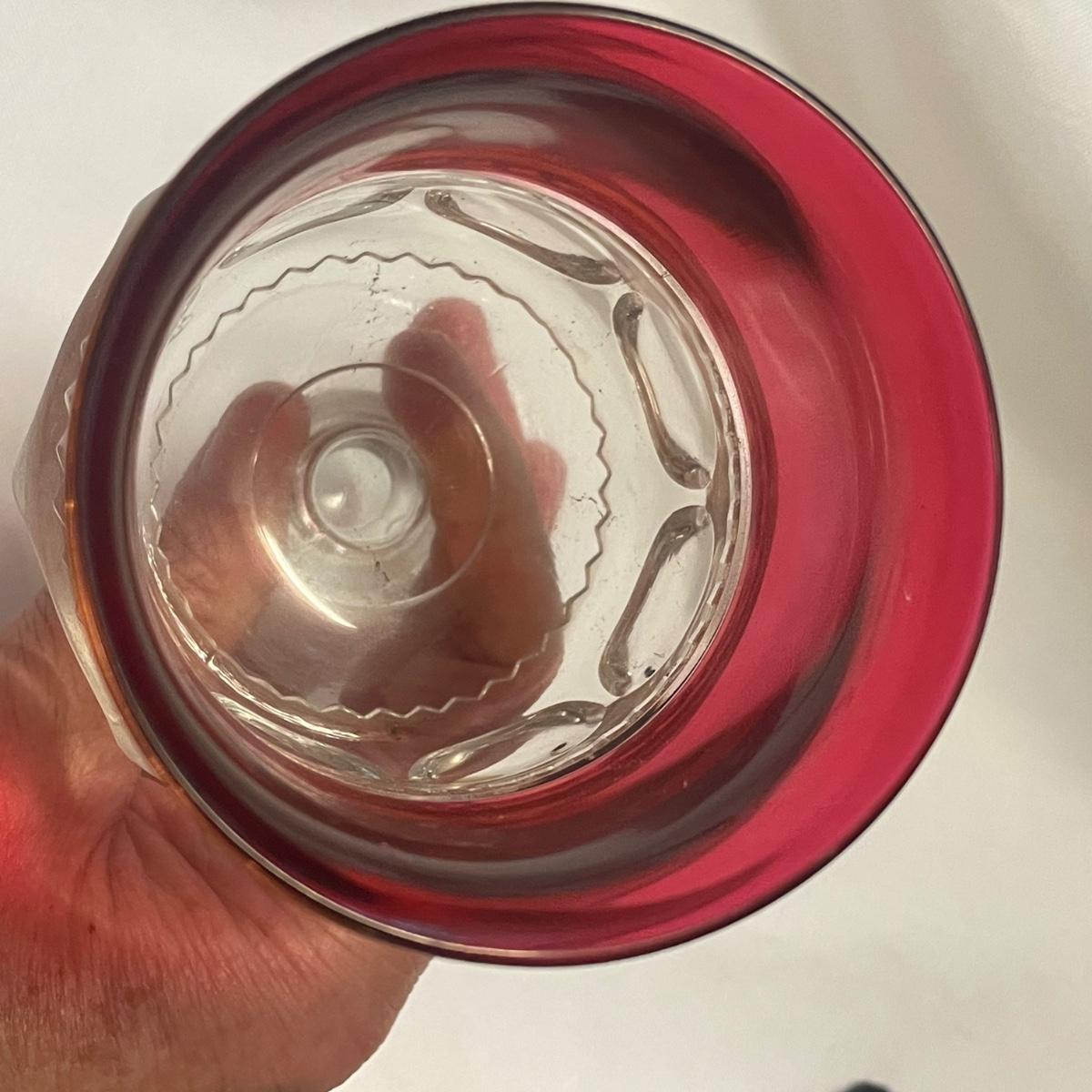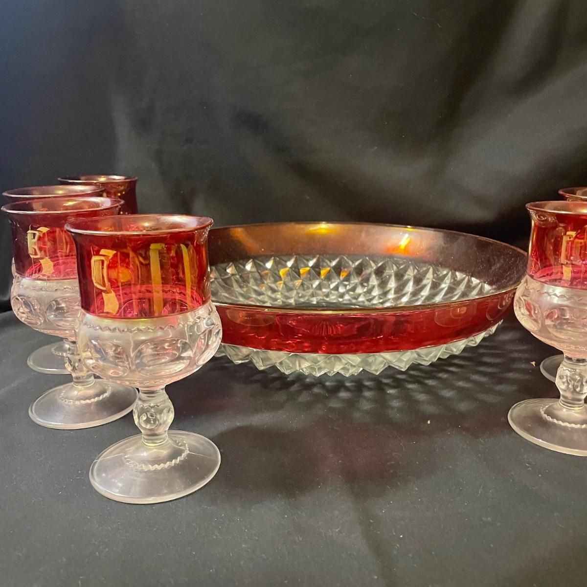 This pretty set of formed clear glass has a pink upper section of the 6 stemmed glasses and large bowl. The glasses are in very good condition, the bowl has some light scratch marks.