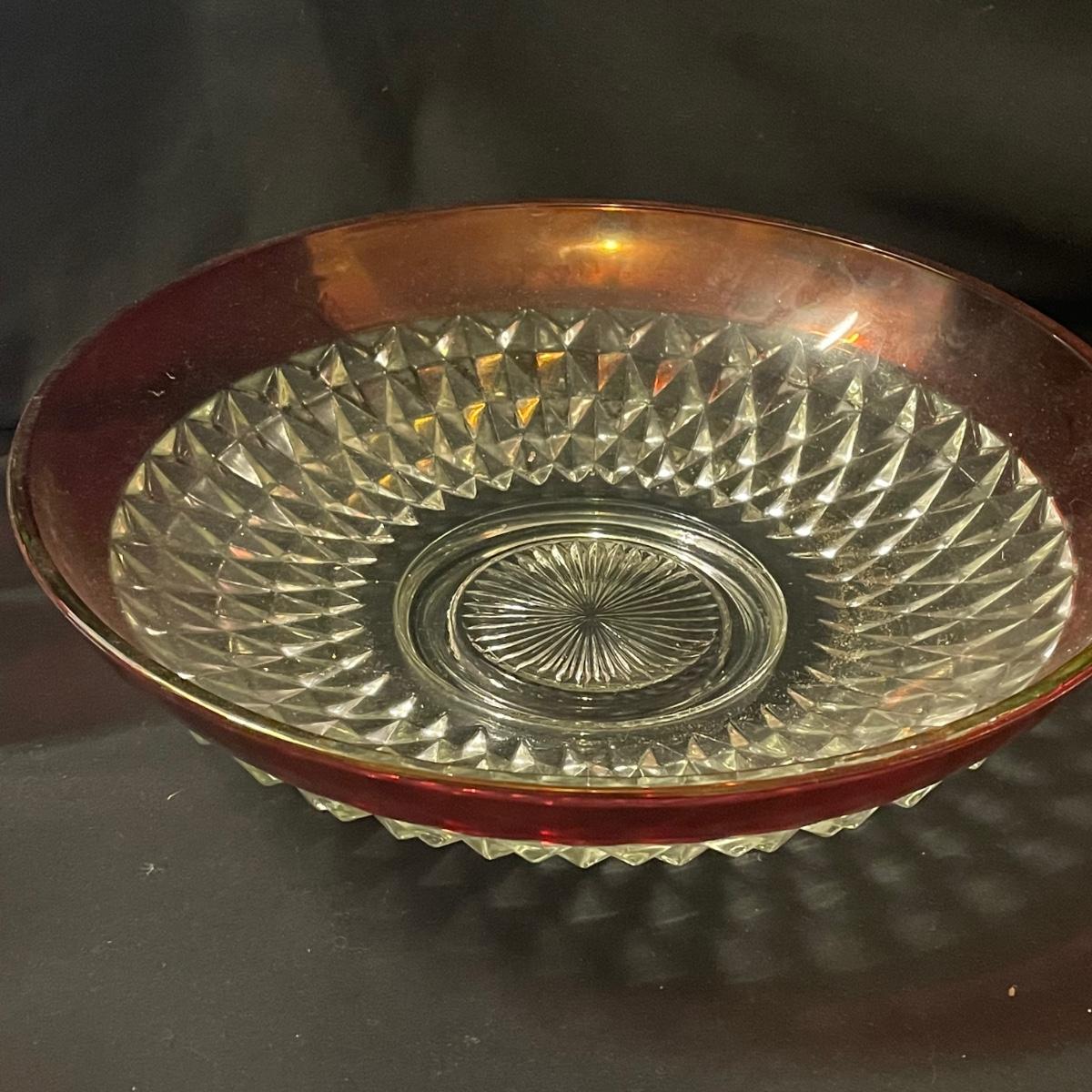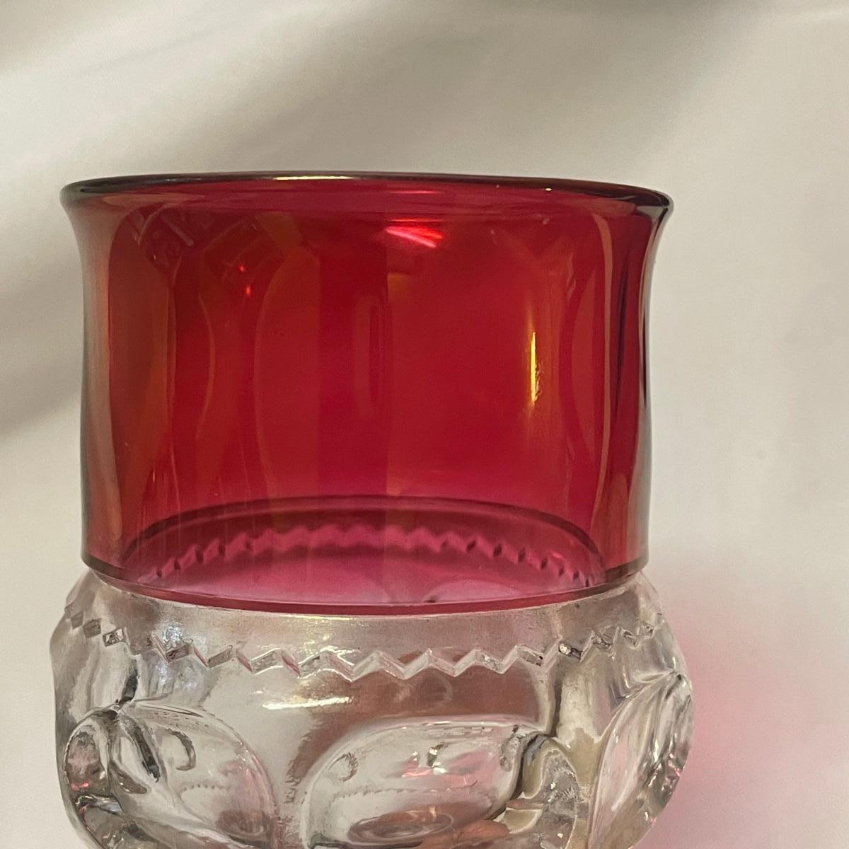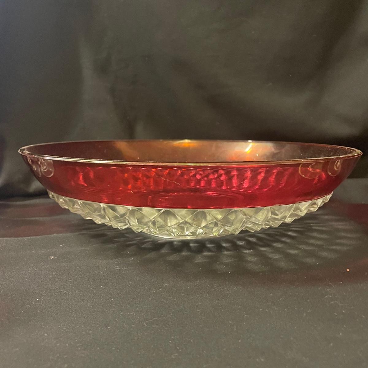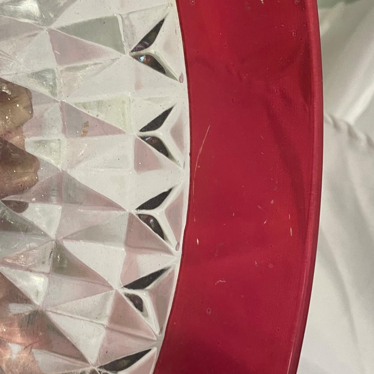 This pretty set of formed clear glass has a pink upper section of the 6 stemmed glasses and large bowl. The glasses are in very good condition, the bowl has some light scratch marks.