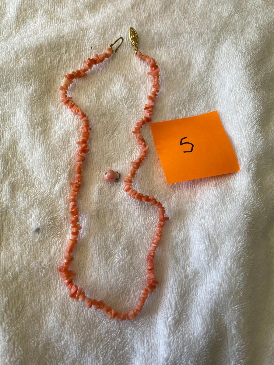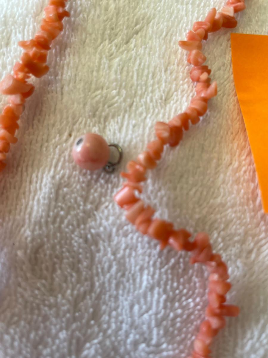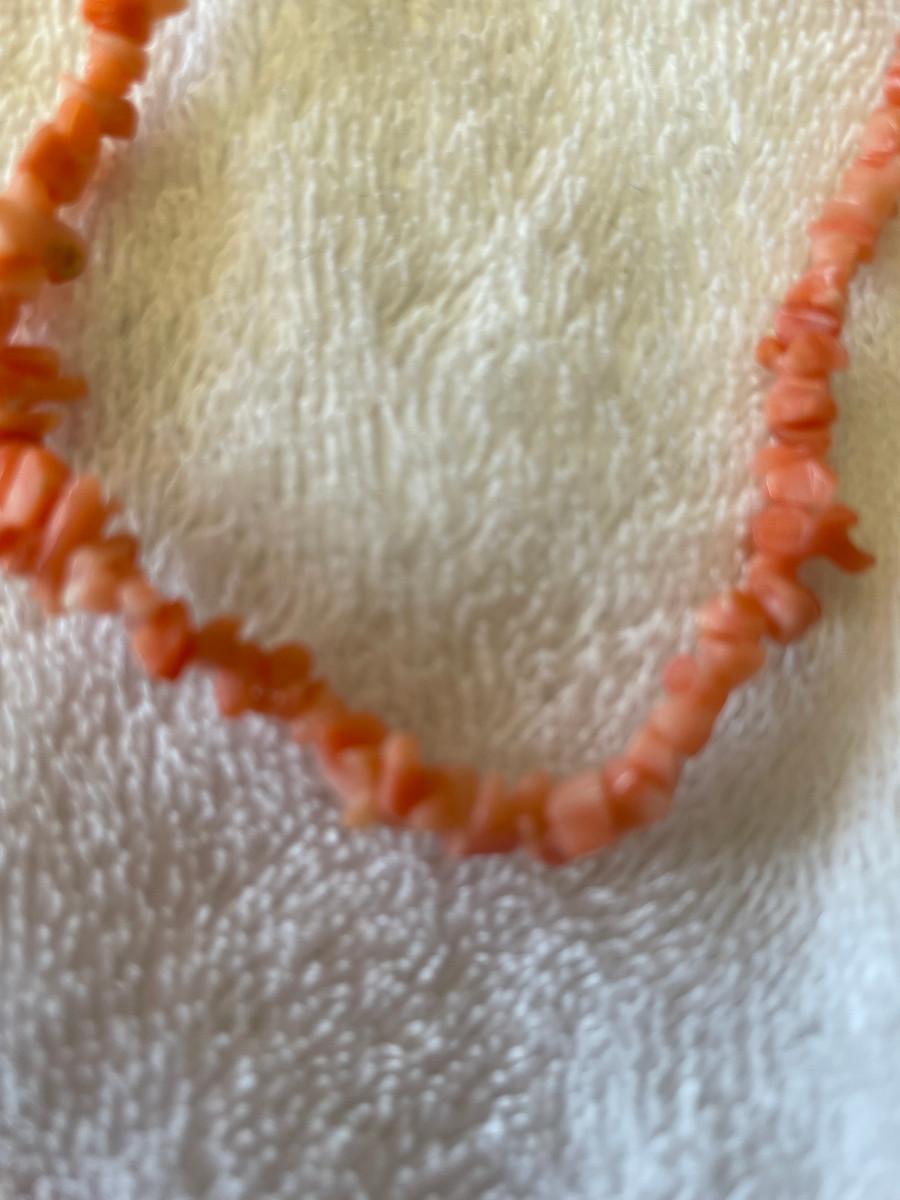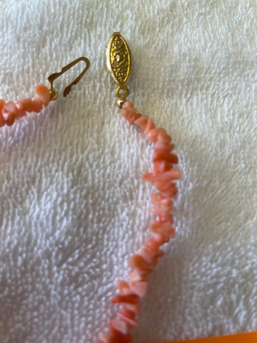 18" long. Coral necklace needs re-strung. Gold plated clasp. Coral is in good shape.