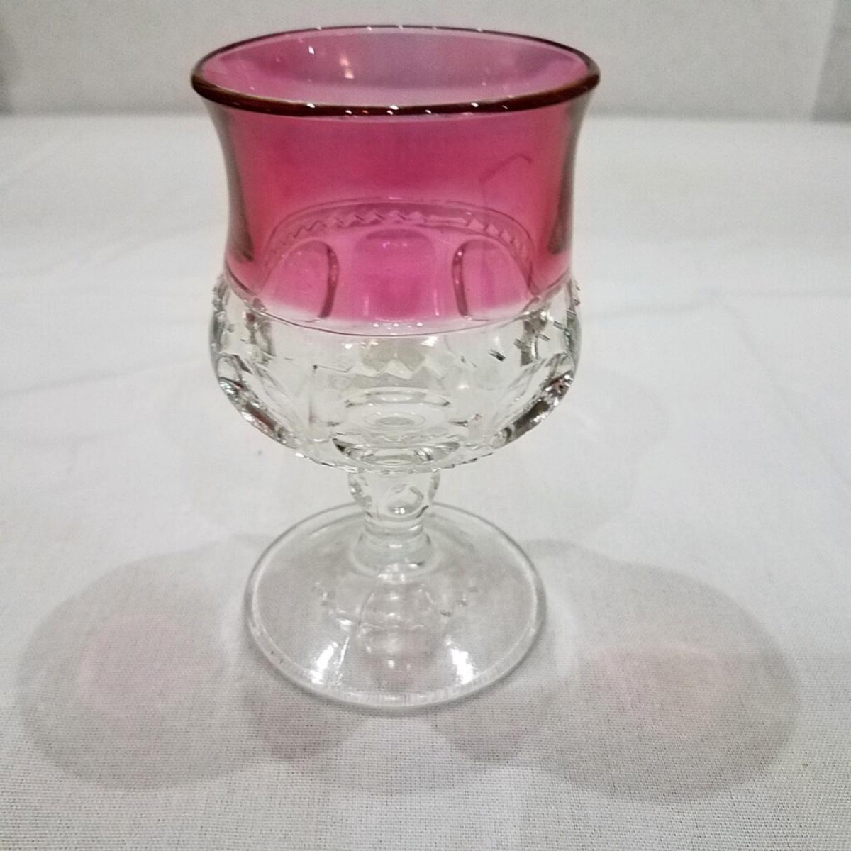 Set of 6 vintage Tiffin Franciscan Kings Crown Ruby flashed thumbprint cordial glasses. Approx 4-1/2w x 2-1/2h. Excellent condition