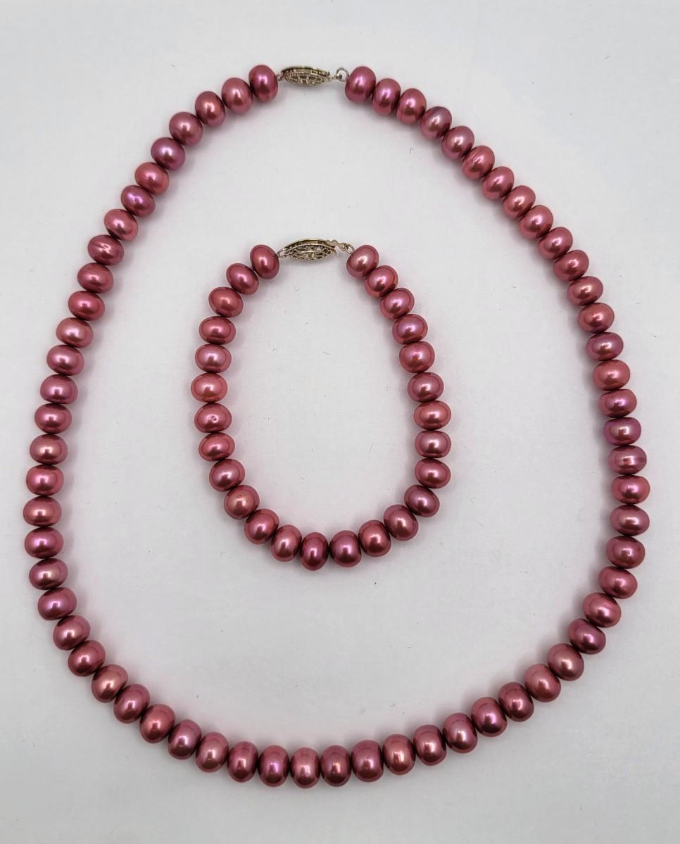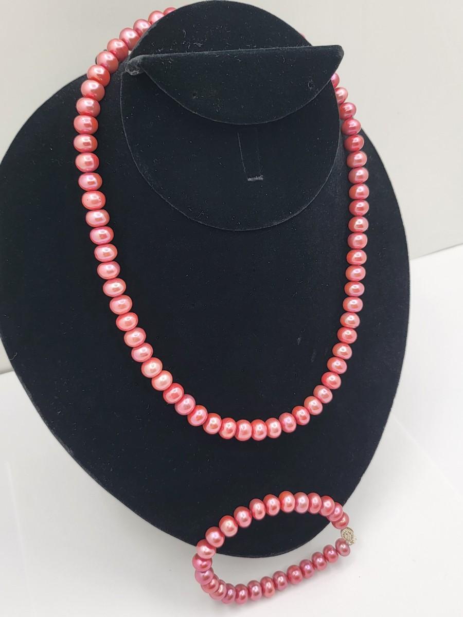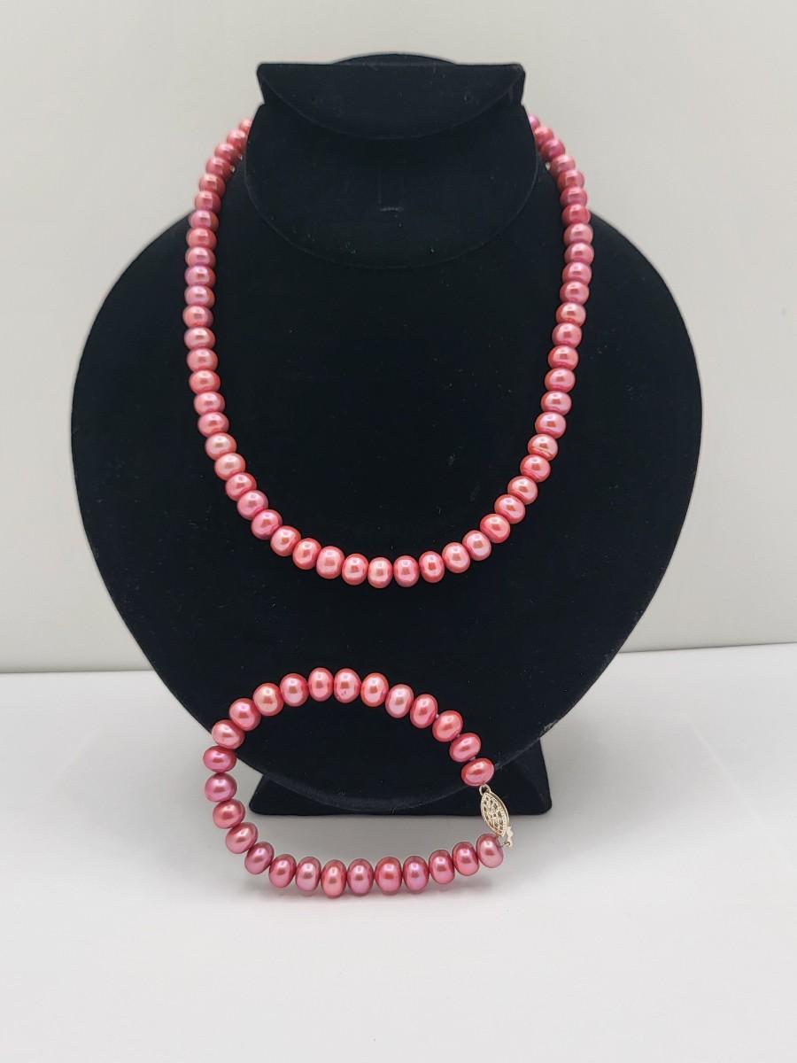 Pretty pink genuine pearls. Necklace is 17" long g and matching bracelet is 7.5" long. Both have 925 filigree clasps. 4-5mm pearls.