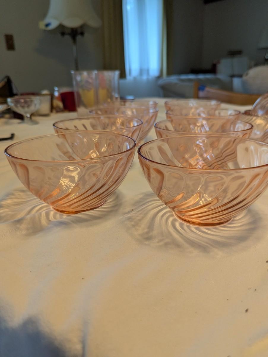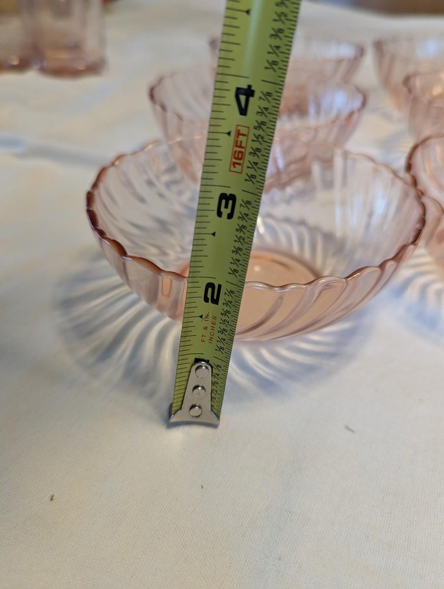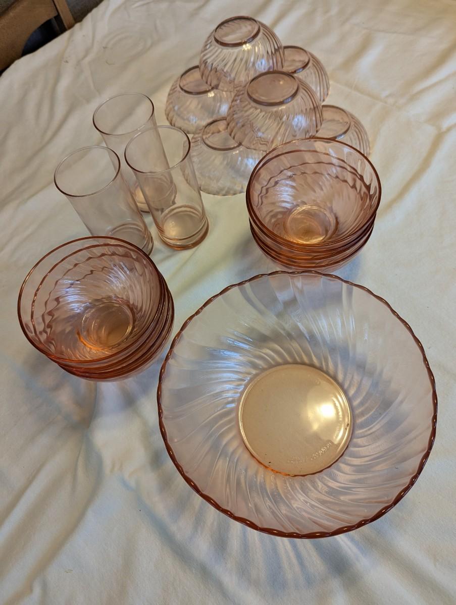 Three pink depression glasses, one Large serving bowl, eight bowls, six dessert bowls.