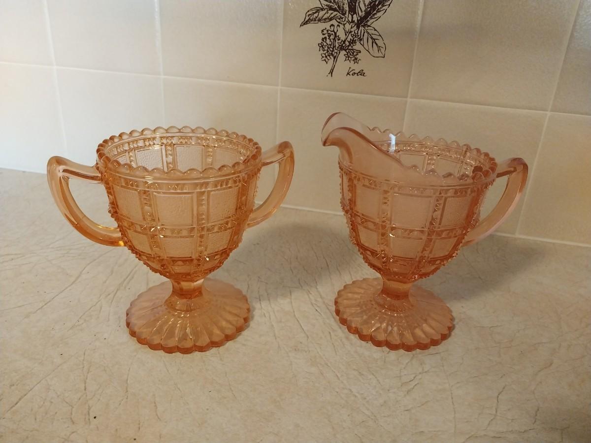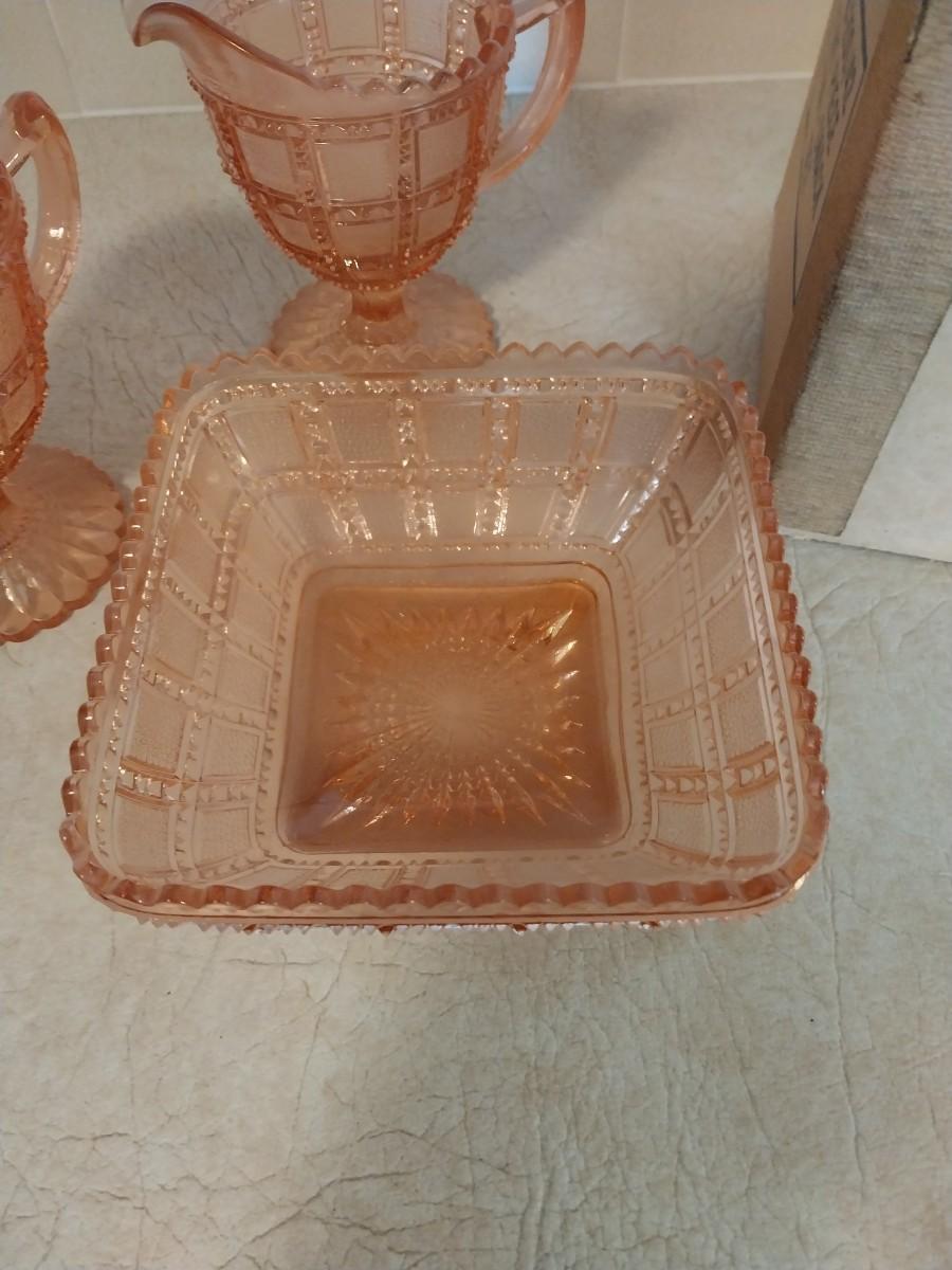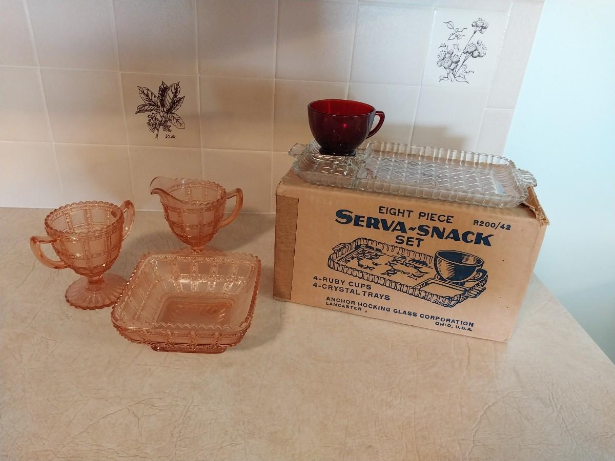 PINK DEPRESSION GLASS CREAM AND SUGAR SET WITH BOWL AND 8 PC SERVA-SNACK SET