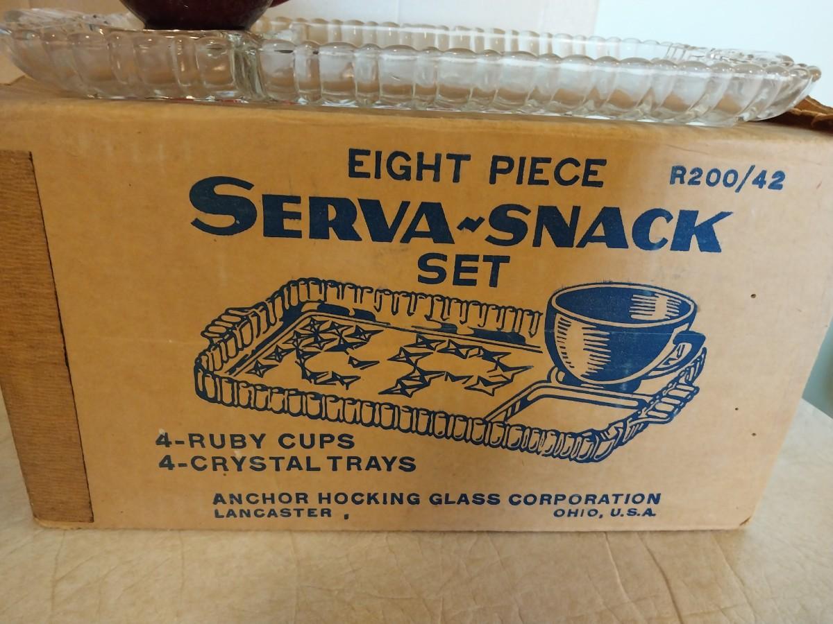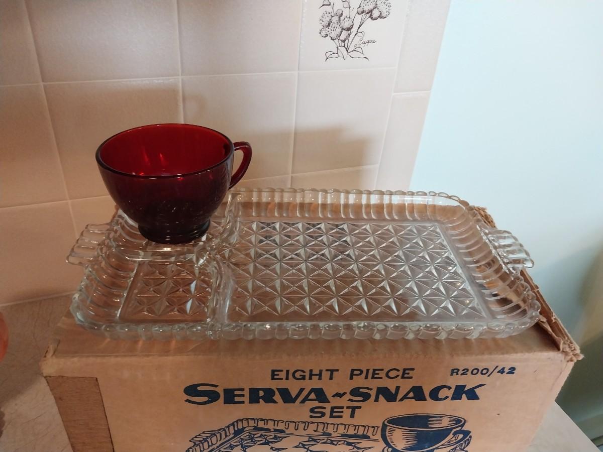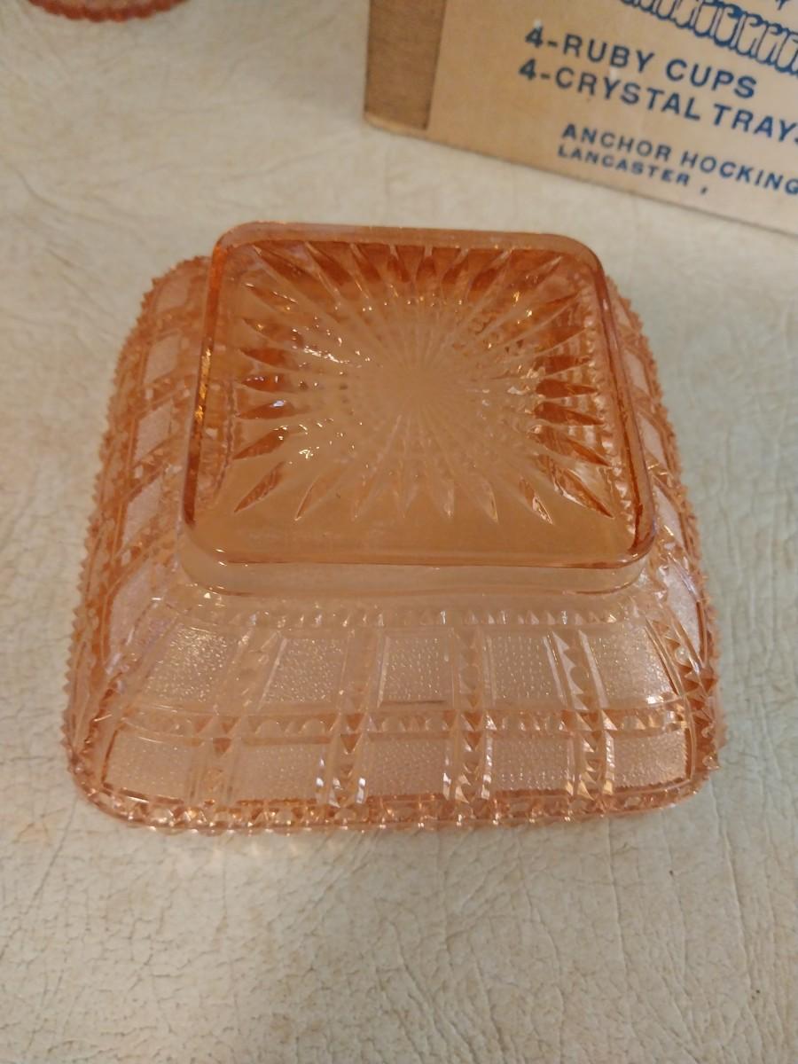 PINK DEPRESSION GLASS CREAM AND SUGAR SET WITH BOWL AND 8 PC SERVA-SNACK SET