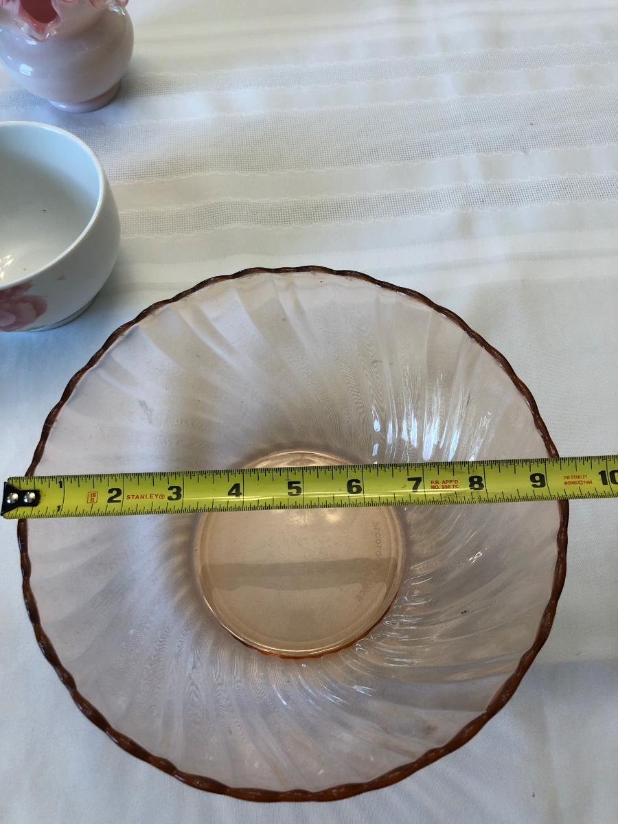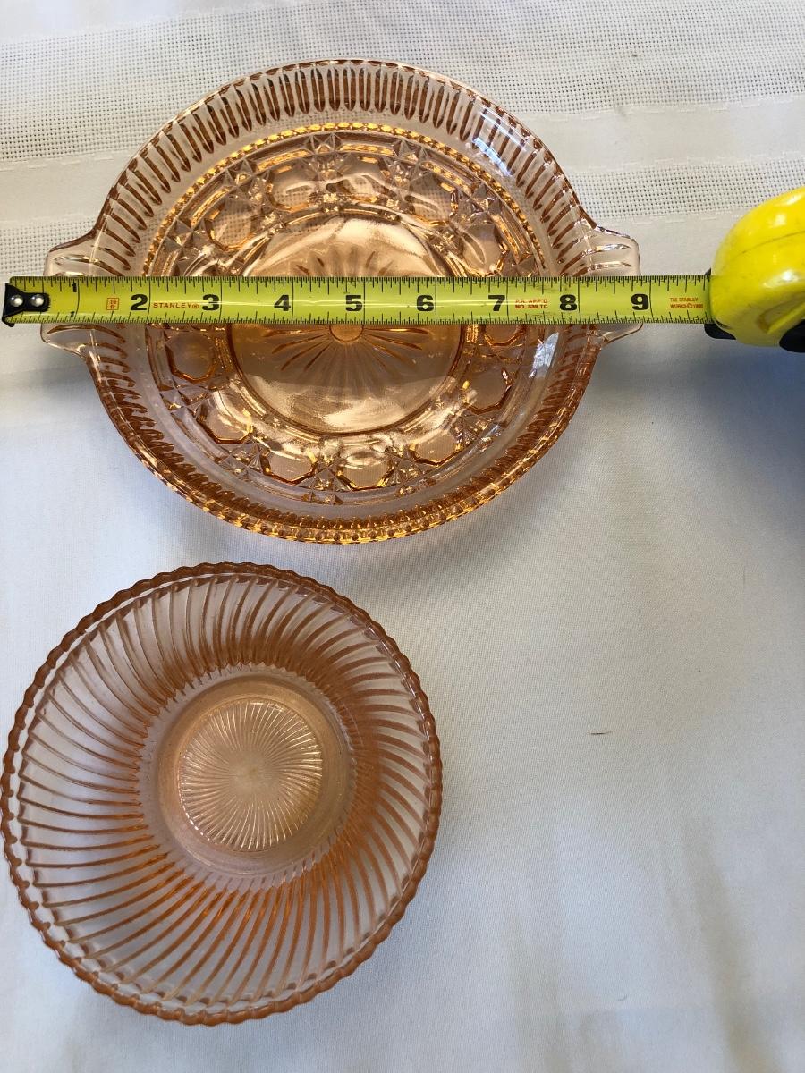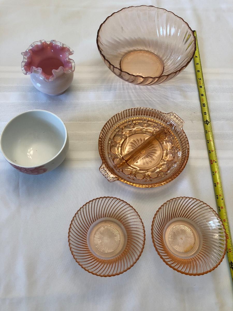 Two pink depression berry bowls, larger pink glass bowl, candy dish, and more. Please see pictures for details.