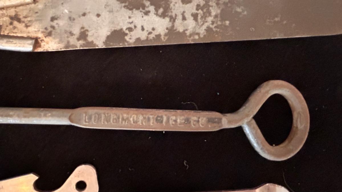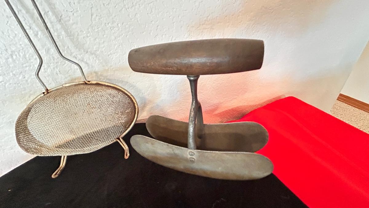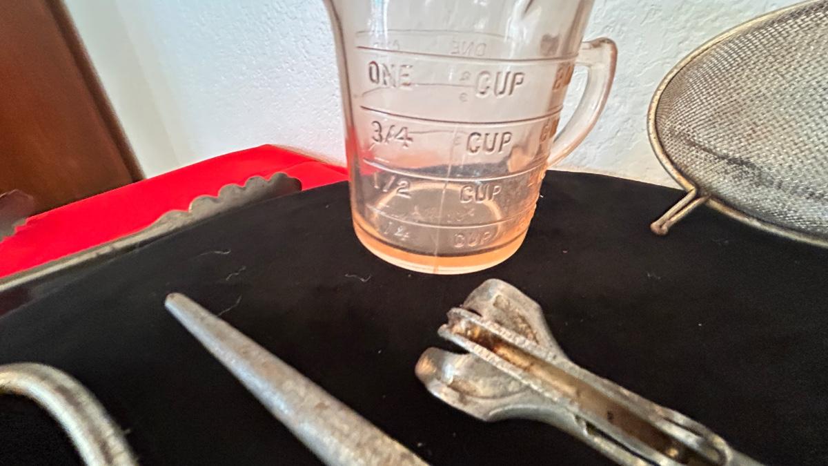 PINK DEPRESSION GLASS LIQUID MEASURING CUP, FORD CO-OPERATIVE TONGS, BOTTLE OPENERS AND MORE