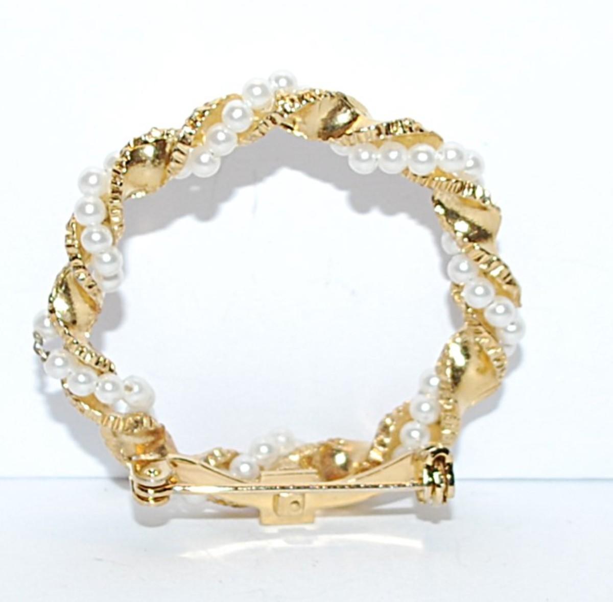 PINK Enameled Swirled Circle BROOCH (1½" Diam.) with Intertwined Faux Pearls & Gold Colored Ribbon