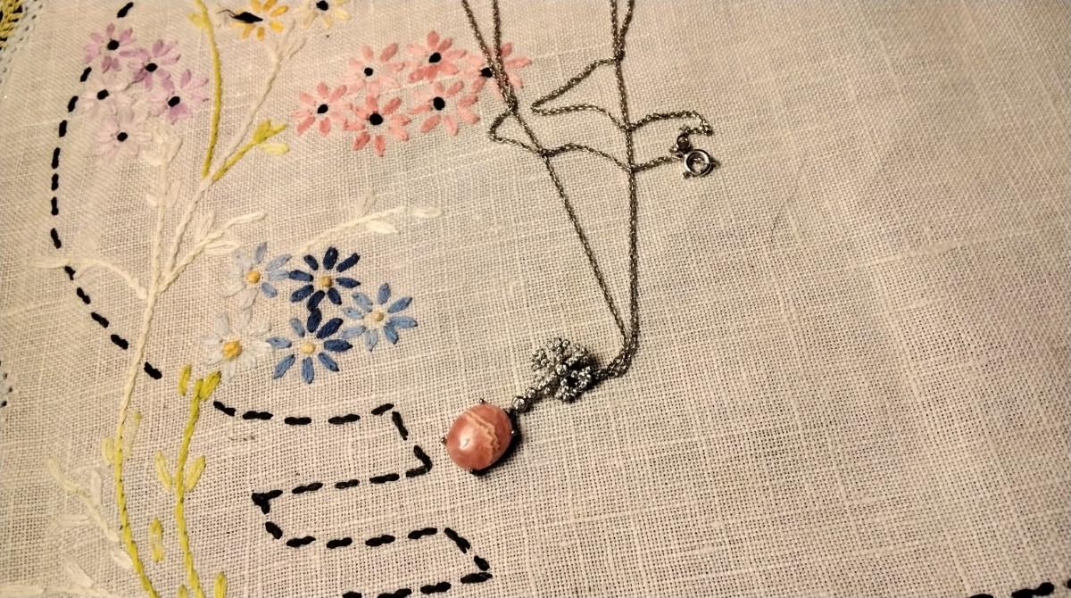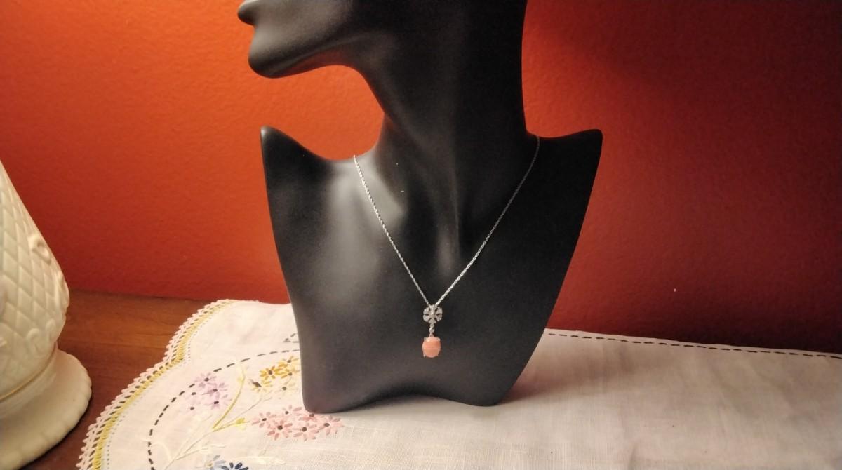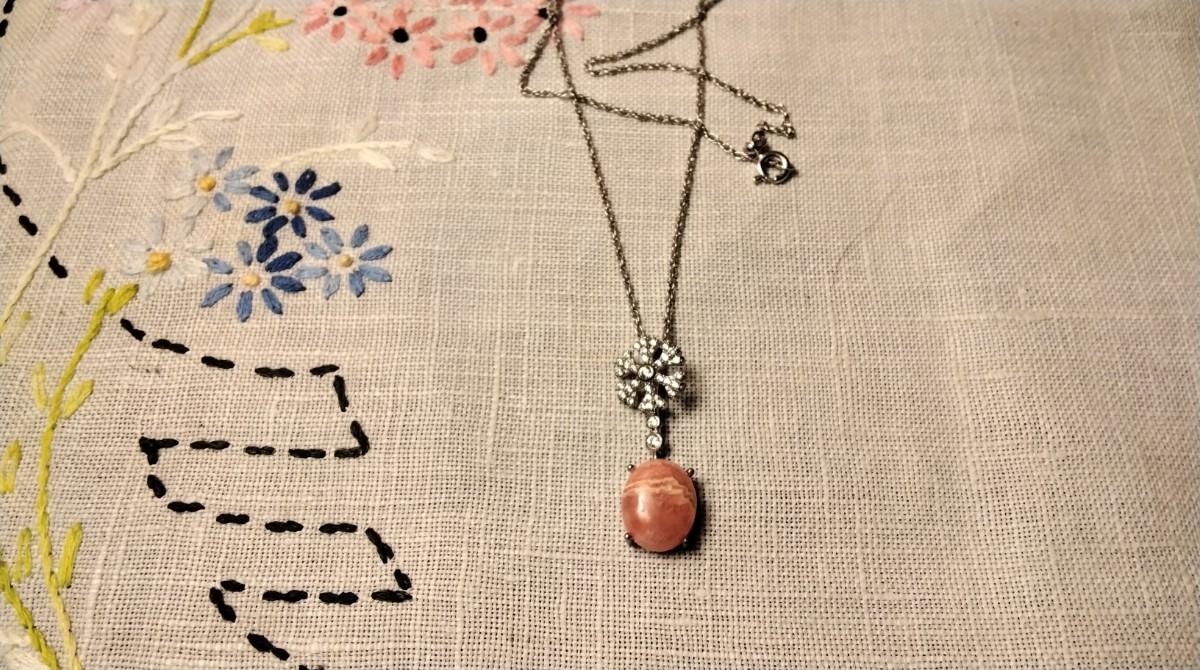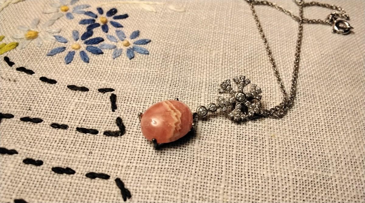 A gorgeous Rhodochrosite surrounded in diamonds. Rhodochrosite opens the heart, lifting depression and encouraging a positive and cheerful outlook. It improves self worth and soothes emotional stress.