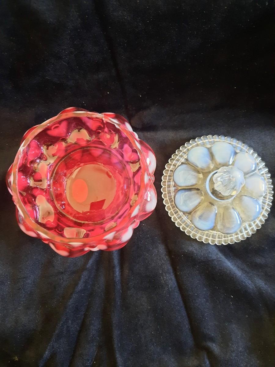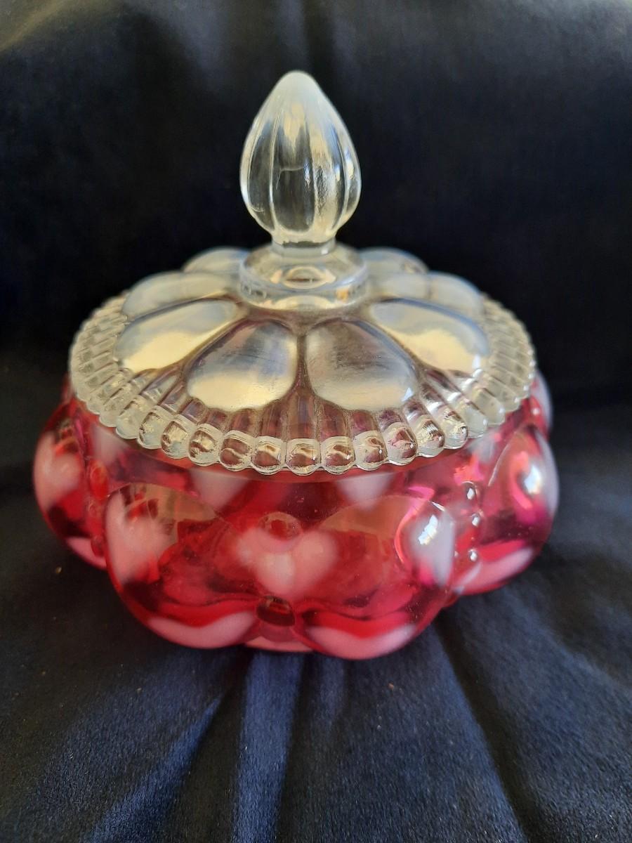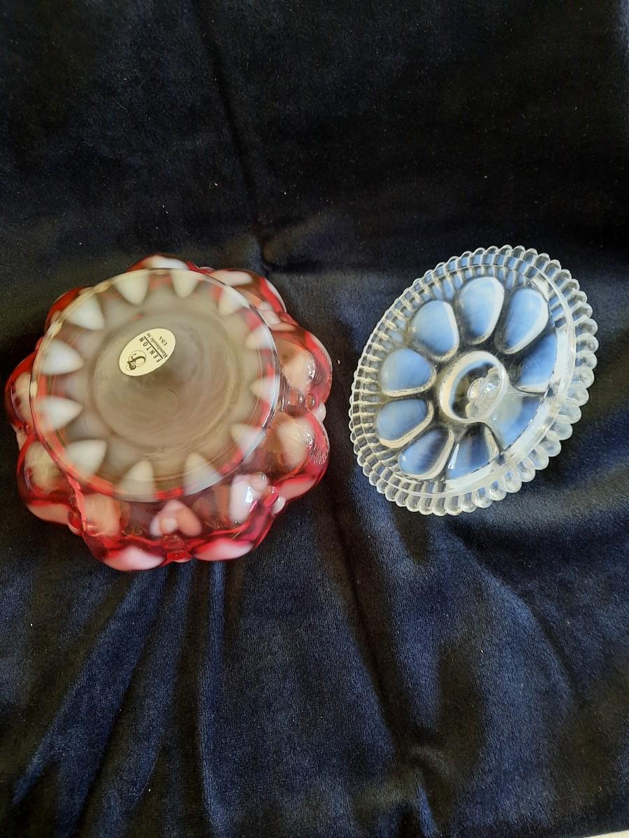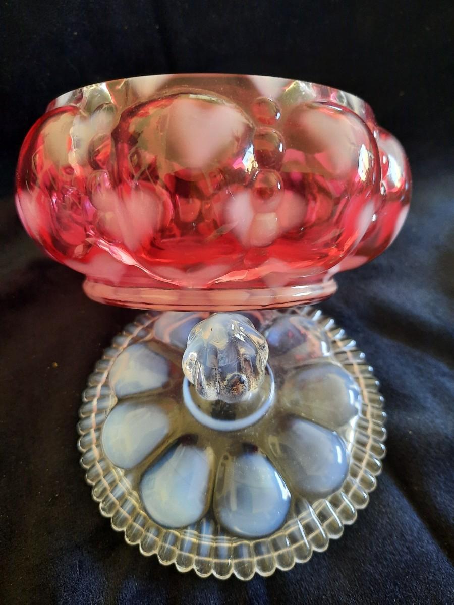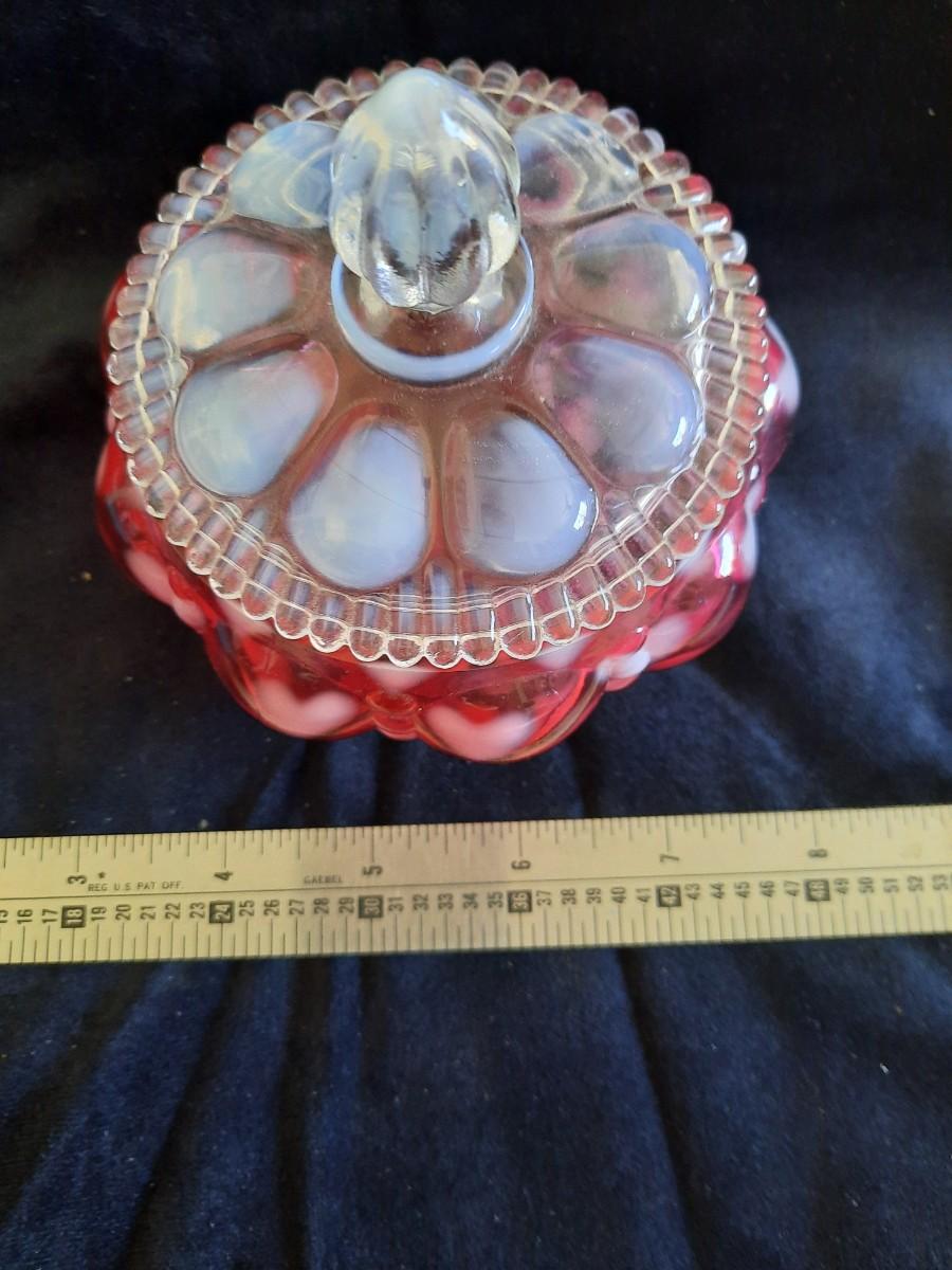 This is a beautiful, pink, clear, and creamy white, lidded Fenton dish. Unfortunately it has been broken and repaired (see pic 4). It also has some chips on the inside edge.