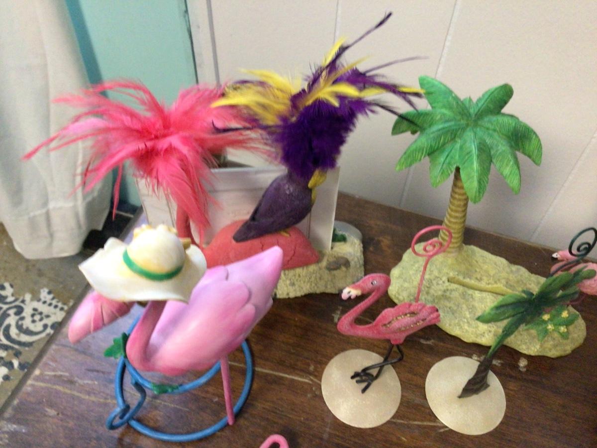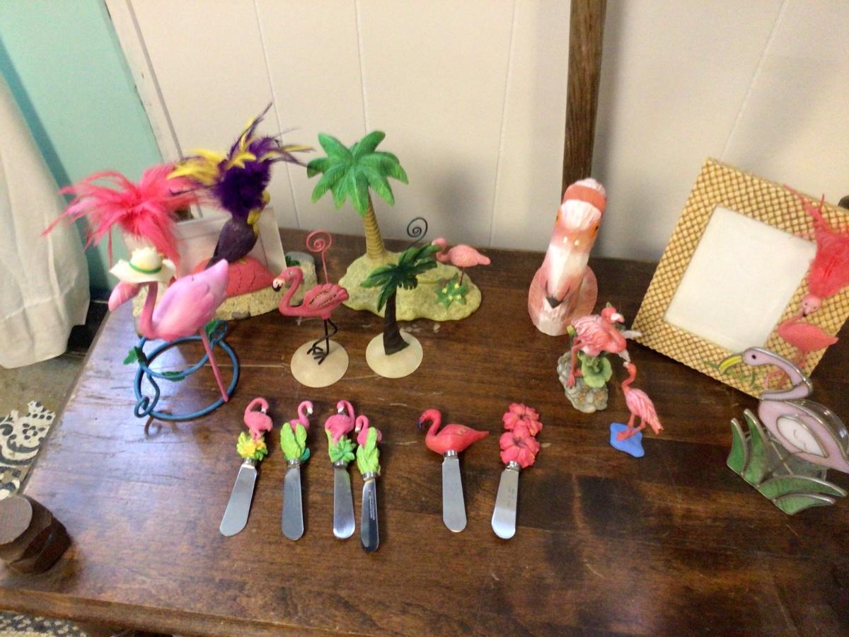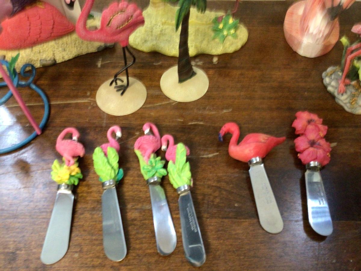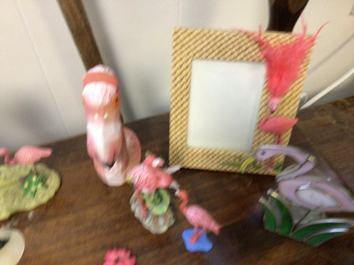 Great pink flamingo items. Picture frames metal picture holders figurines butter knives.