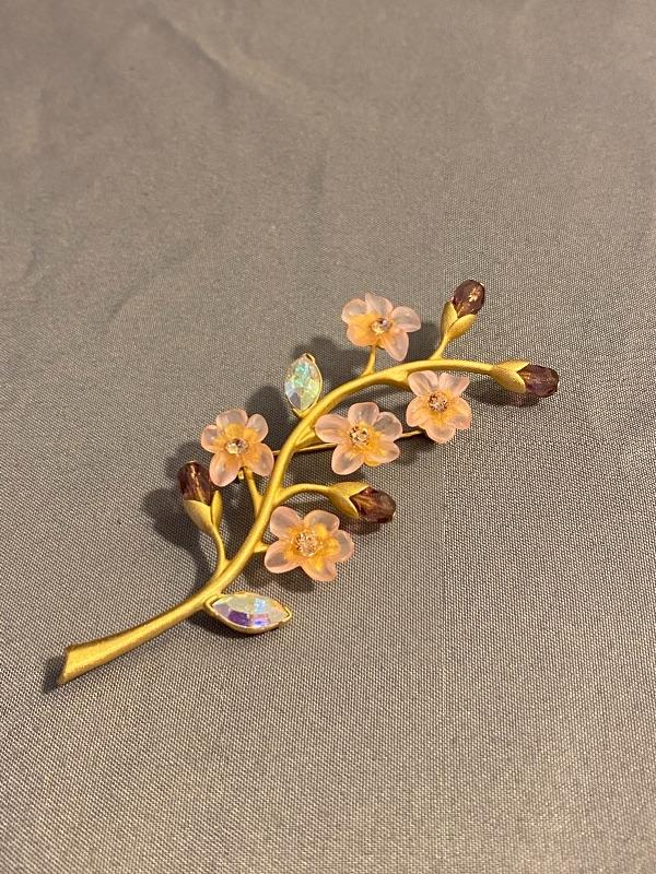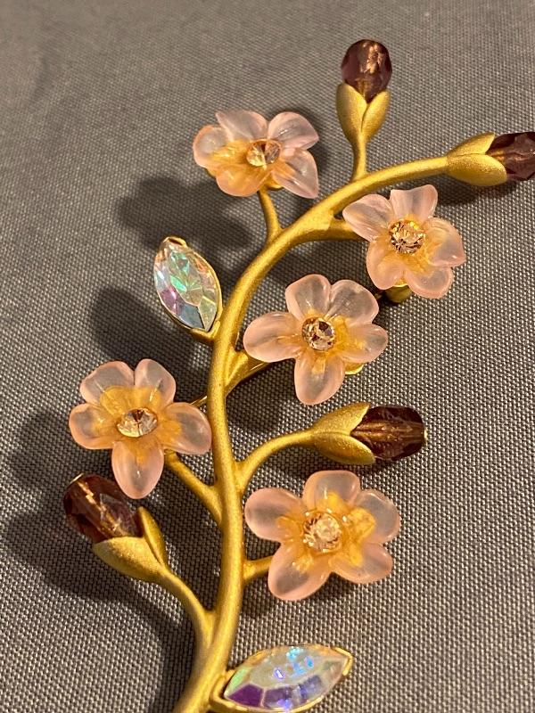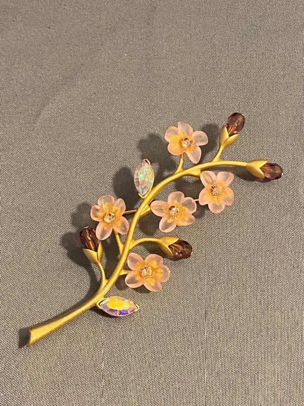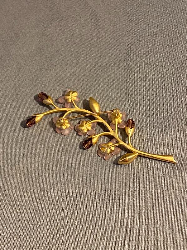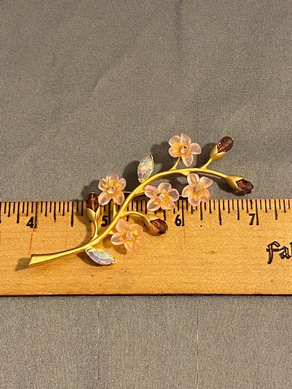 Pink floral branch pin. Matte gold setting with pink flowers and purple buds. About 3" length. Unbranded.