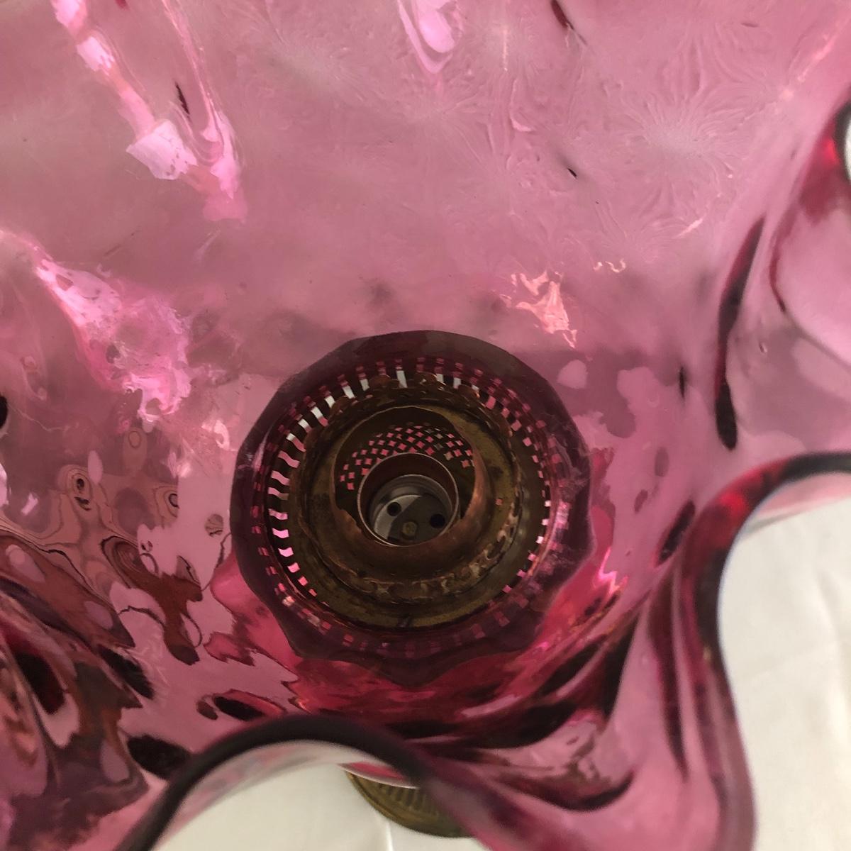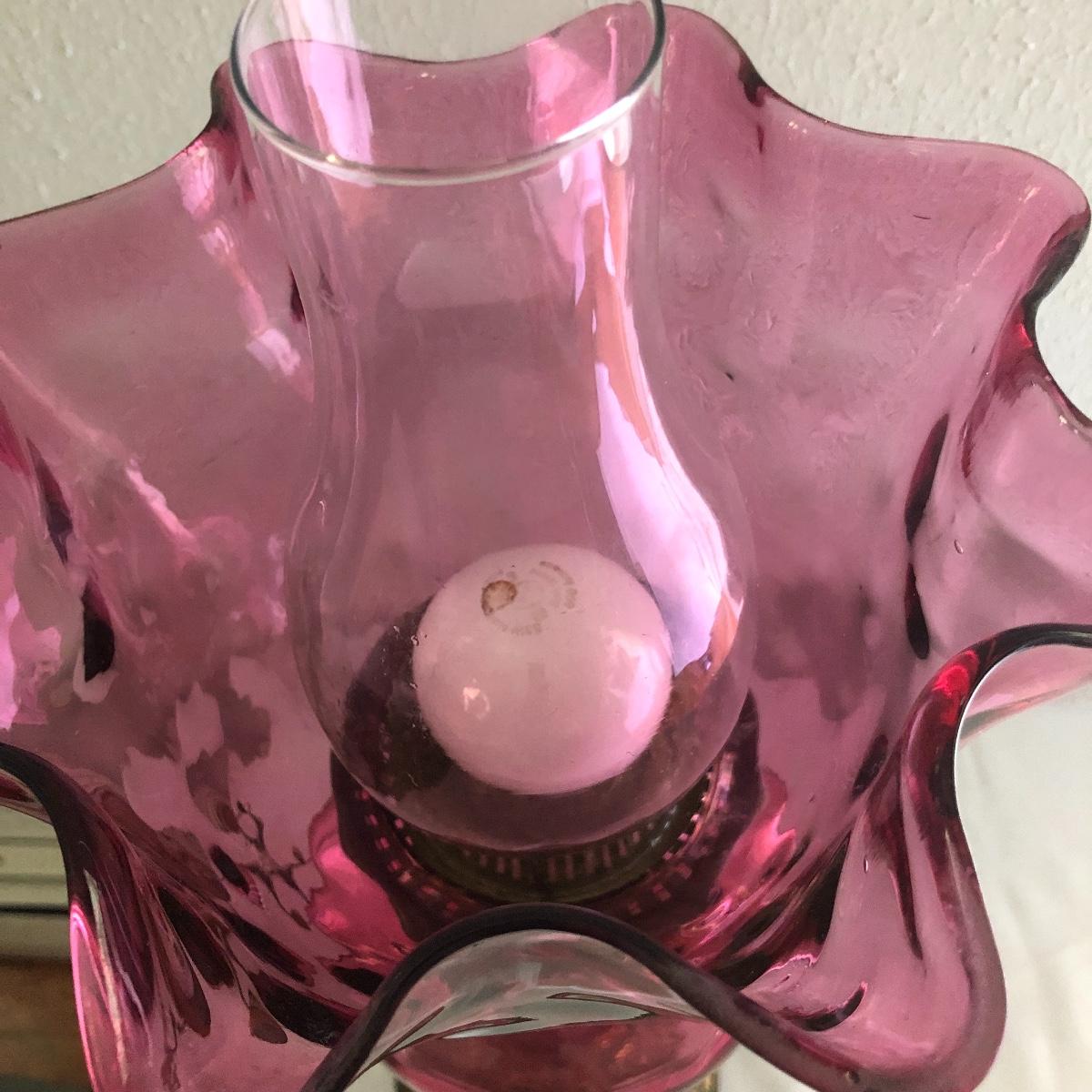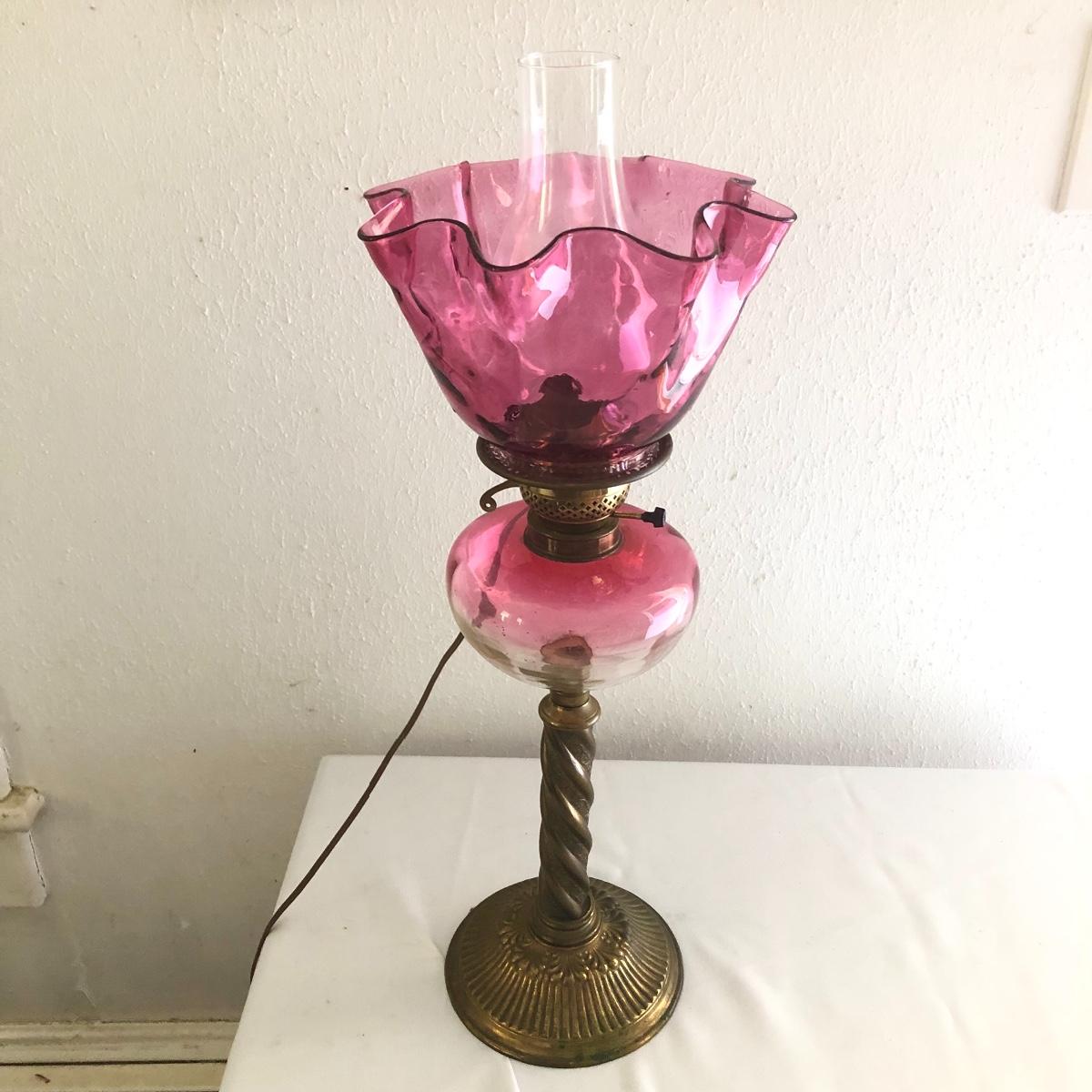 This gorgeous lamp appears to have been converted from an old oil lamp. The base is brass. Measures 26” tall, pink glass shade is 9” diameter