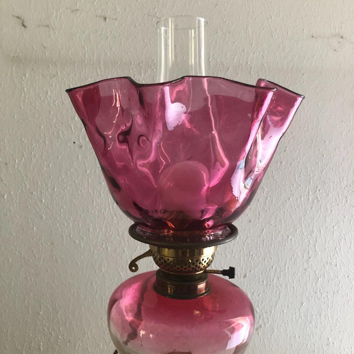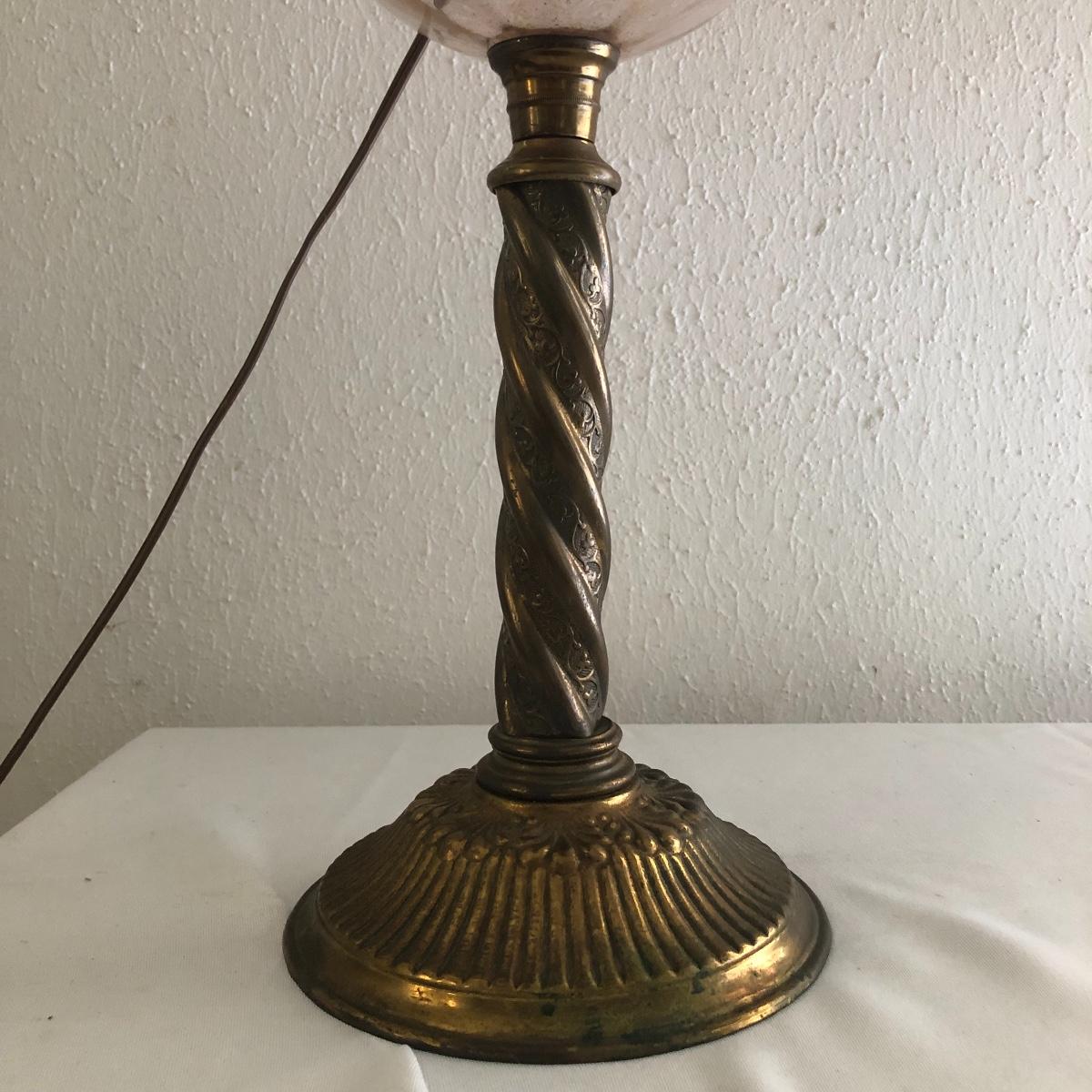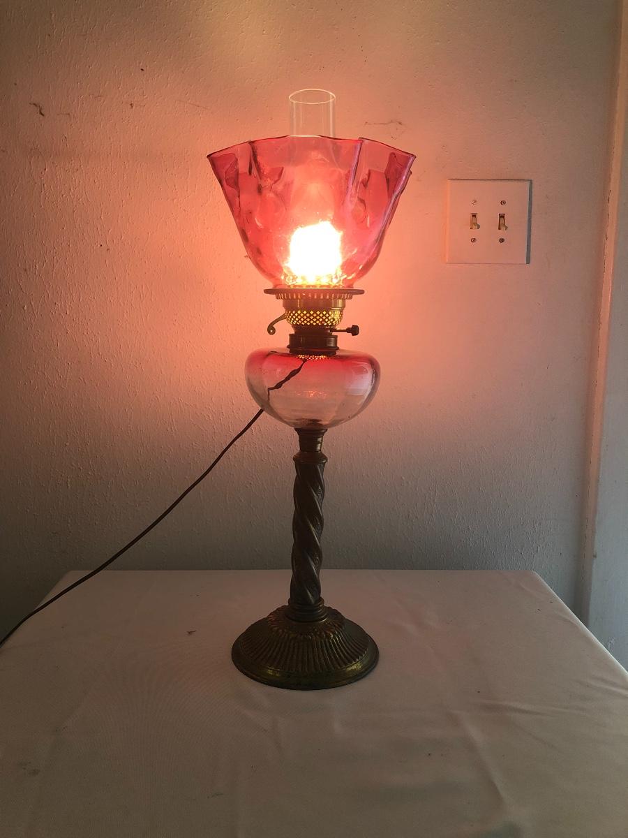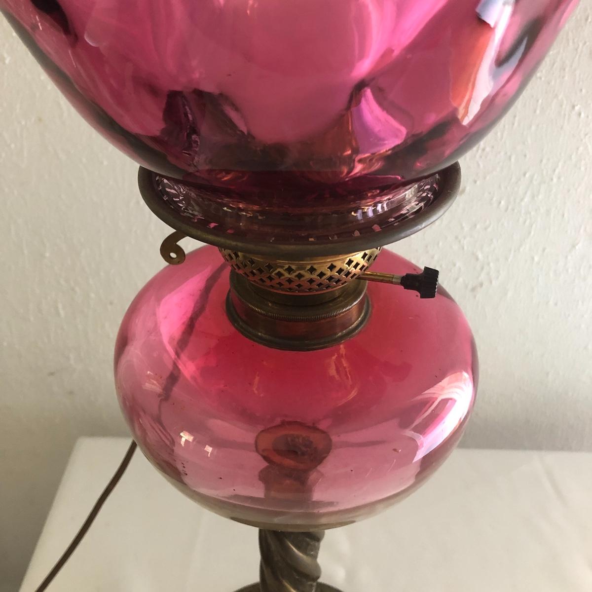 This gorgeous lamp appears to have been converted from an old oil lamp. The base is brass. Measures 26” tall, pink glass shade is 9” diameter