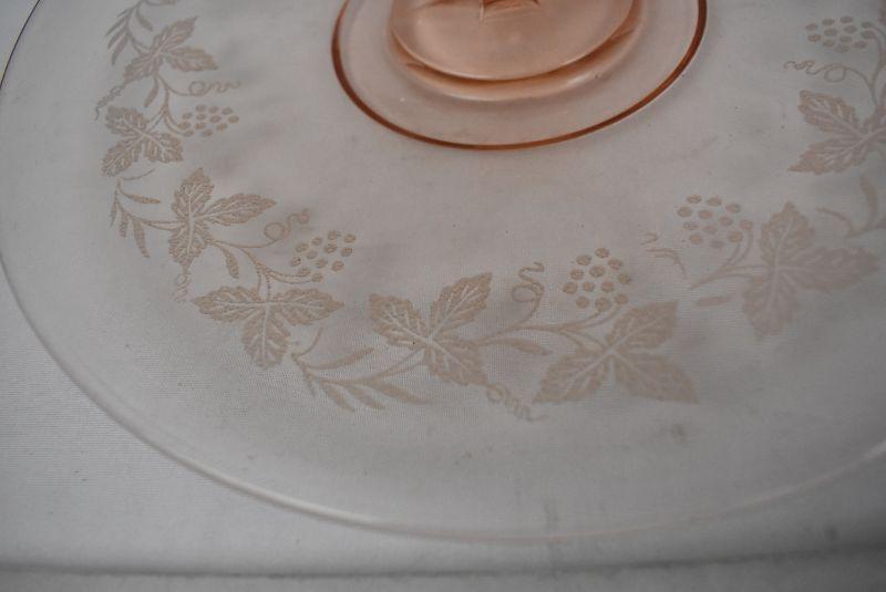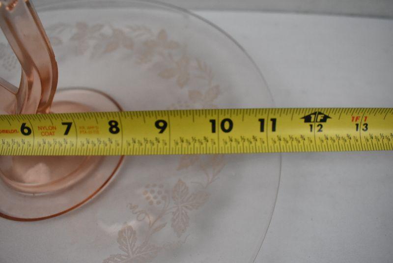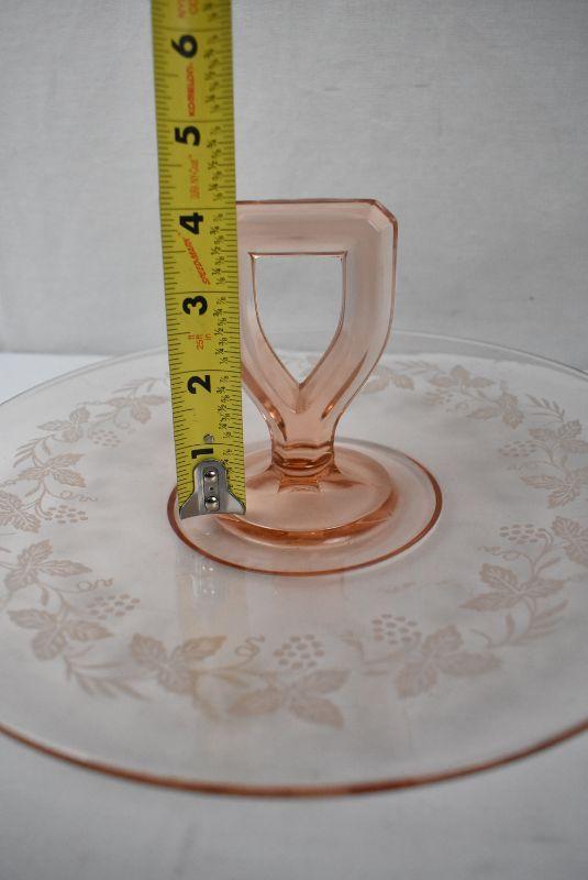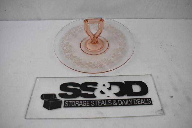 Pink Glass Etched Dessert Tray with Handle. Vintage