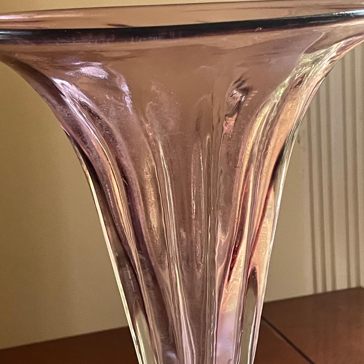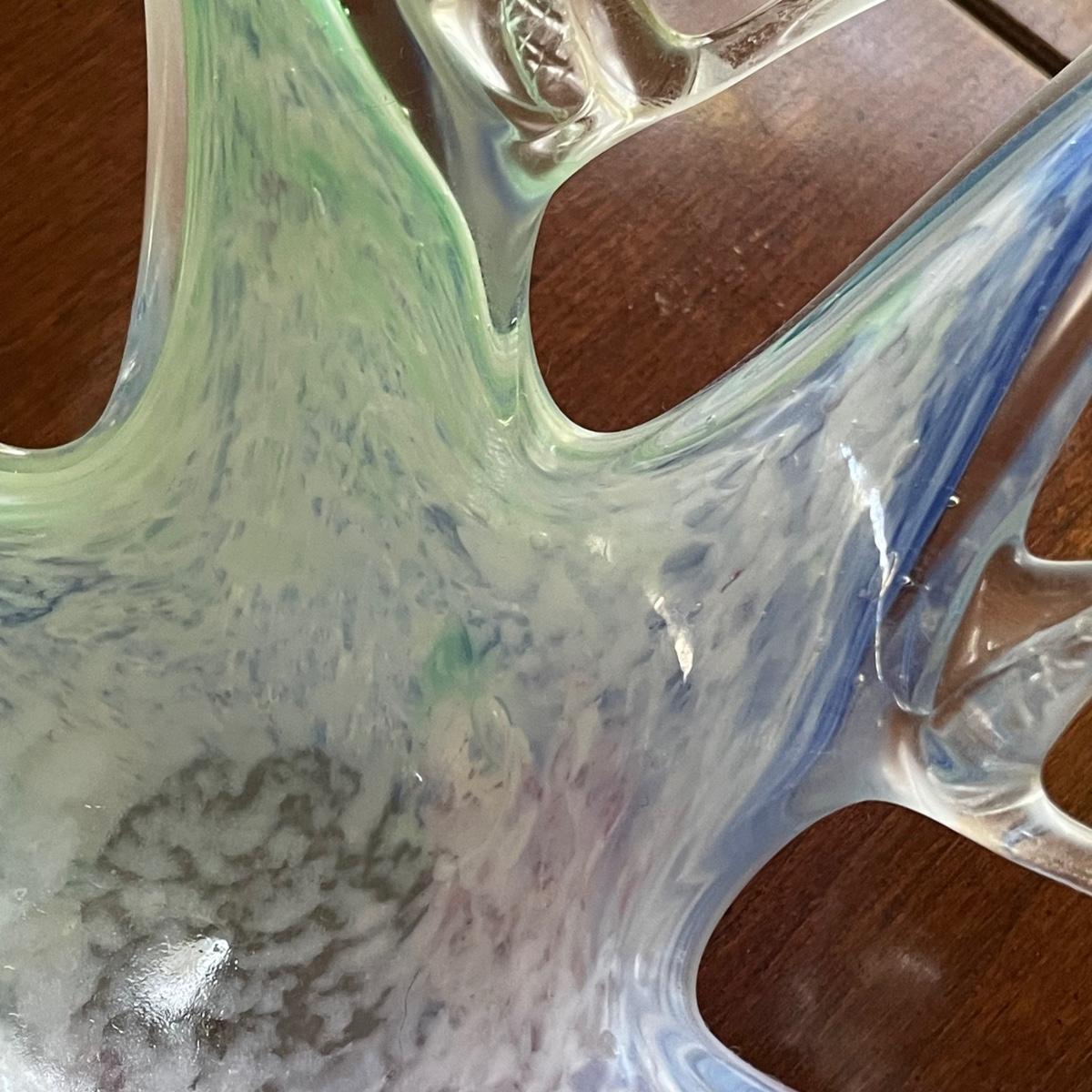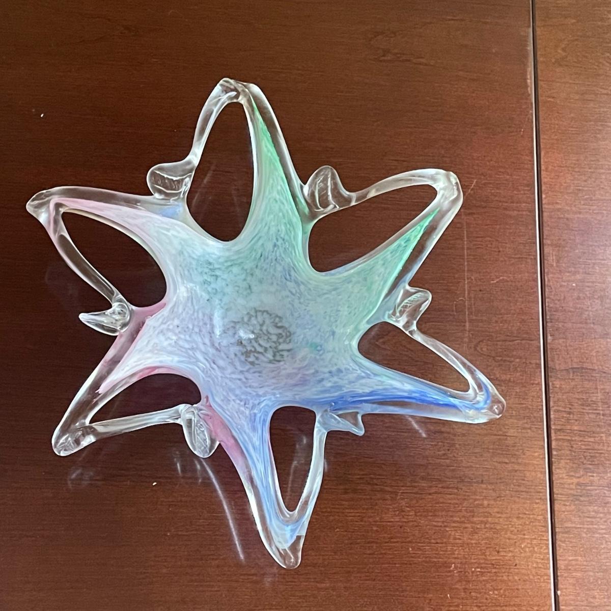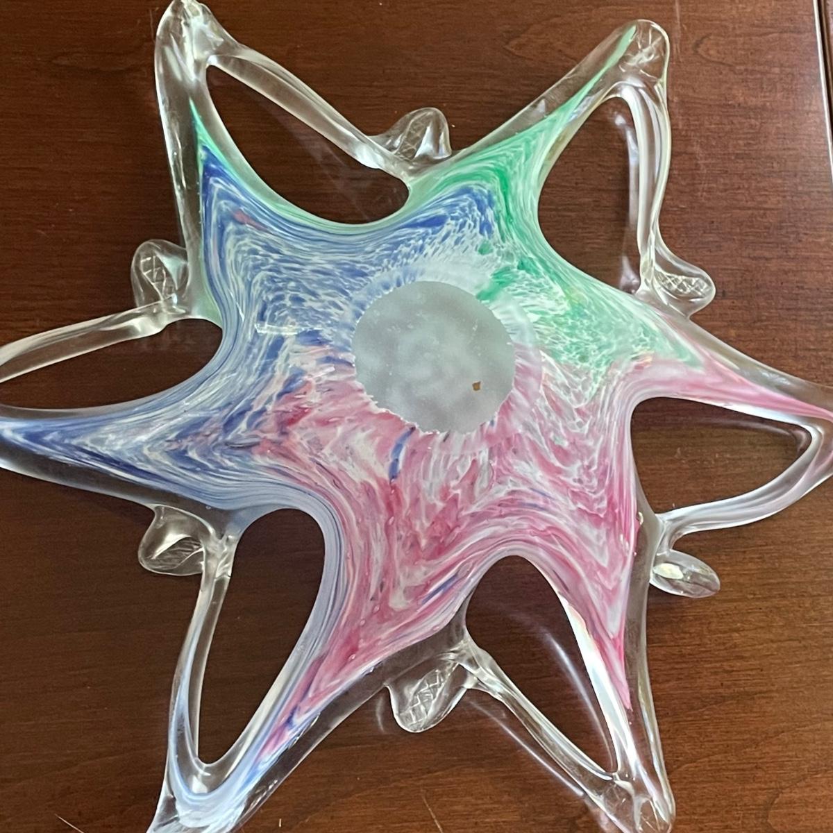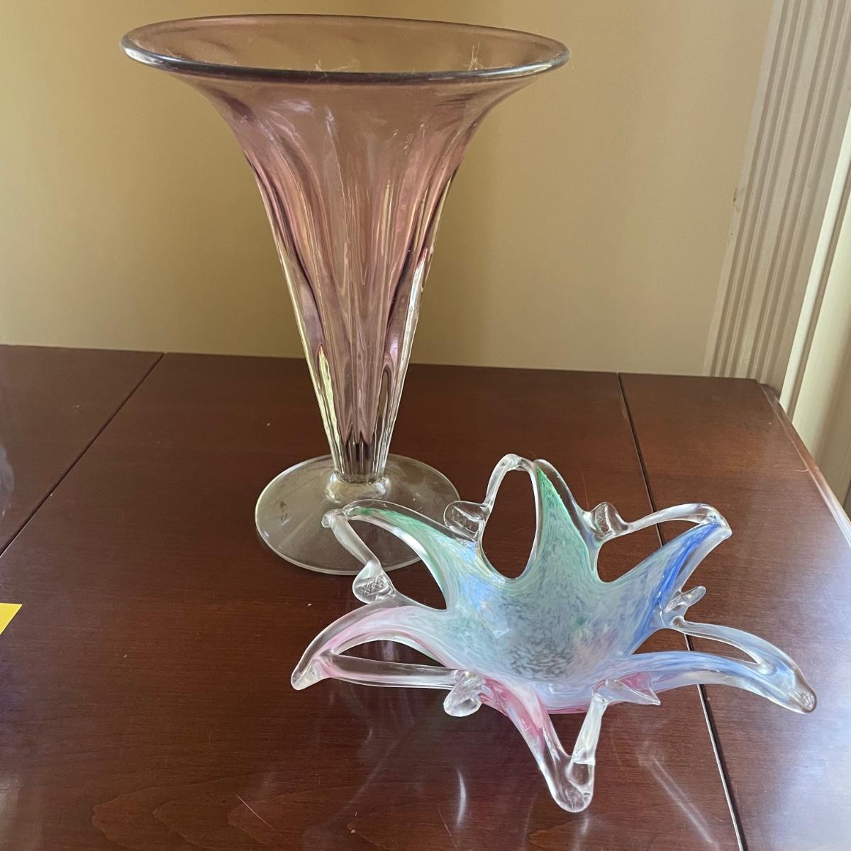 The pink glass vase measures 8” d x 11”tall. There are a few minor scratches on the base, not seen from normal view as appears on the underneath. Lot also includes a pretty glass dish, reminiscent of a starfish, with swirls of green, blue, and pink.