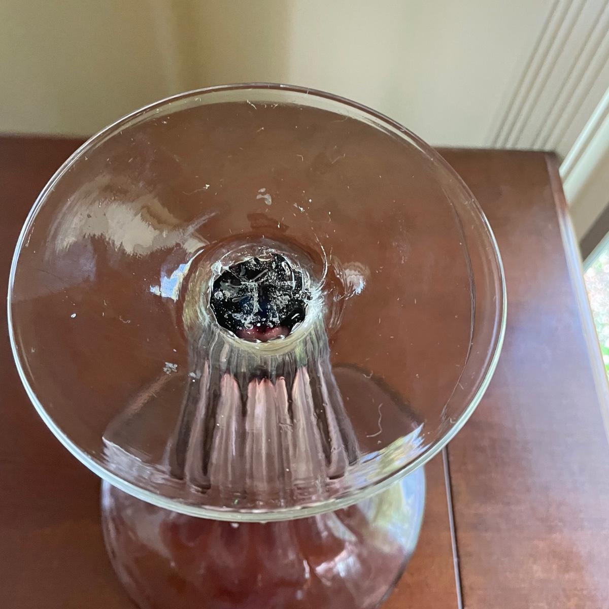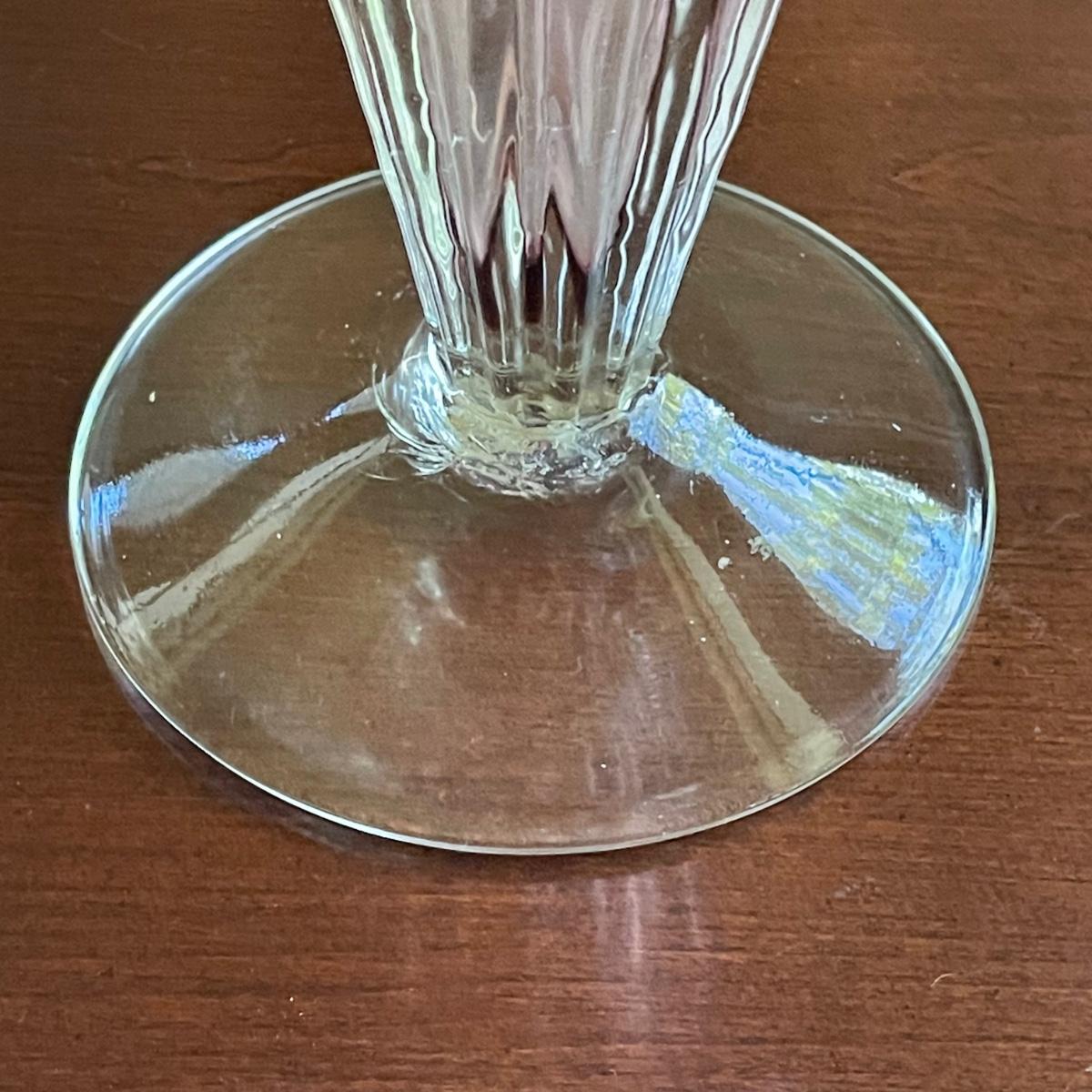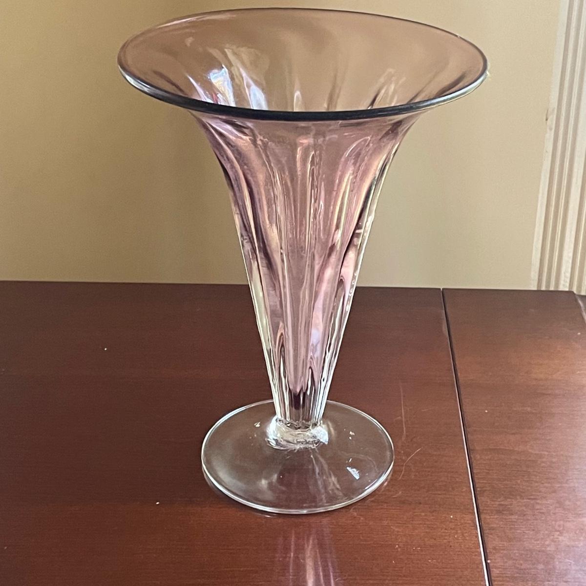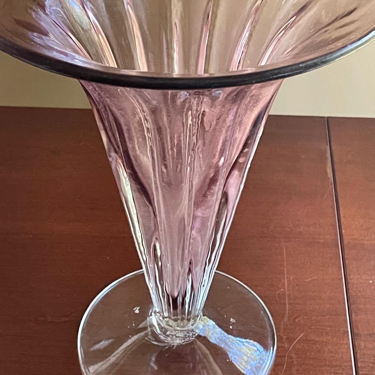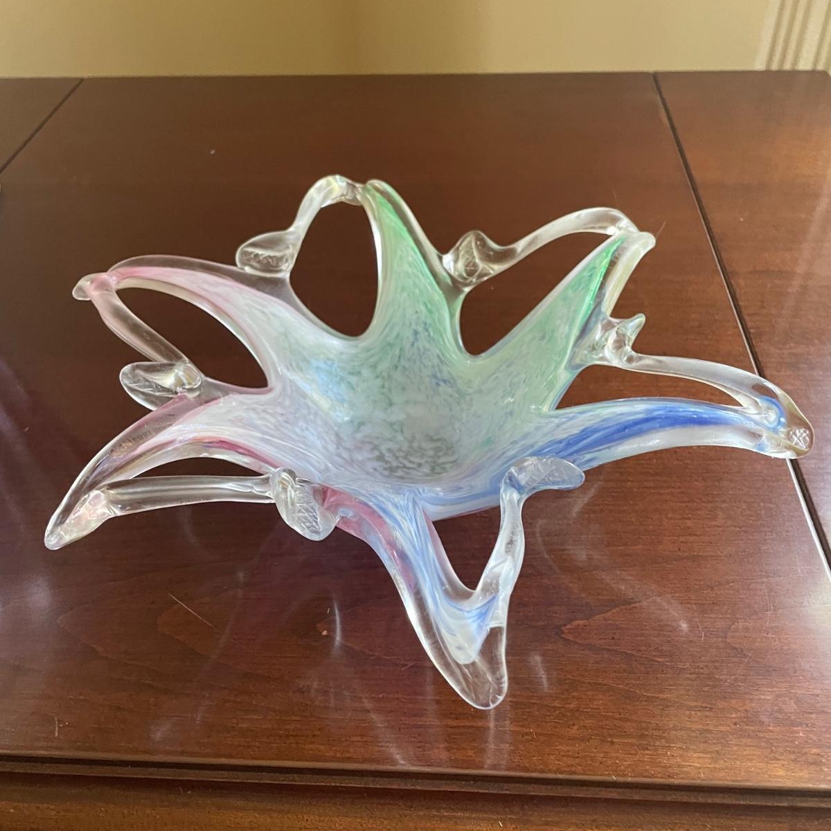 The pink glass vase measures 8” d x 11”tall. There are a few minor scratches on the base, not seen from normal view as appears on the underneath. Lot also includes a pretty glass dish, reminiscent of a starfish, with swirls of green, blue, and pink.