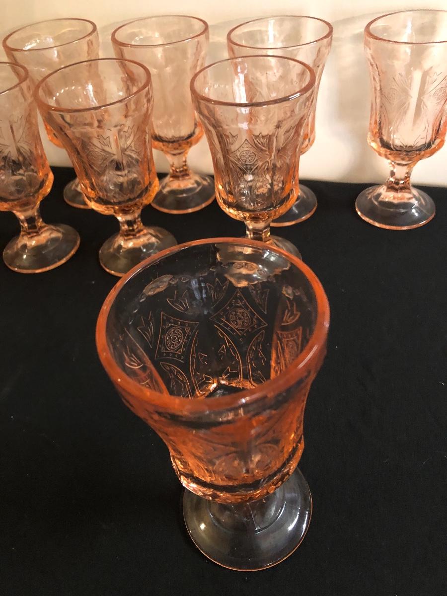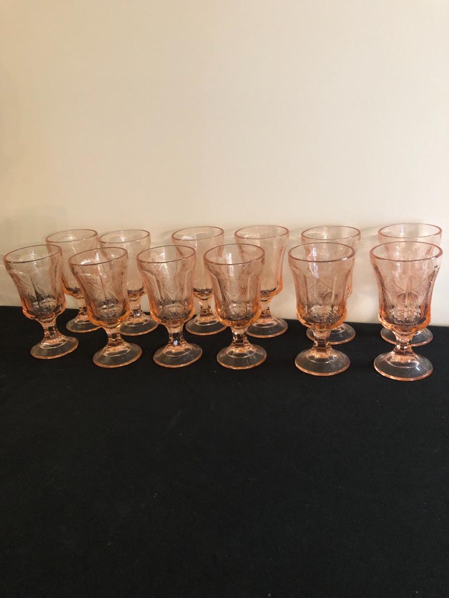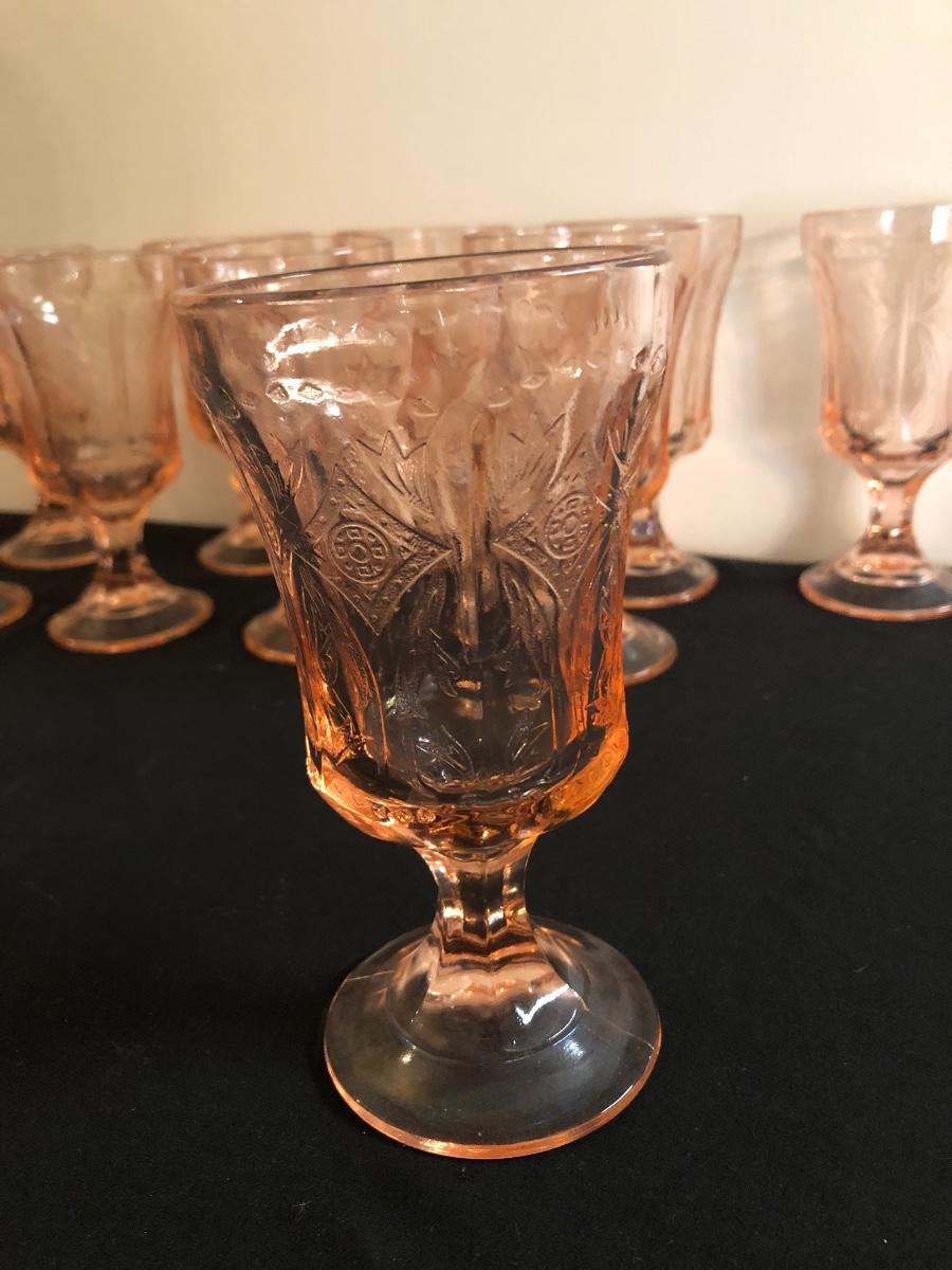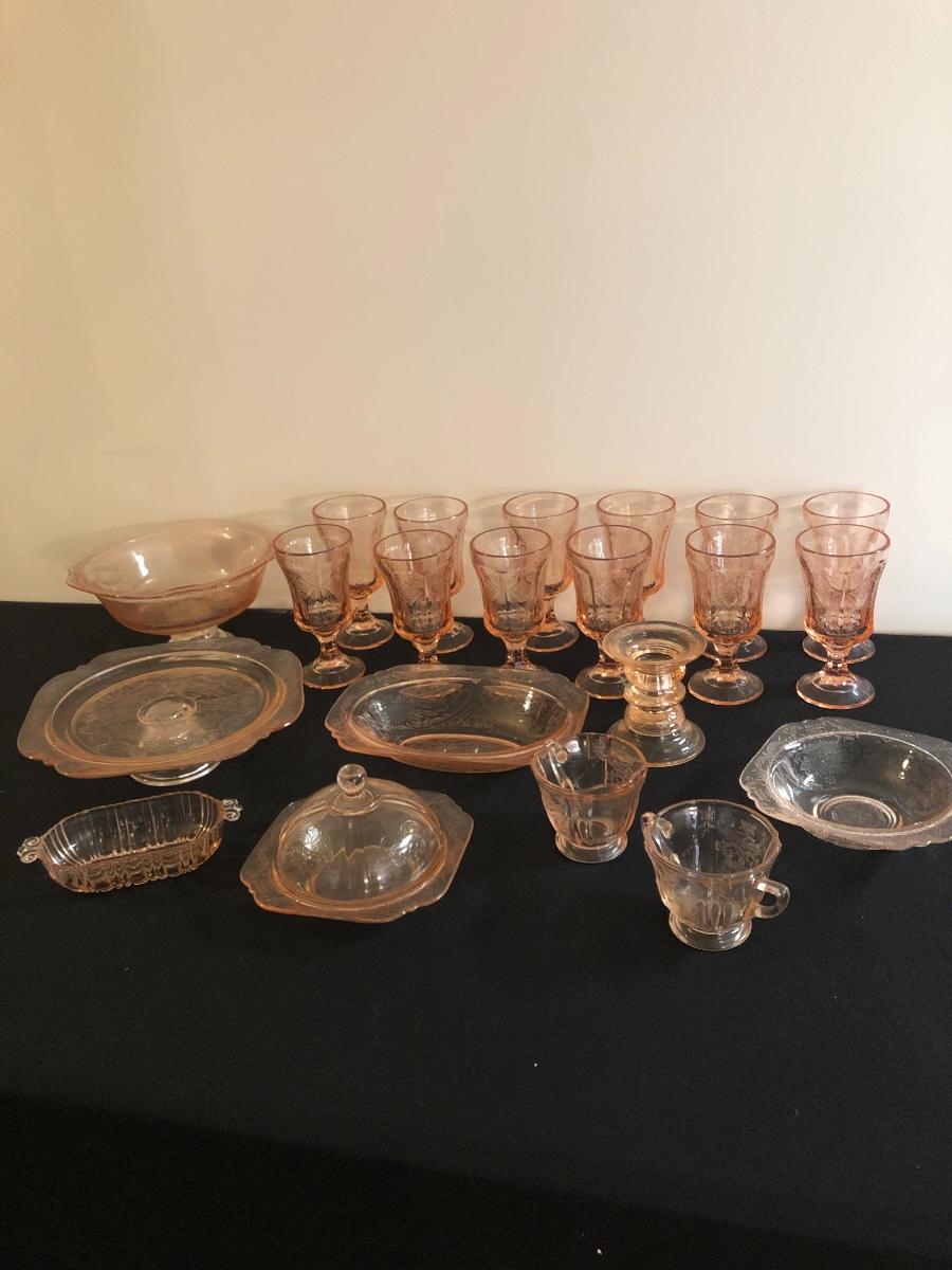 There is nineteen pieces in this lot - all pink! There are twelve goblets, a cake stand, a pedestal dish, candle holder, butter dish, rectangular uncovered dish, similar two dishes - one with a cover. The pedestal dish is 9.5” in diameter. The rectangular dish measures 10” x 7”. The two square dishes (only one has a cover) measures 7” x 7”. Shipping Available.