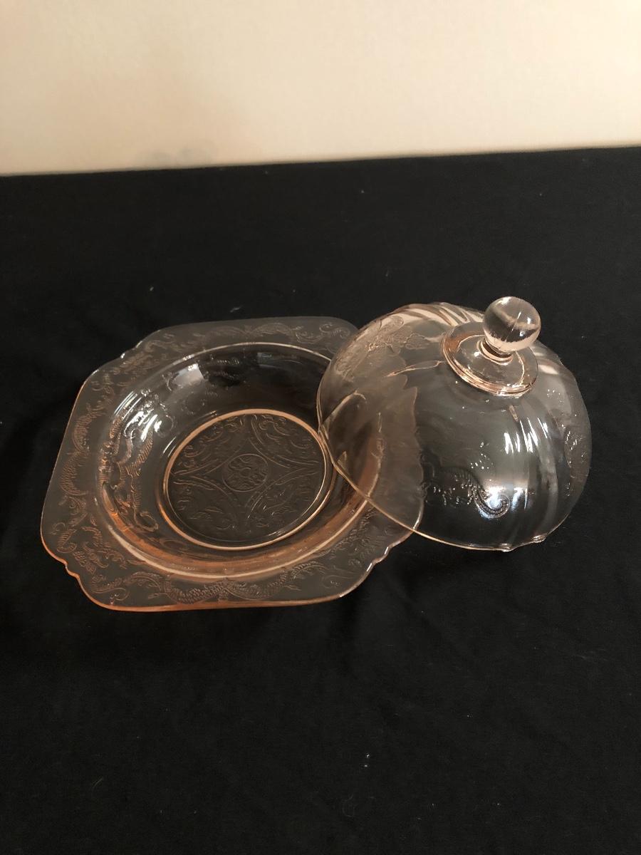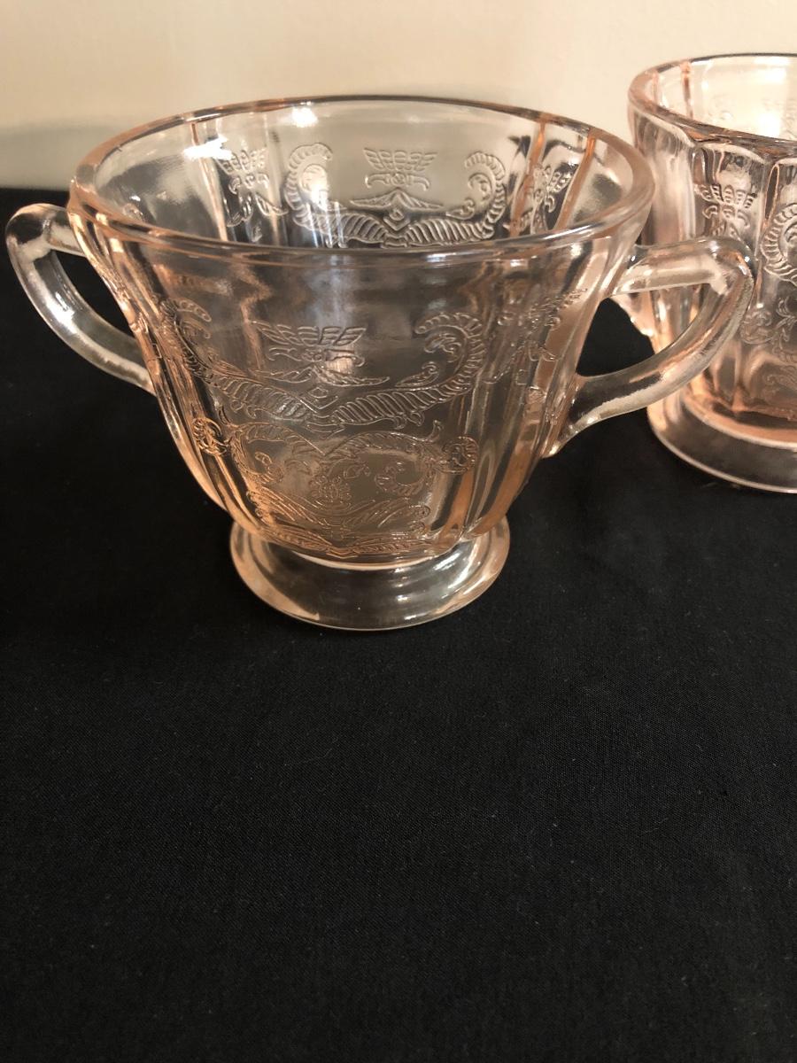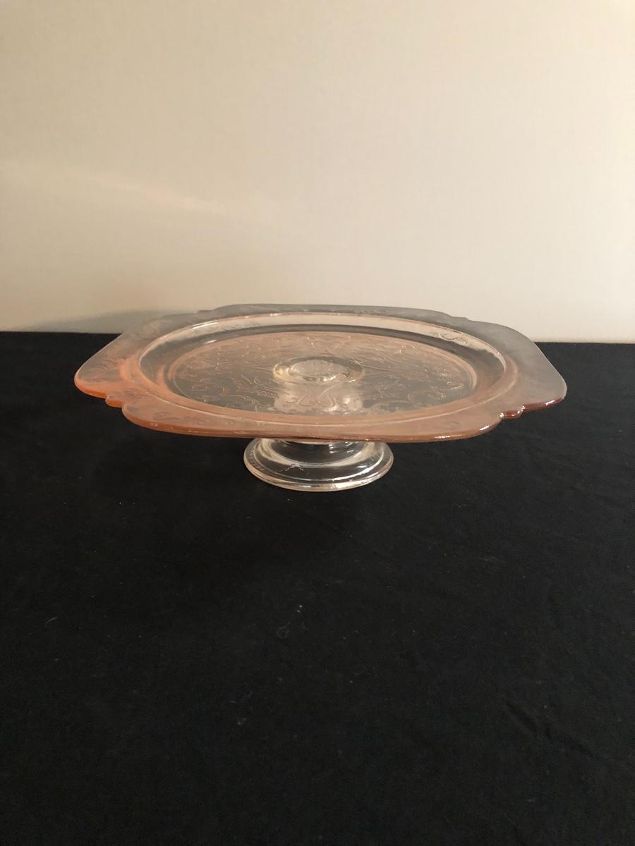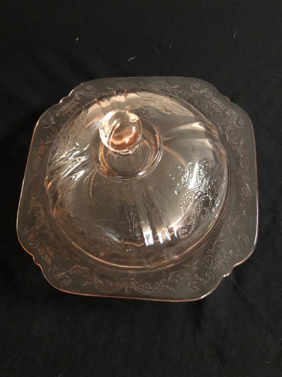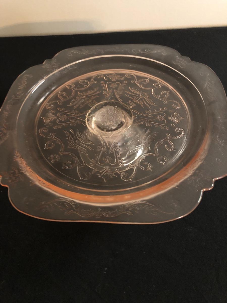 There is nineteen pieces in this lot - all pink! There are twelve goblets, a cake stand, a pedestal dish, candle holder, butter dish, rectangular uncovered dish, similar two dishes - one with a cover. The pedestal dish is 9.5” in diameter. The rectangular dish measures 10” x 7”. The two square dishes (only one has a cover) measures 7” x 7”. Shipping Available.