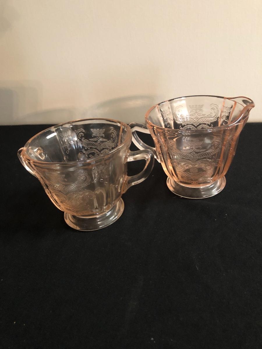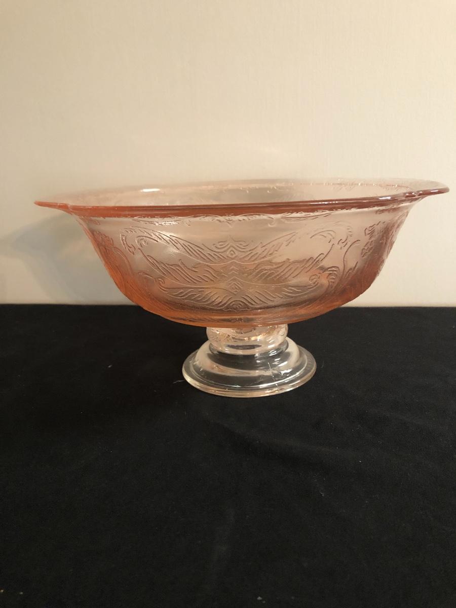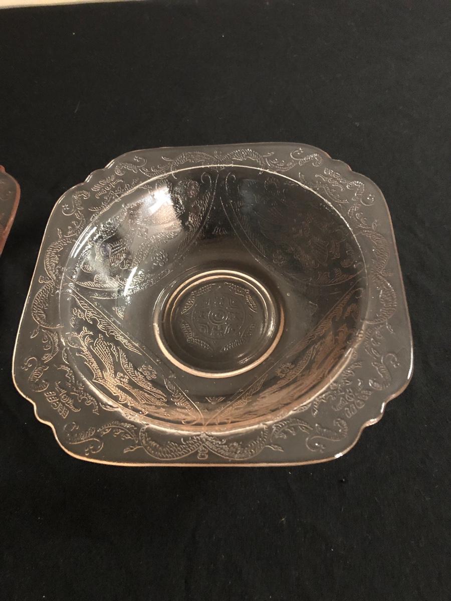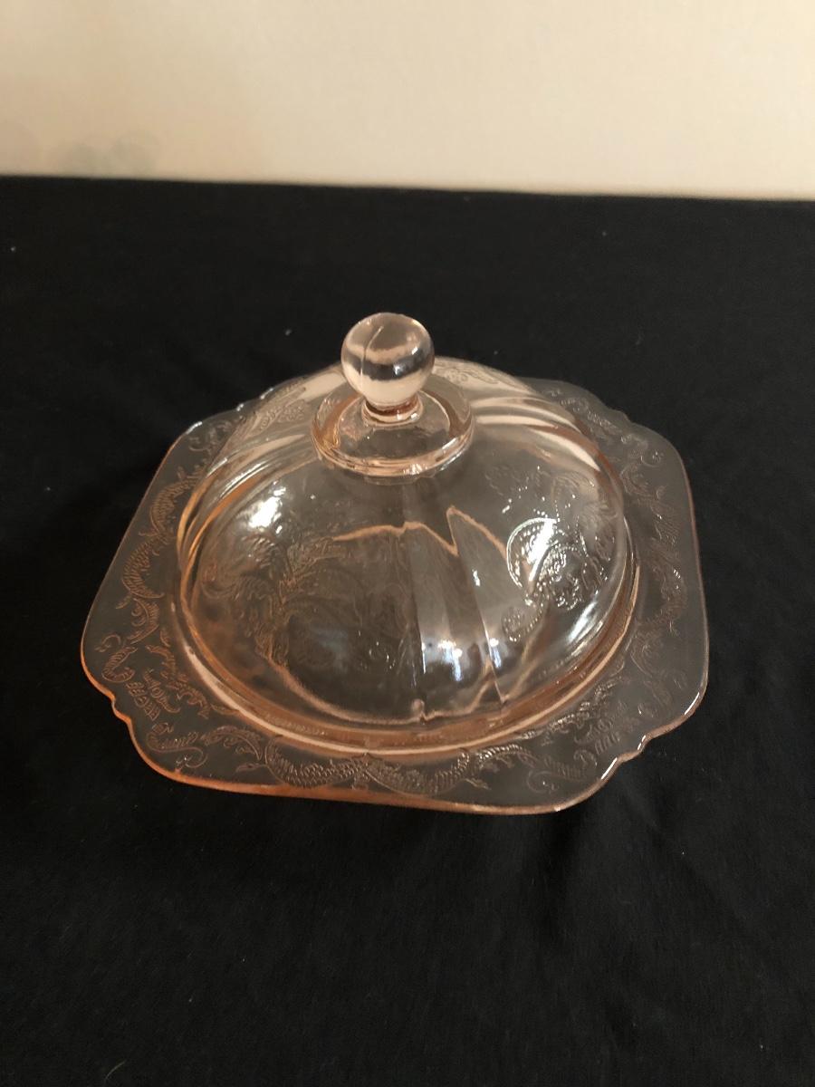 There is nineteen pieces in this lot - all pink! There are twelve goblets, a cake stand, a pedestal dish, candle holder, butter dish, rectangular uncovered dish, similar two dishes - one with a cover. The pedestal dish is 9.5” in diameter. The rectangular dish measures 10” x 7”. The two square dishes (only one has a cover) measures 7” x 7”. Shipping Available.
