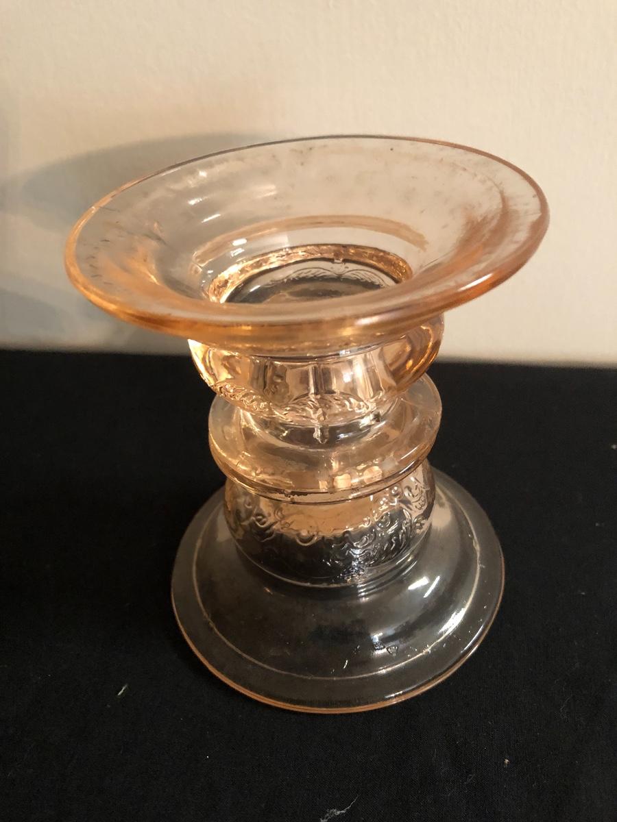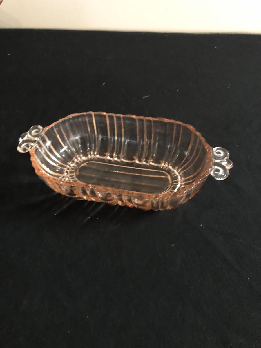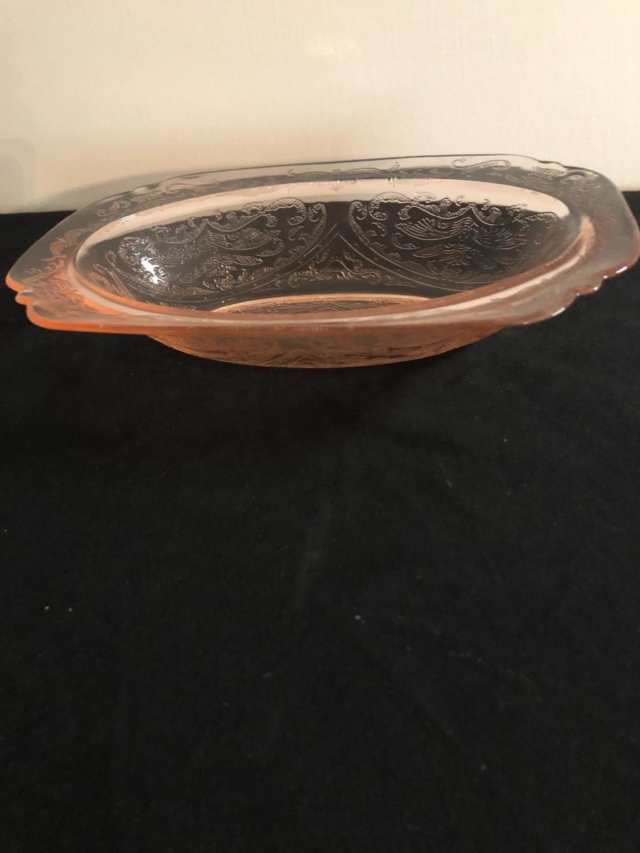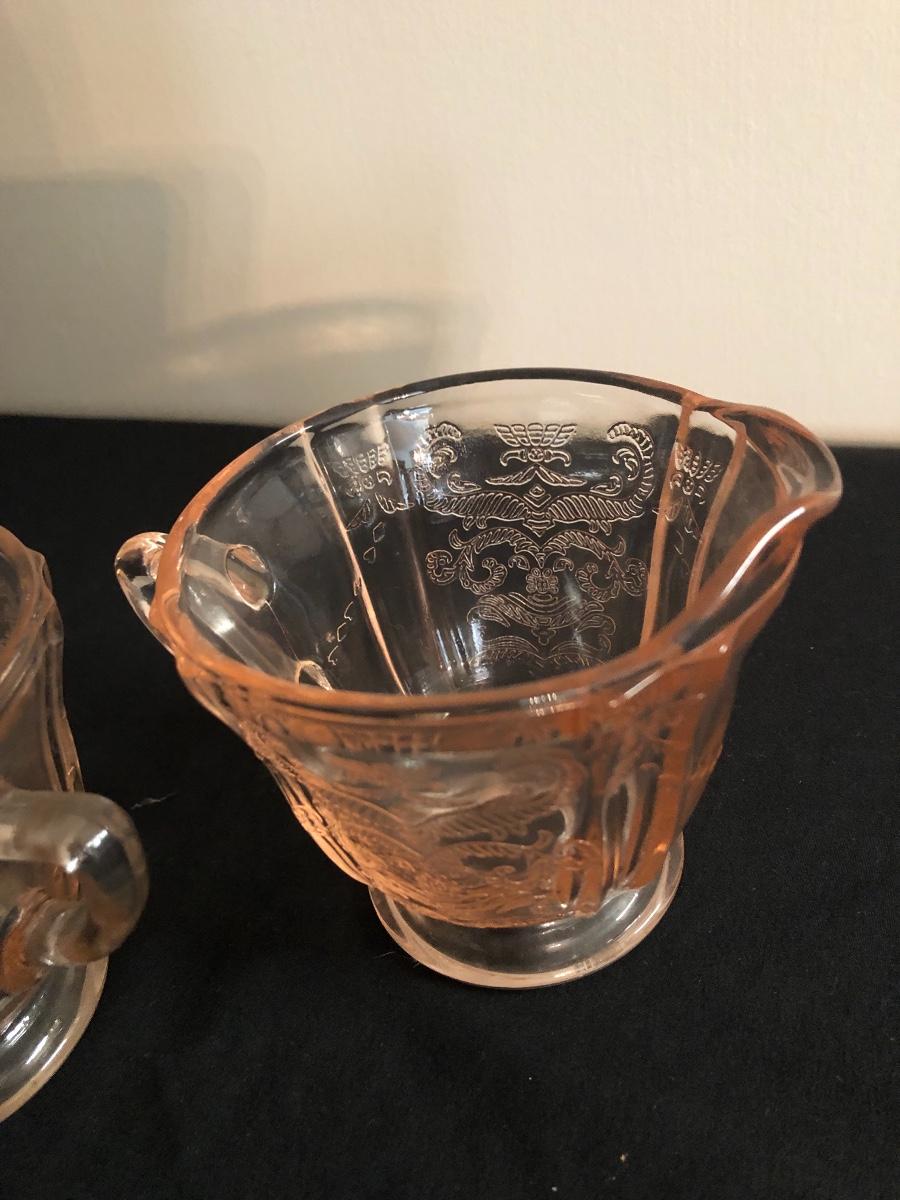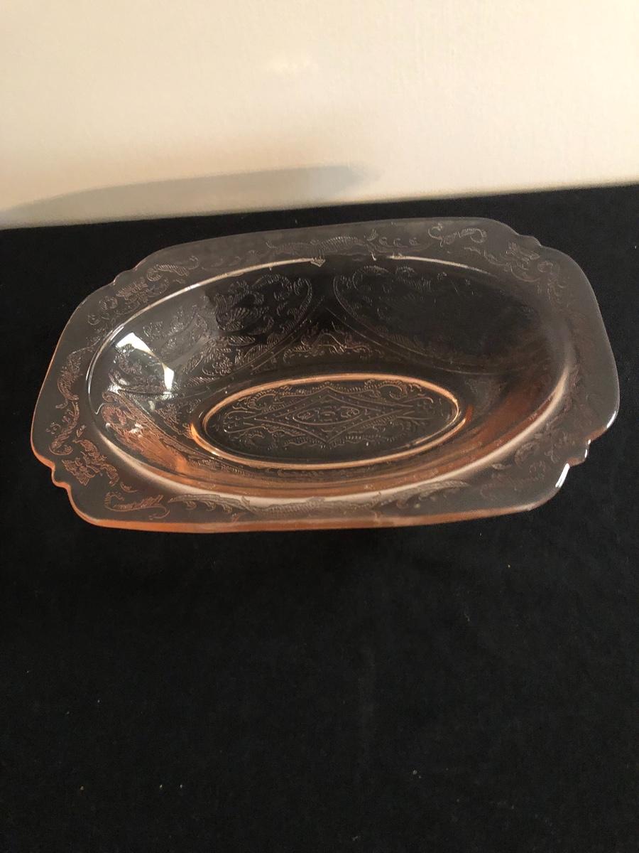 There is nineteen pieces in this lot - all pink! There are twelve goblets, a cake stand, a pedestal dish, candle holder, butter dish, rectangular uncovered dish, similar two dishes - one with a cover. The pedestal dish is 9.5” in diameter. The rectangular dish measures 10” x 7”. The two square dishes (only one has a cover) measures 7” x 7”. Shipping Available.