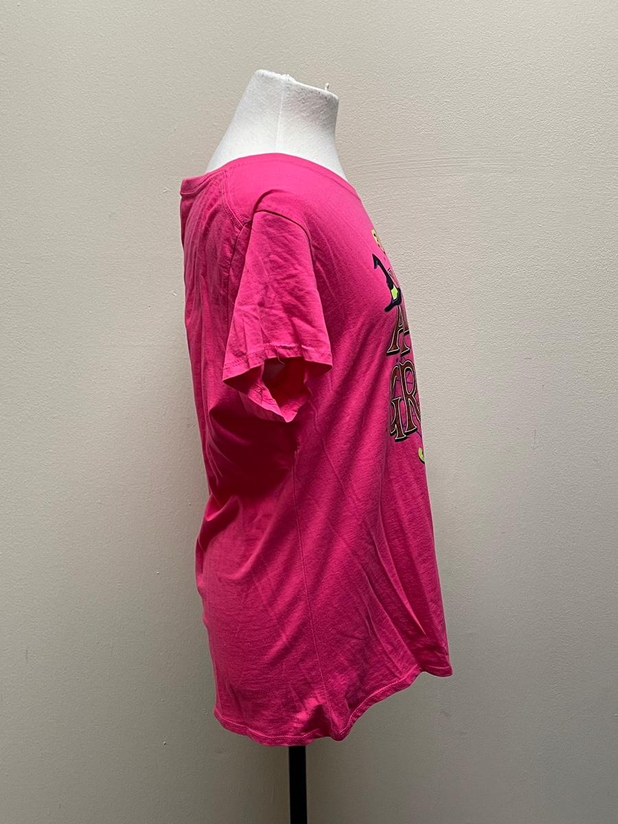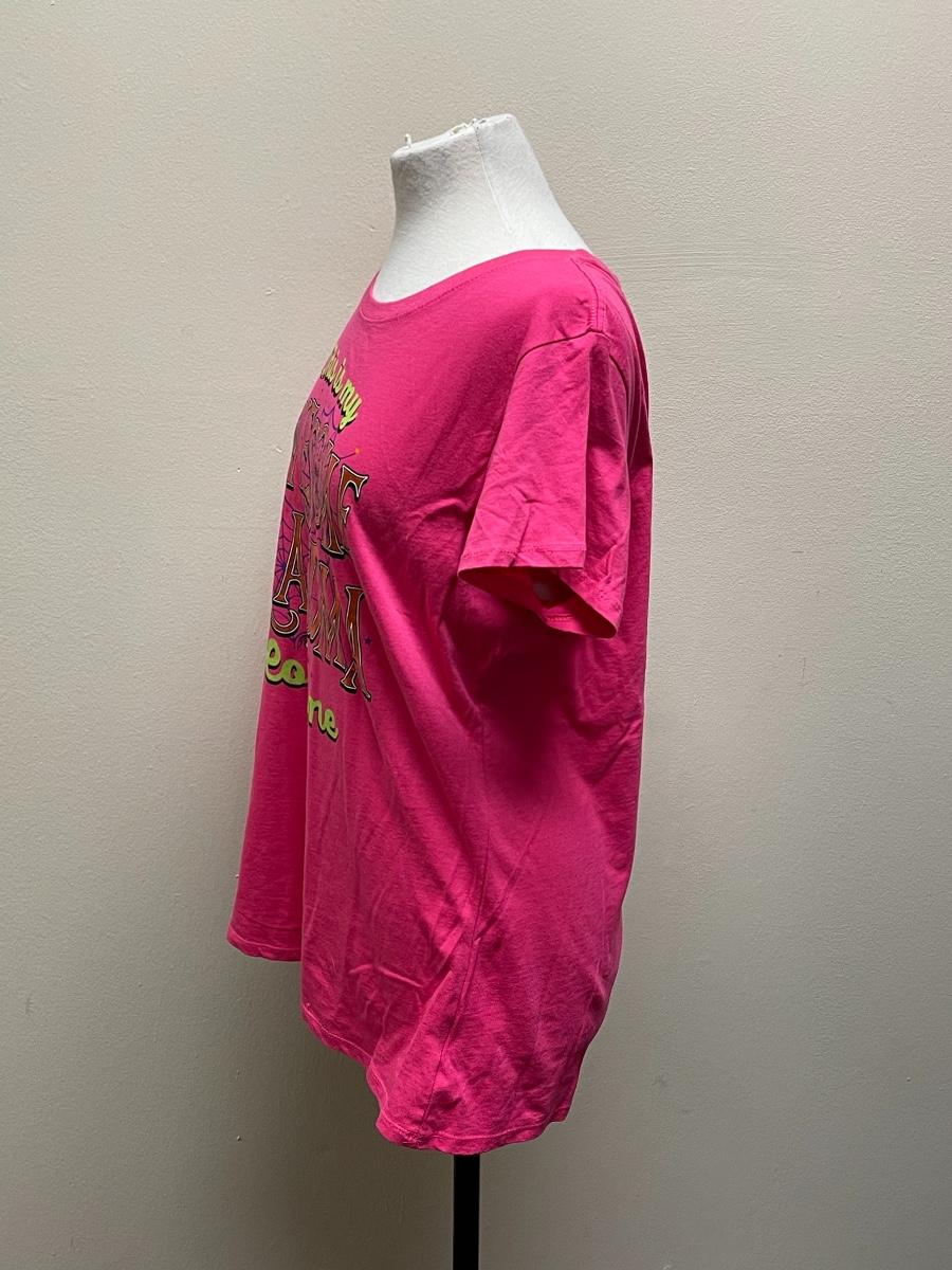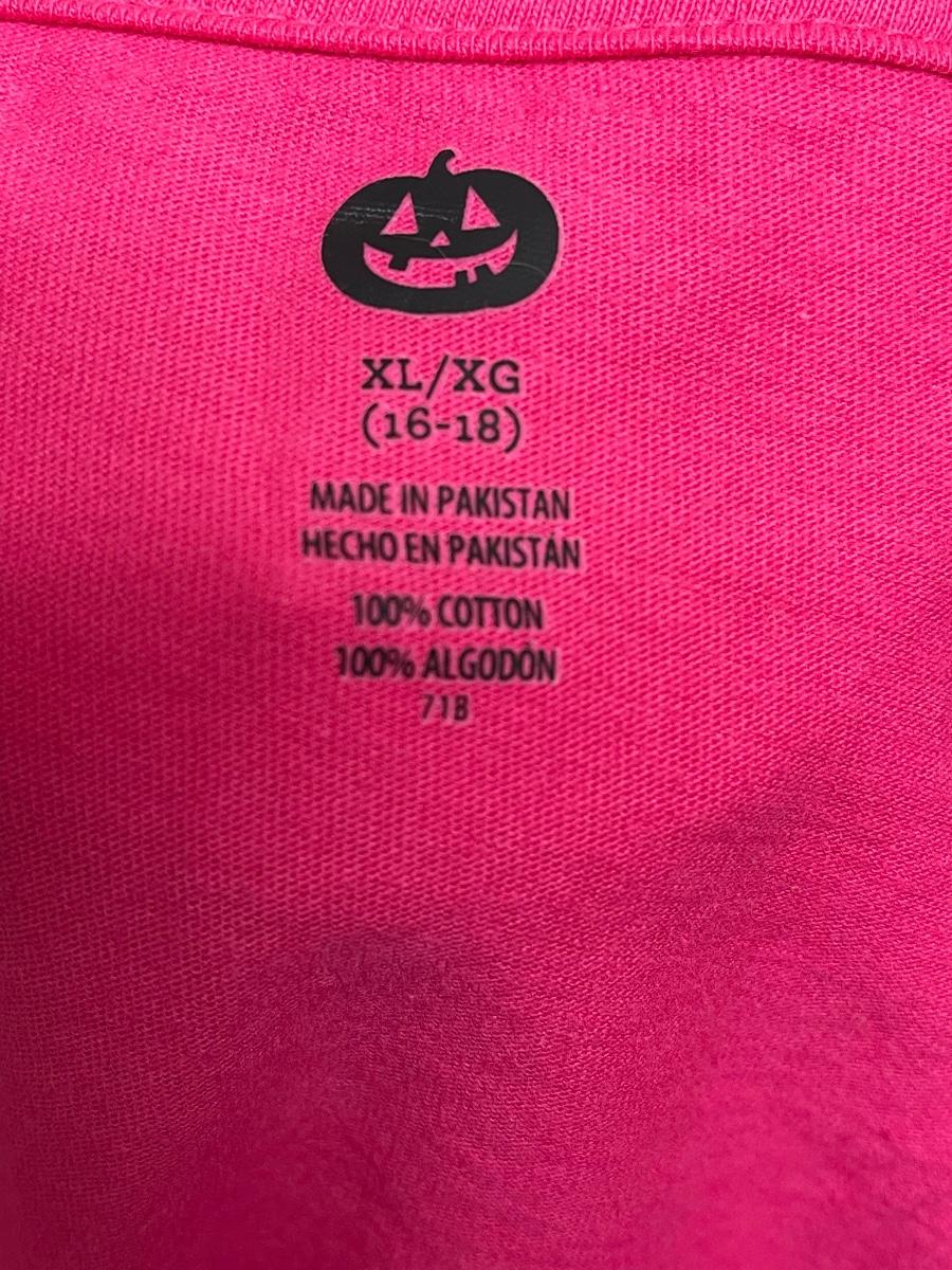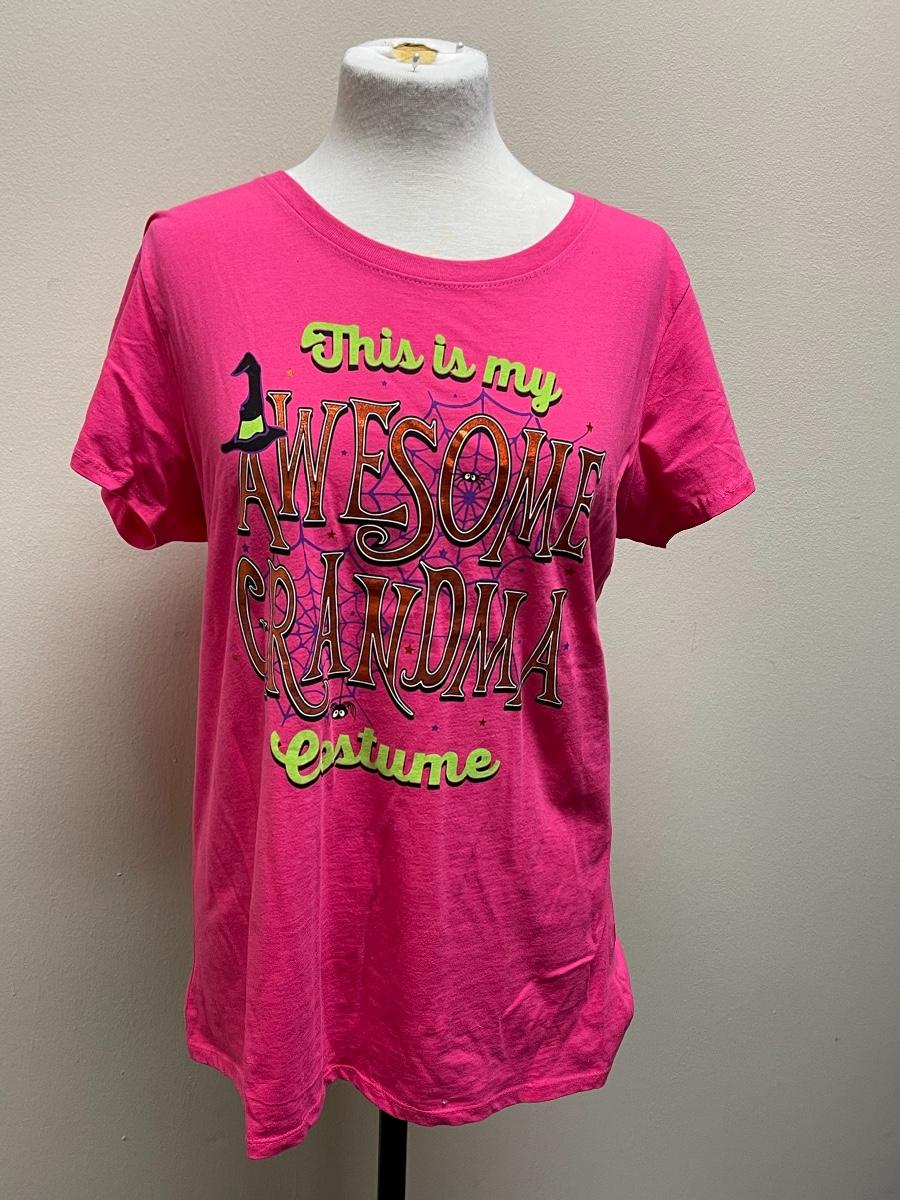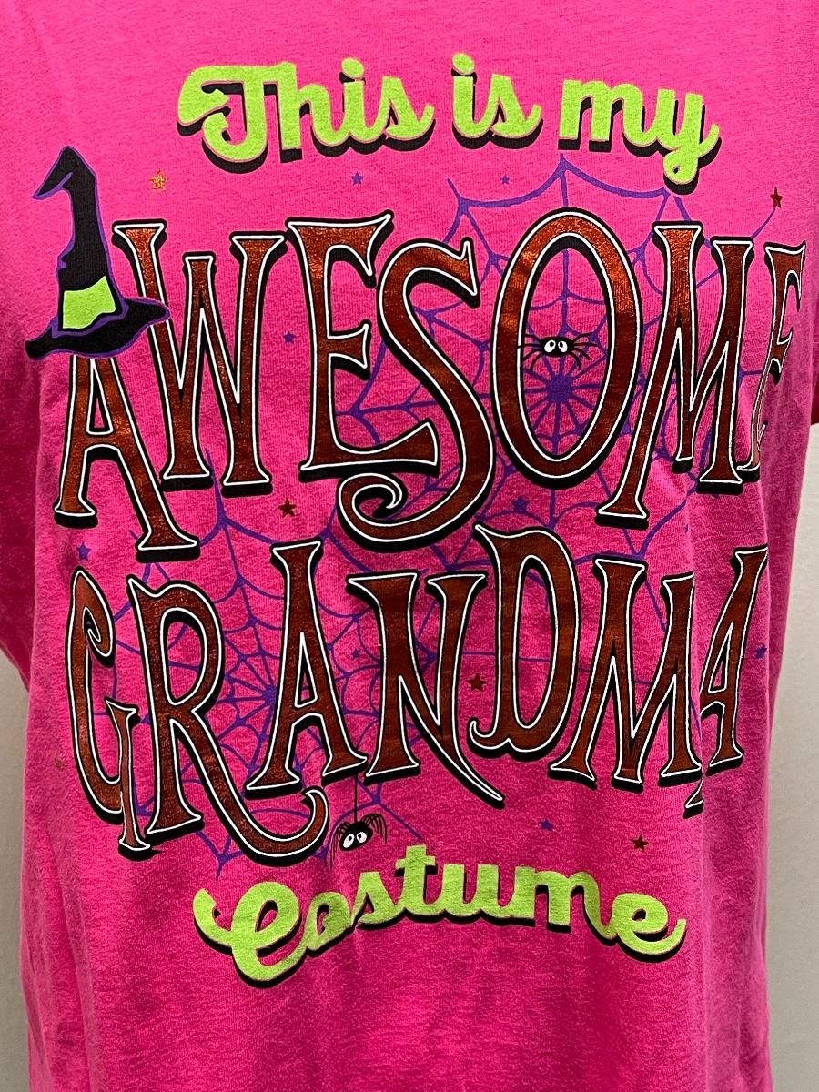 T-Shirt reads “ This is my Awesome Grandma Costume.” Shirt comes in an XL and was made in Pakistan. It is 100% cotton.