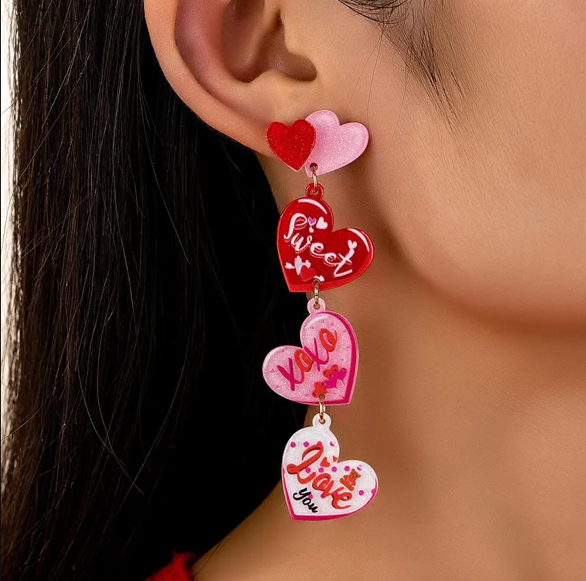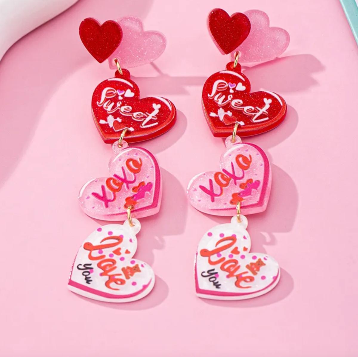 Pink Heart XOXO I Love You Sweet Conversation Heart Shaped Dangle Earrings w/Stainless Steel Posts - Women's Valentine's Day Gifts Jewelry