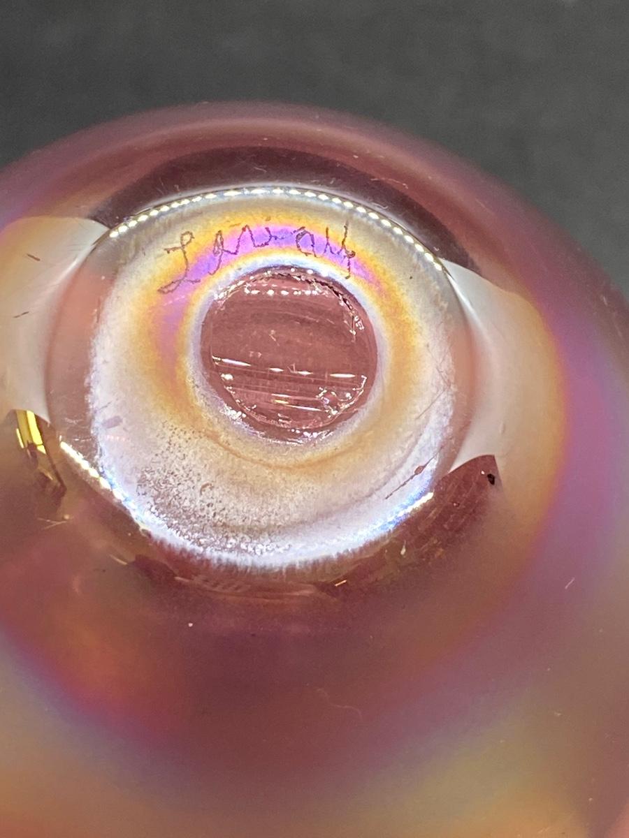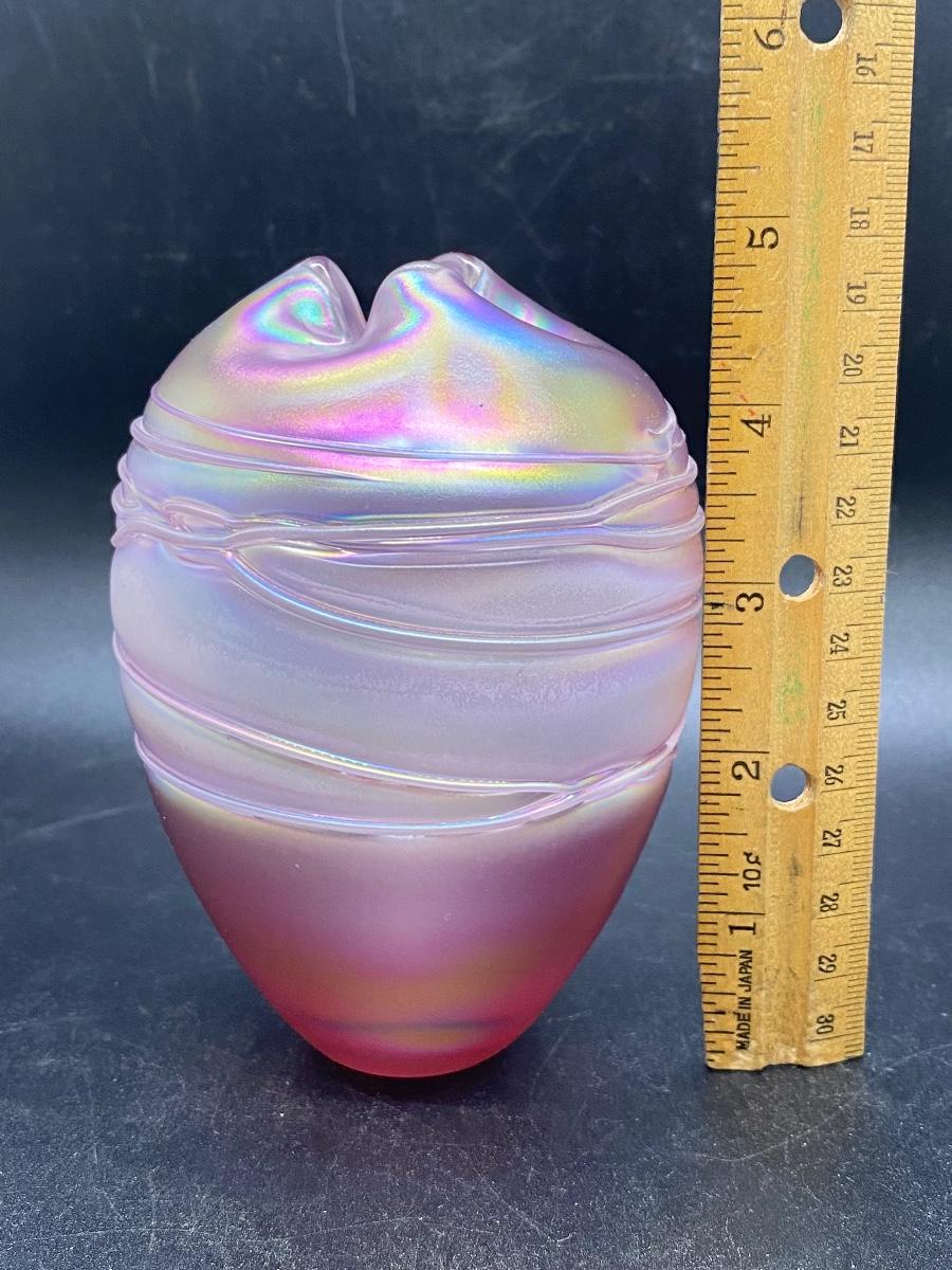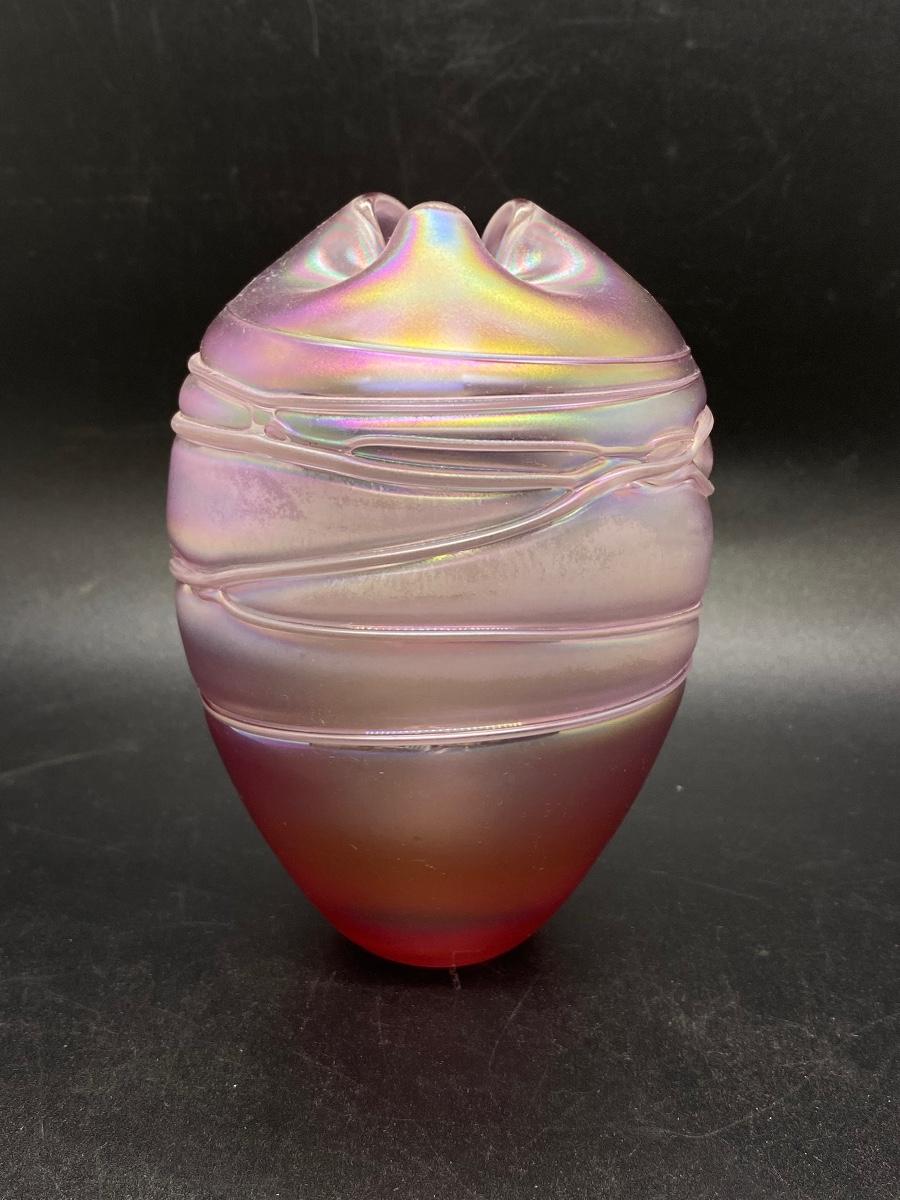 Pink Iridescent Oil Slick Blown Art Glass Vase Paper Weight Levay Studios Signed