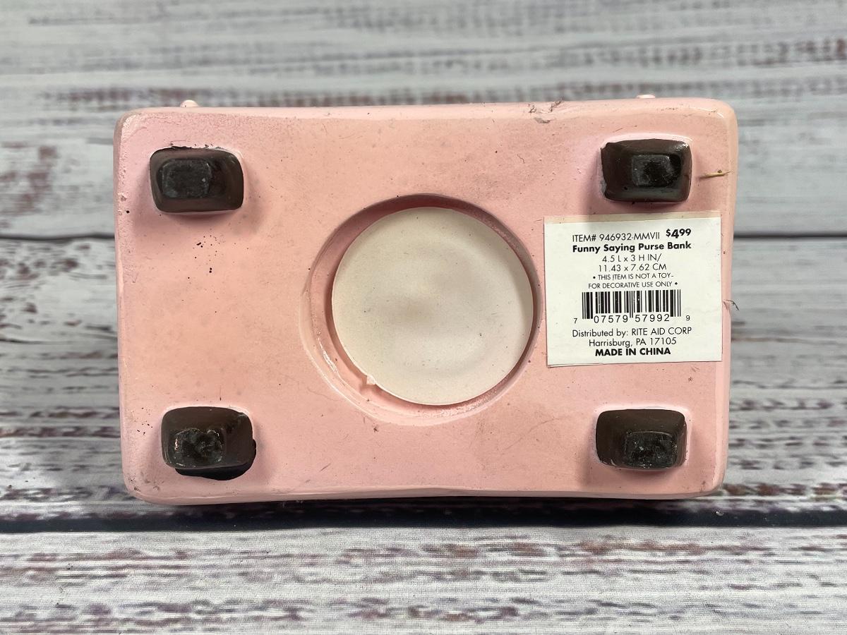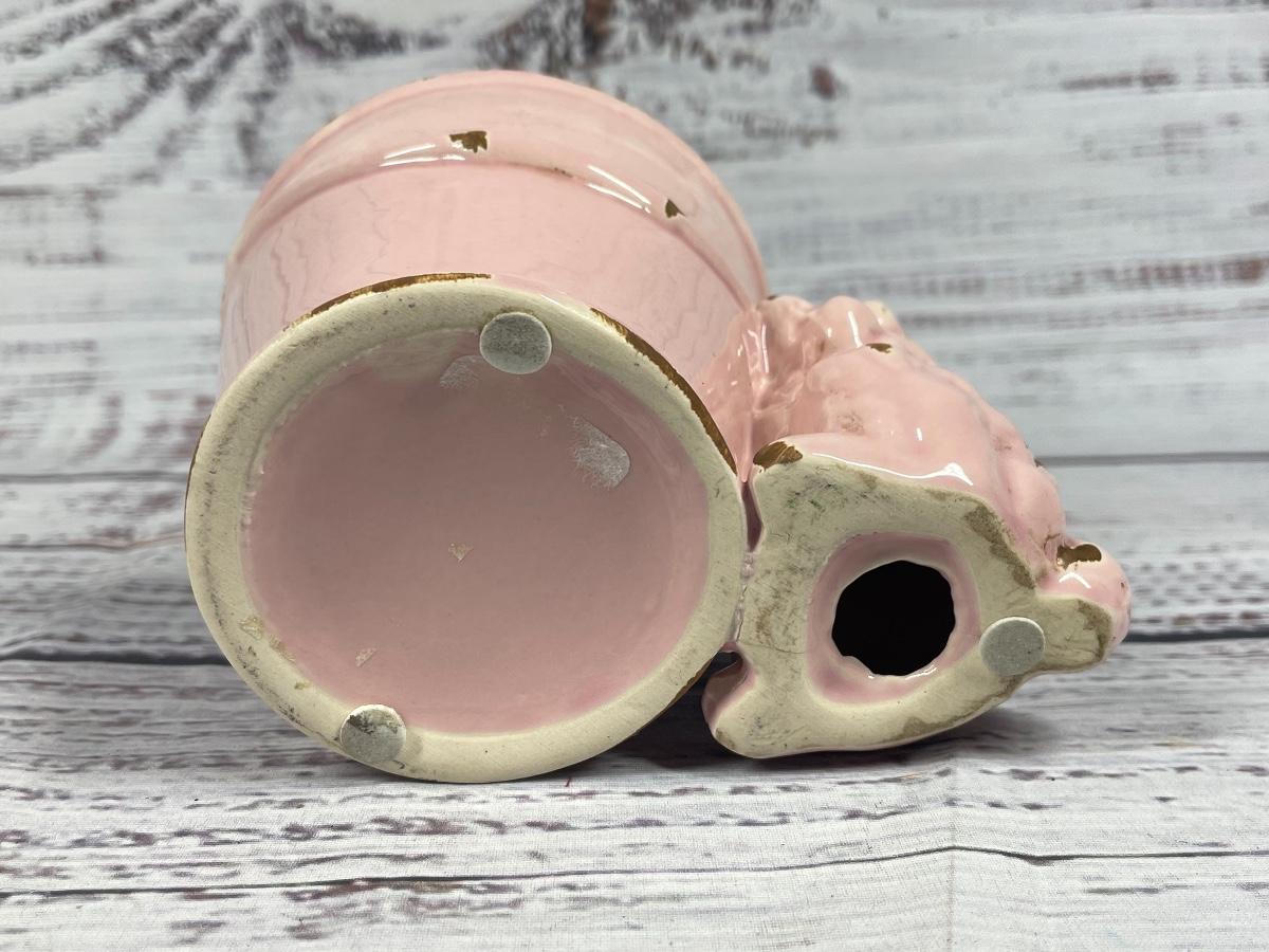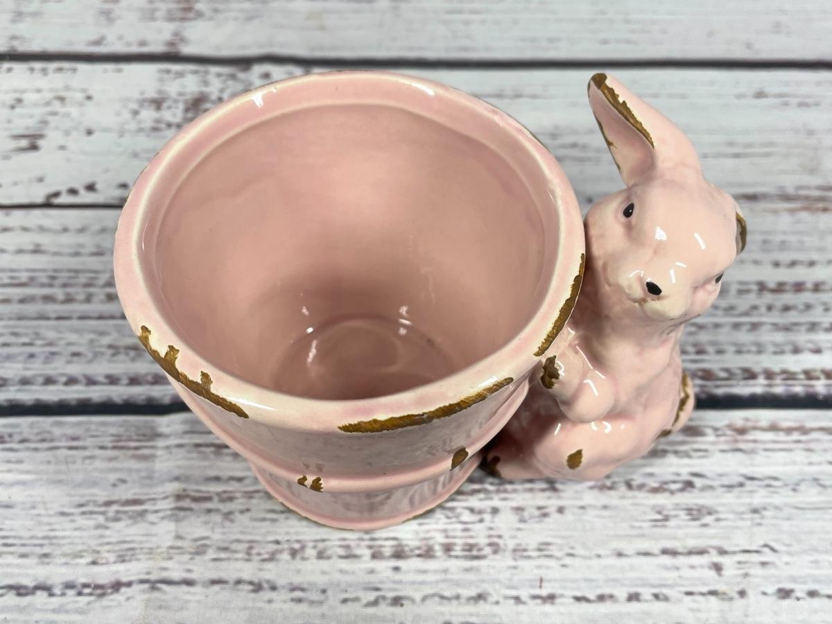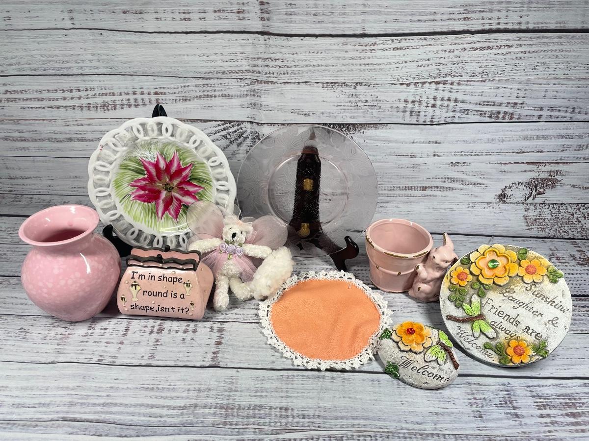 This set of items contain: a pink vase, pink piggy bank, ceramic bowl with a rabbit design, two tiny stuffed animals, a cloth piece, two plates, and two decorations with sayings. All items are in a decent condition. Some are discolored and dusty due to years of ownership.