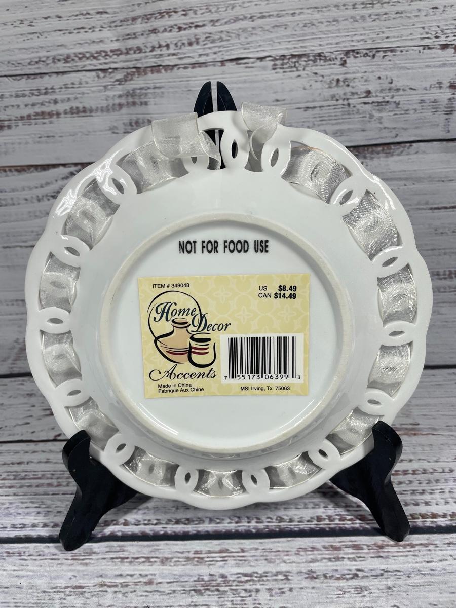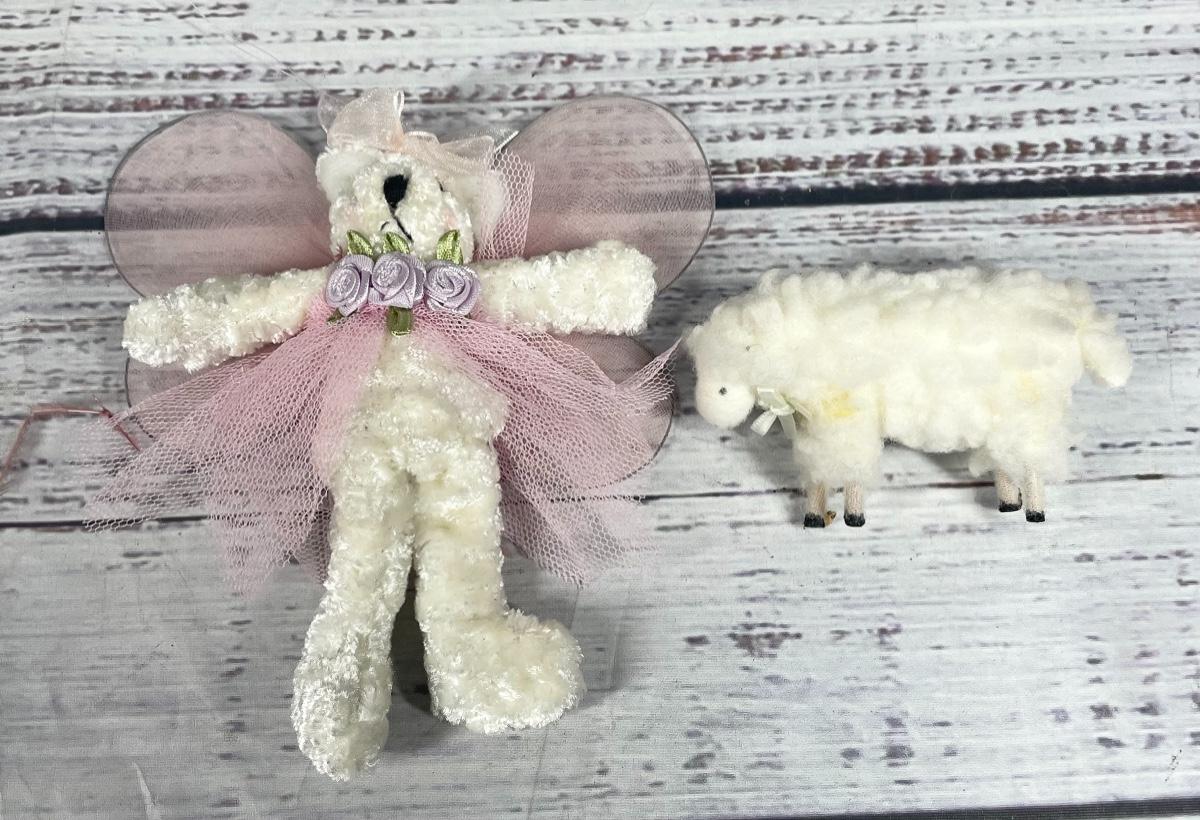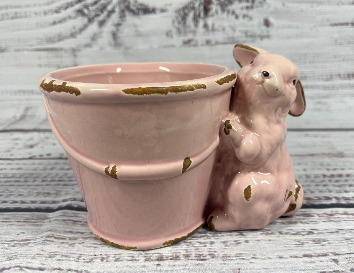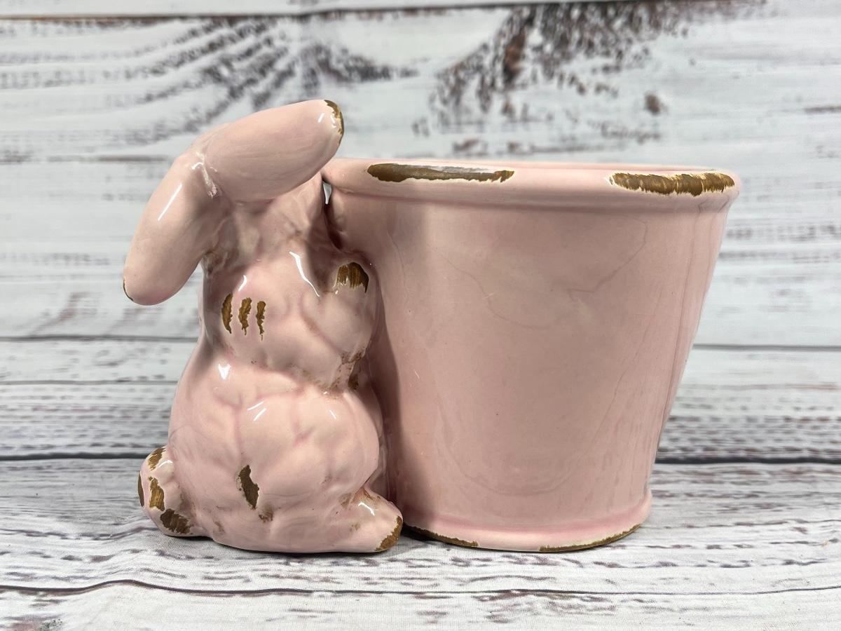 This set of items contain: a pink vase, pink piggy bank, ceramic bowl with a rabbit design, two tiny stuffed animals, a cloth piece, two plates, and two decorations with sayings. All items are in a decent condition. Some are discolored and dusty due to years of ownership.