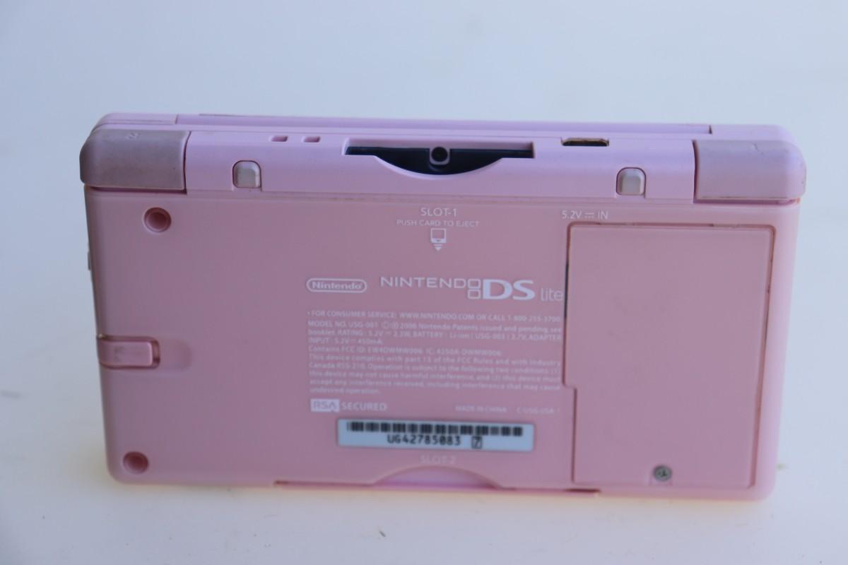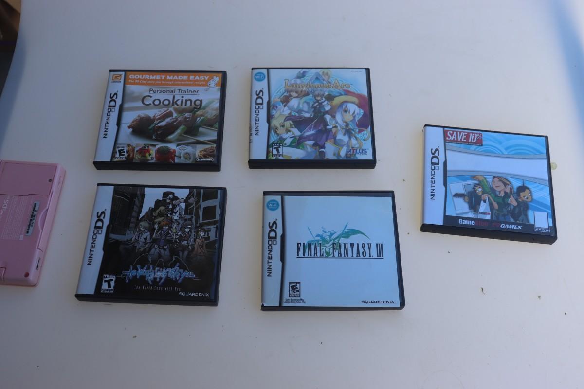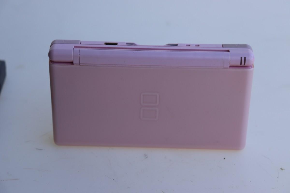 A portable Nintendo DS gaming console in a vibrant pink color, complete with an assortment of games, perfect for on-the-go entertainment and nostalgic gaming.