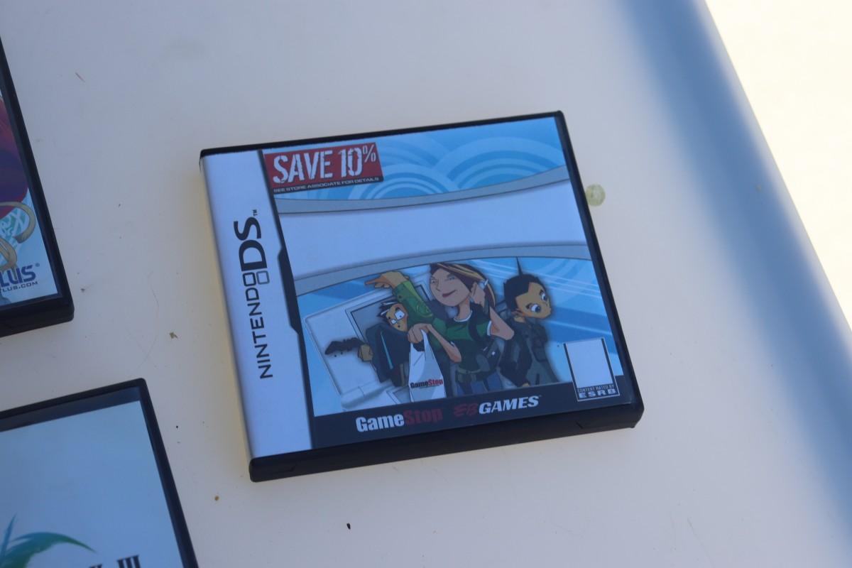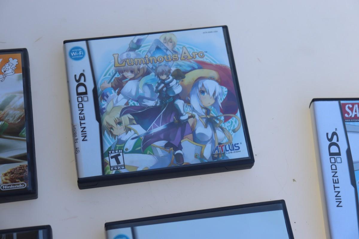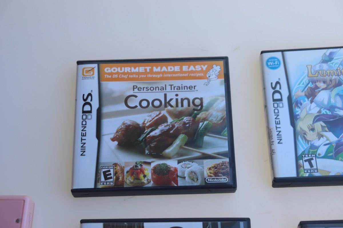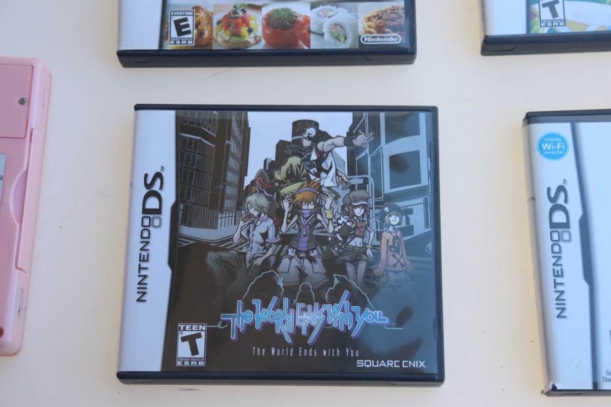 A portable Nintendo DS gaming console in a vibrant pink color, complete with an assortment of games, perfect for on-the-go entertainment and nostalgic gaming.