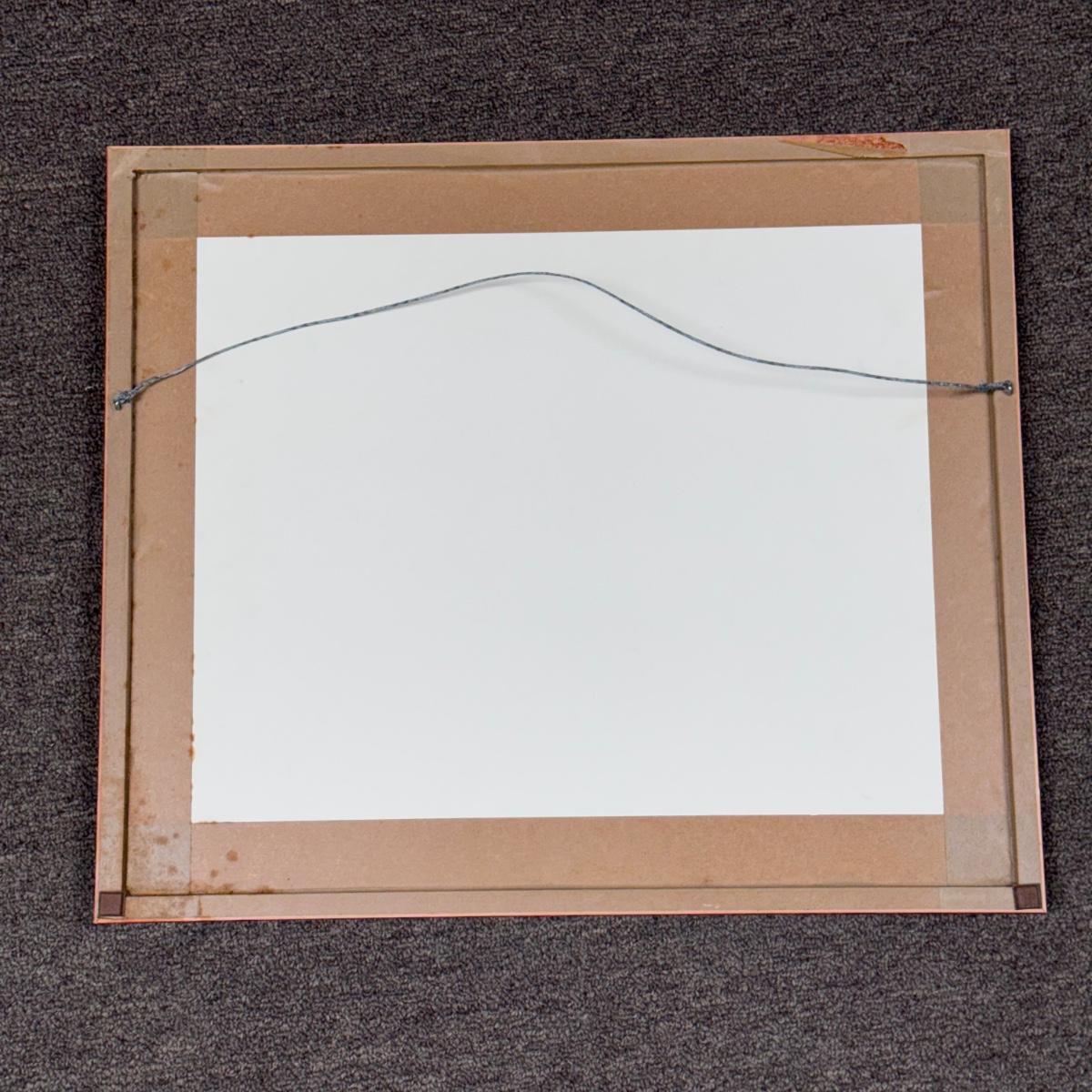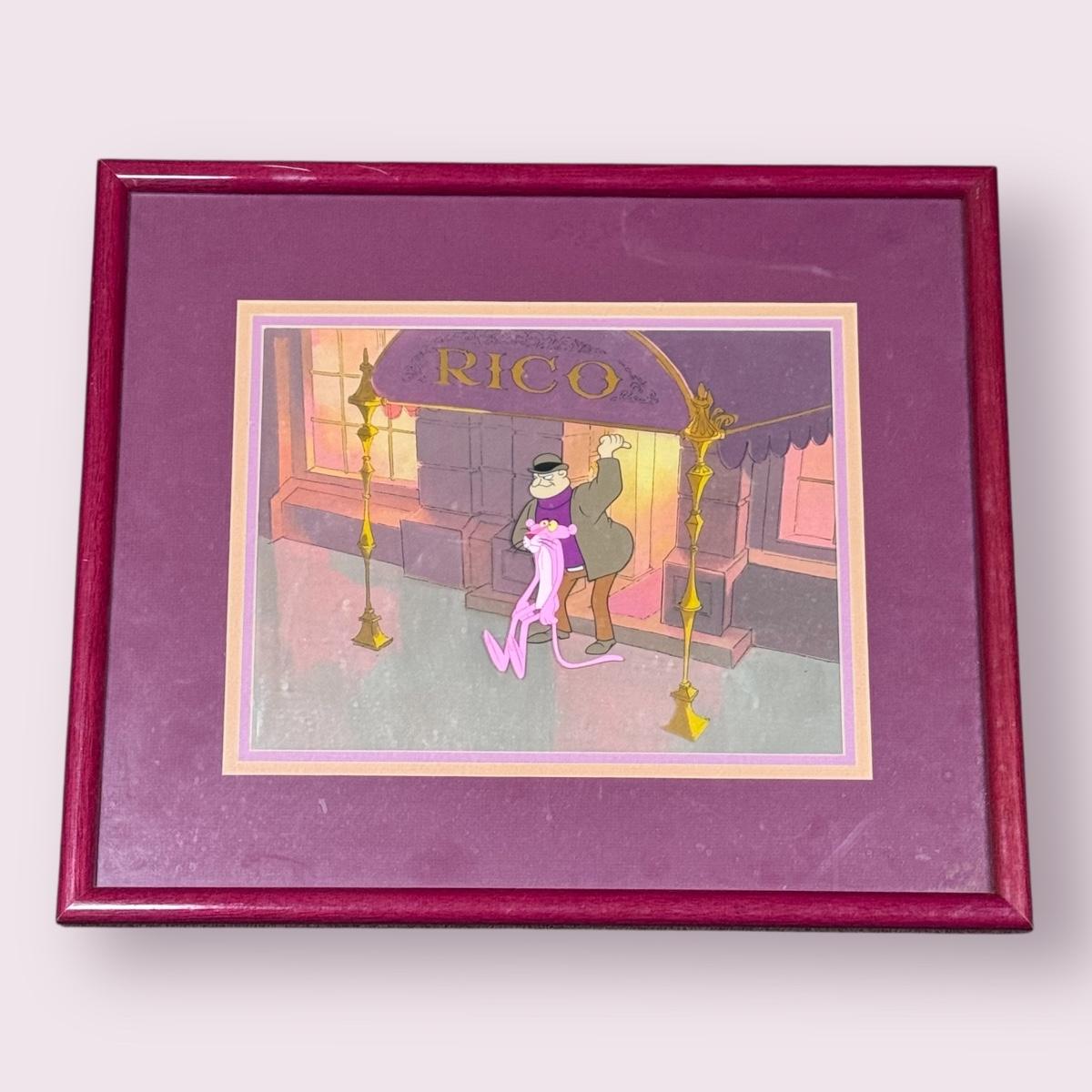 This lot includes one framed Pink Panther “RICO” cel. The art is protected with a plastic sheet, three mattings, and a wooden frame that is painted with a red glossy paint. The plastic sheet protecting the art needs a good cleaning. The frame measures 19” x 16”H.