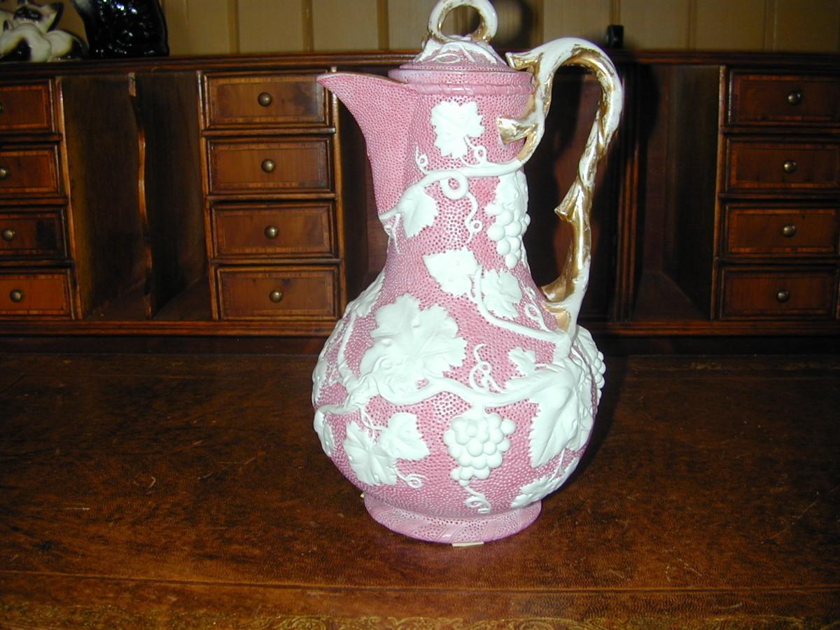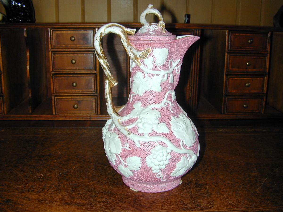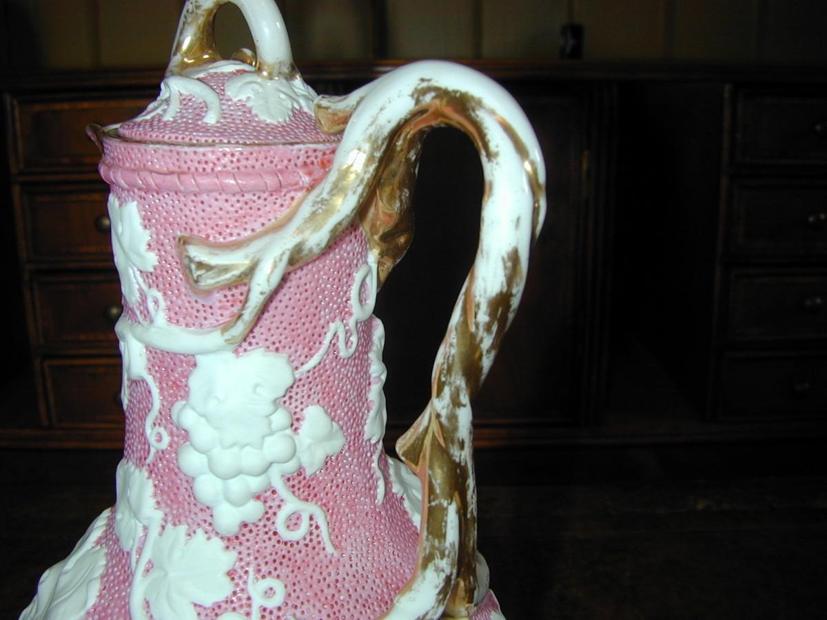 Pink Parian Pitcher or Jug With Lid - lid appears to be taped in with double sided tape. Measures 11.5 inches tall.