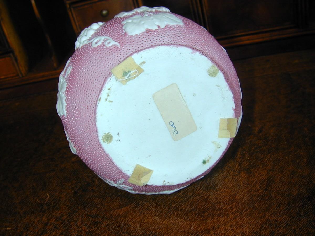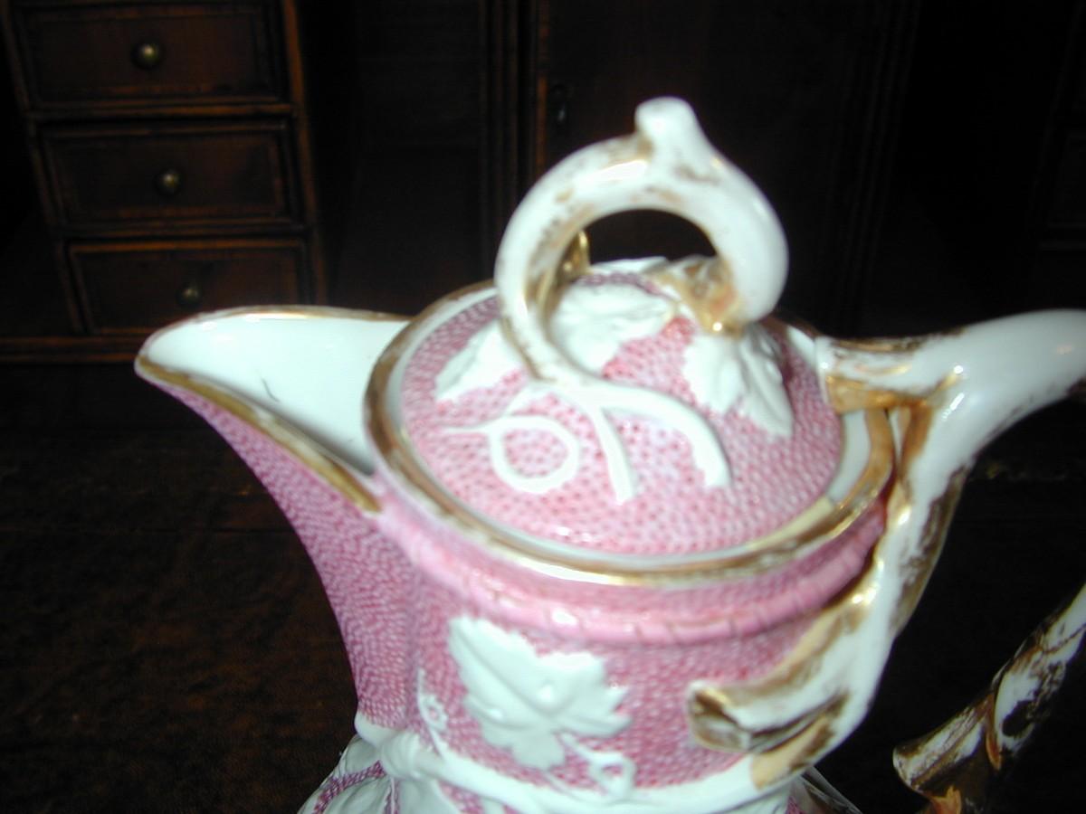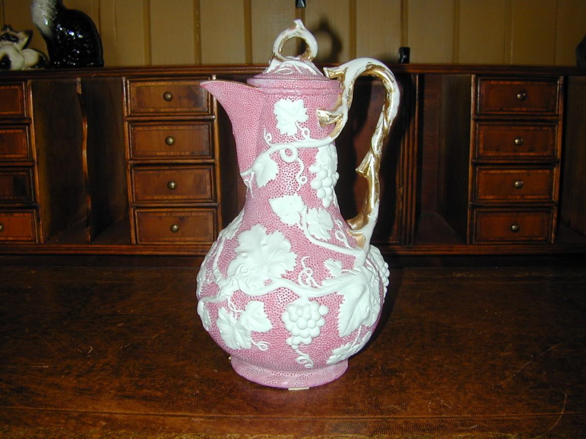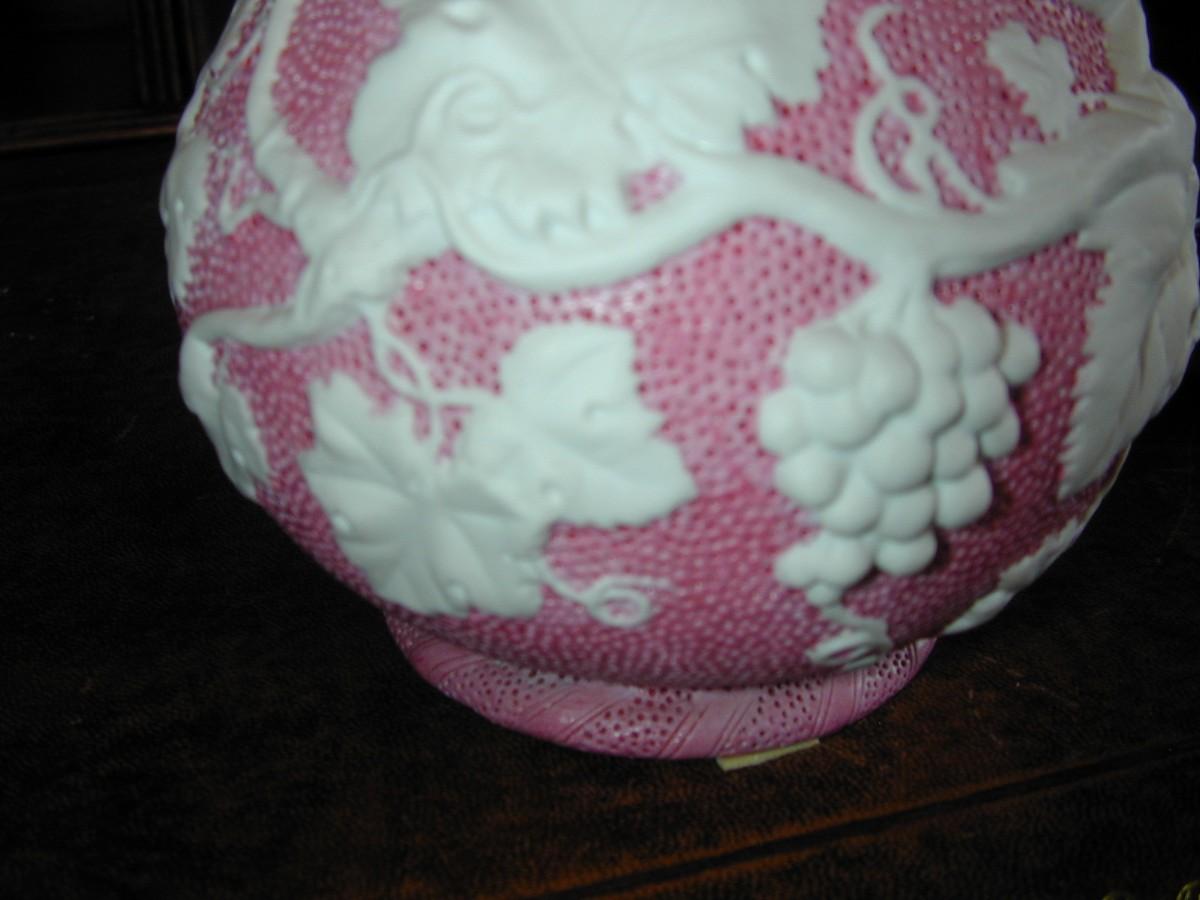 Pink Parian Pitcher or Jug With Lid - lid appears to be taped in with double sided tape. Measures 11.5 inches tall.