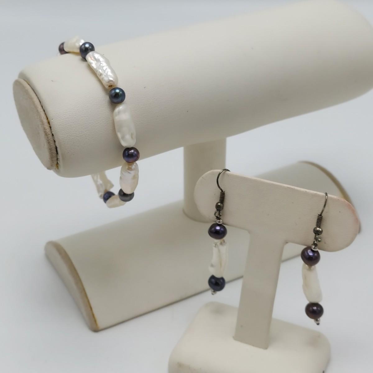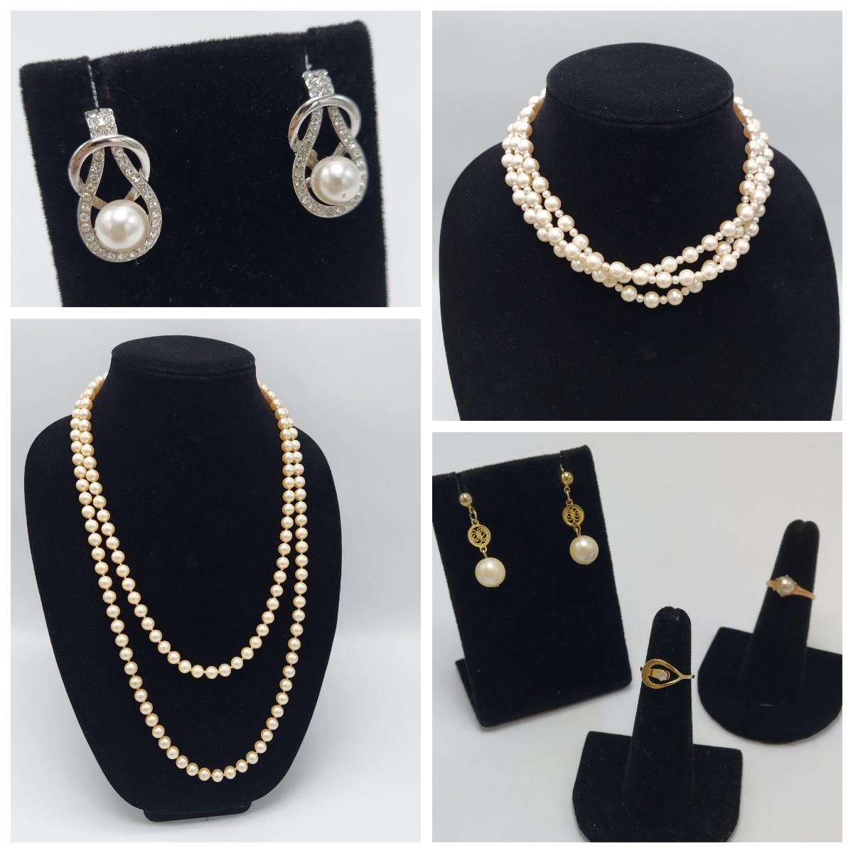 Two pearl necklaces, two rings, three pairs of earrings, a bracelet and a pin. Most pearls have a glass like texture but we're not authenticated. All sales are final. No returns or refunds. Please bid accordingly. Shipping available