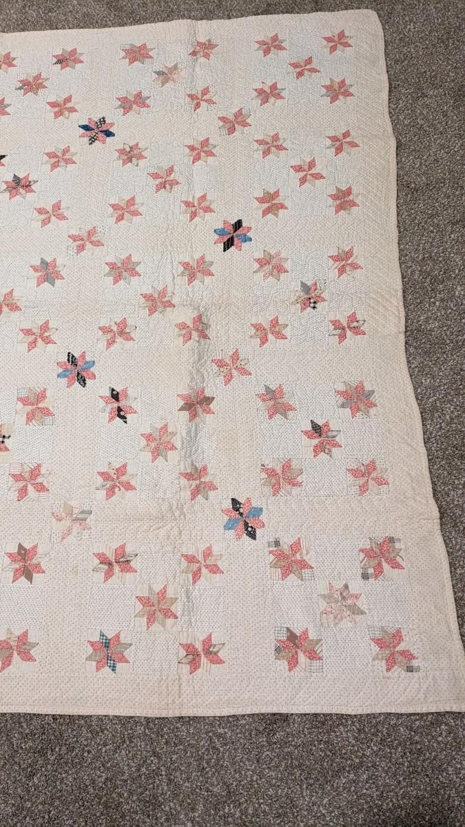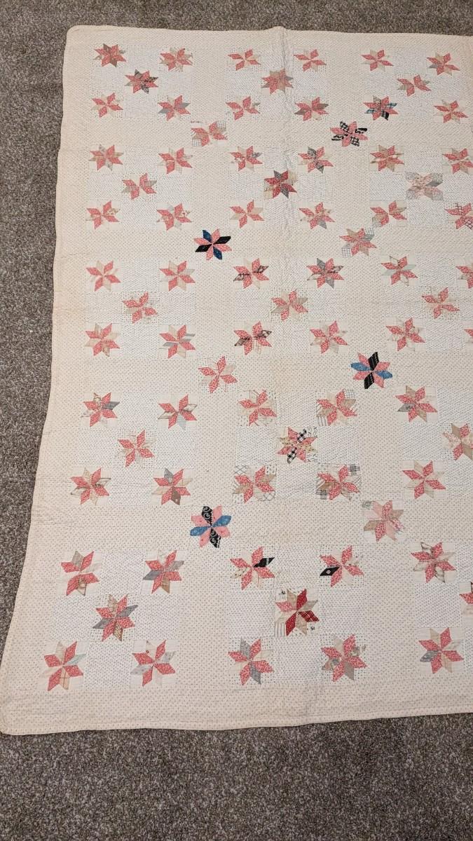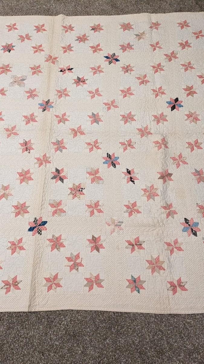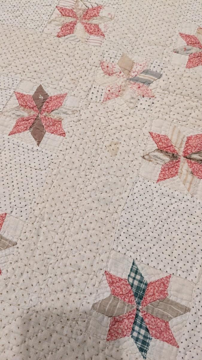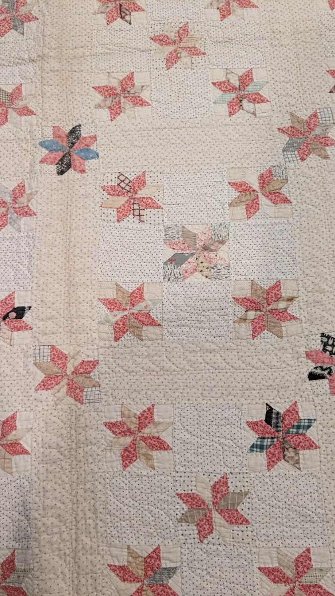 82"x 62.25". Another magnificent very early quilt with 3.25"x2.75" pinwheel squares. Light discoloration found along seam and multiple pinwheels show threadbear tears and one appears to be replaced entirely. Light cream color fabric fames the pieces as well as frames larger 9.75"x9" squares making it appear discolored but it is just the fabric color. For all intents and purposes this is still a marvelous quilt showing phenomenal early craftsmanship.
