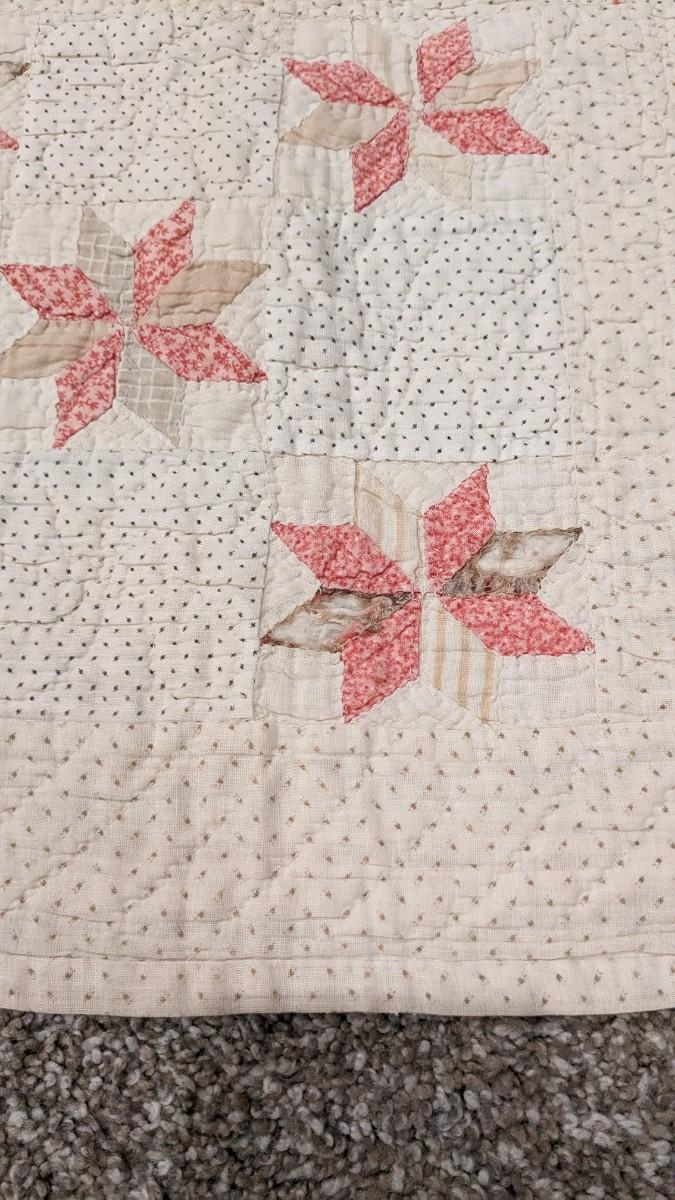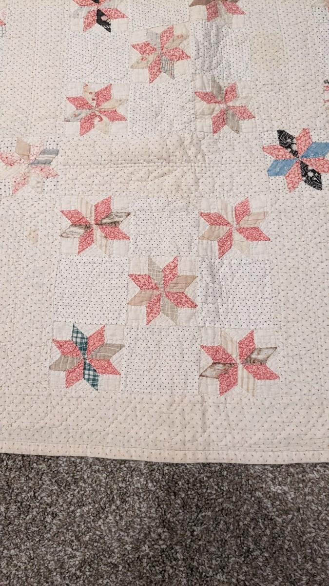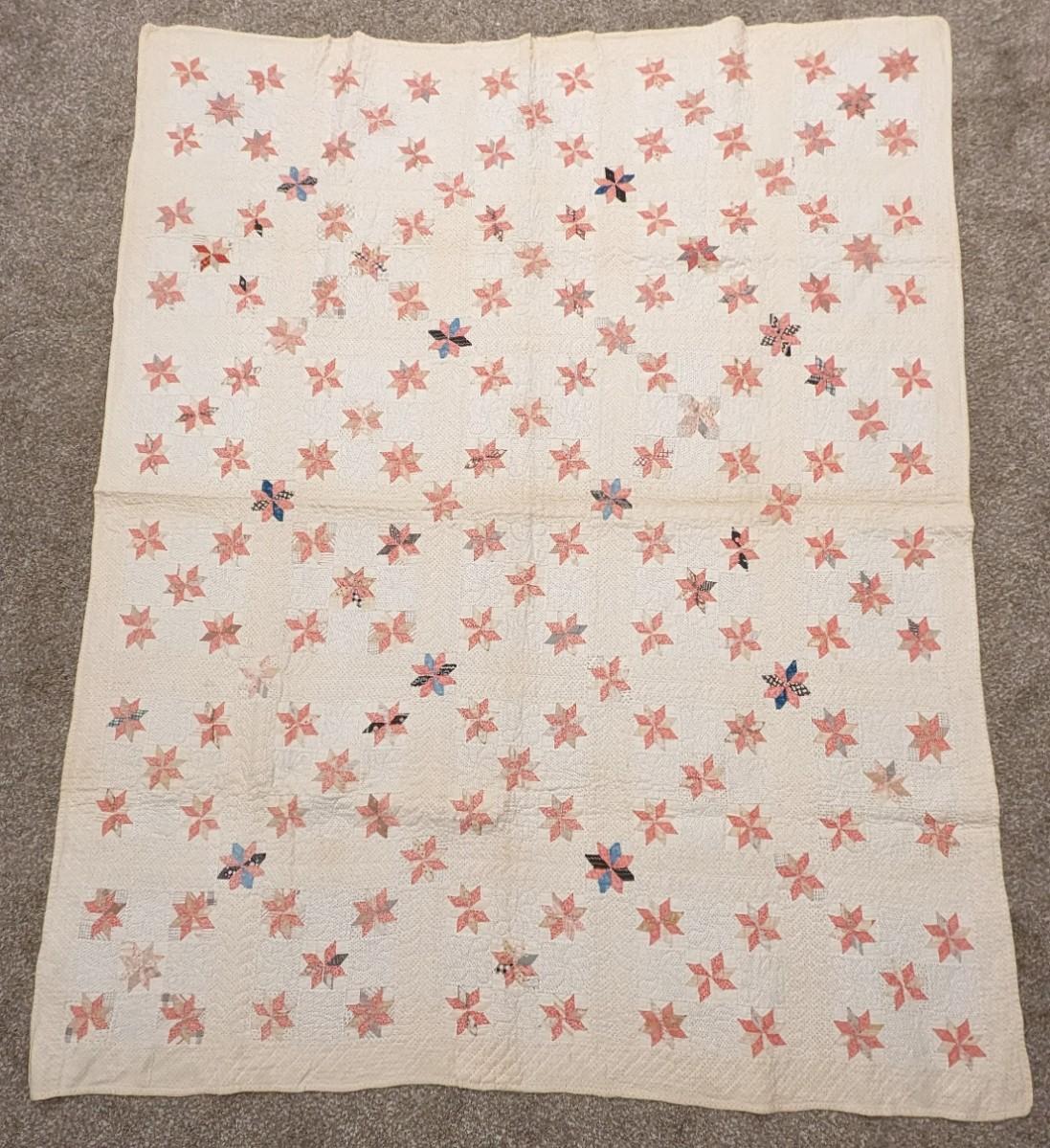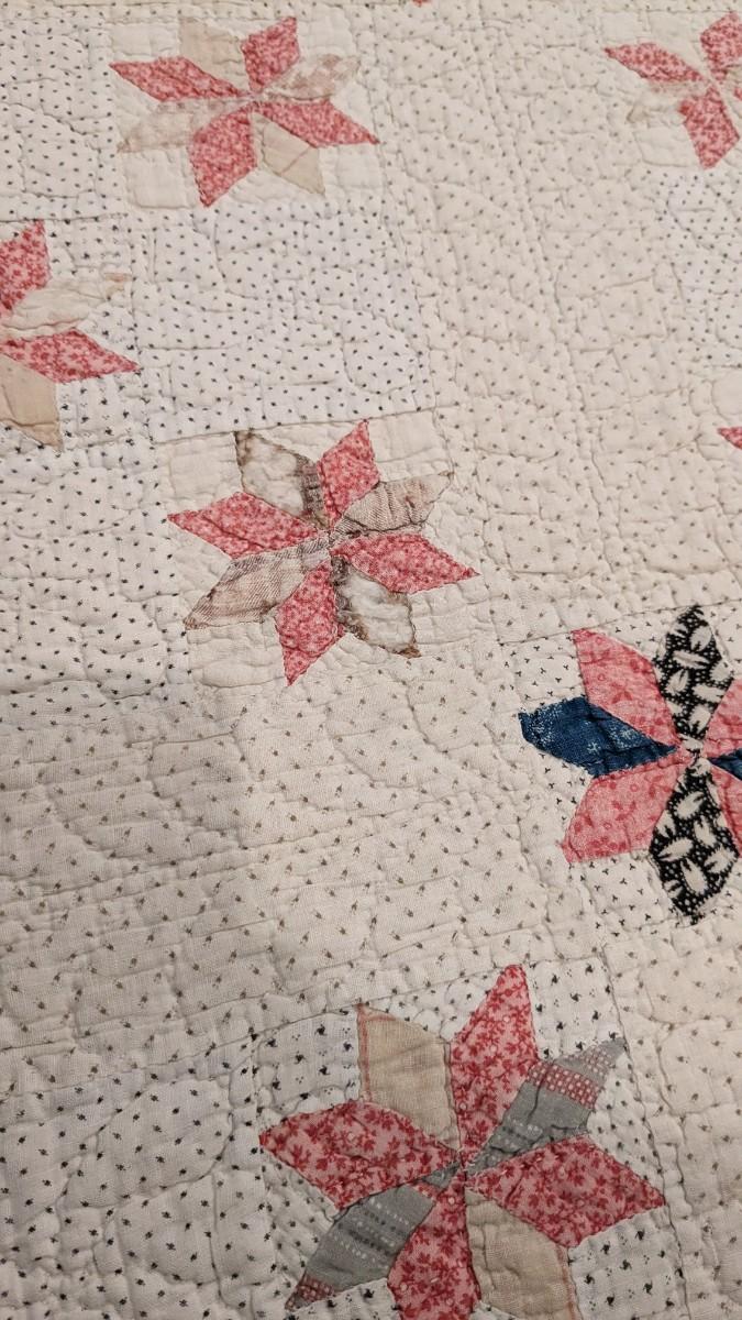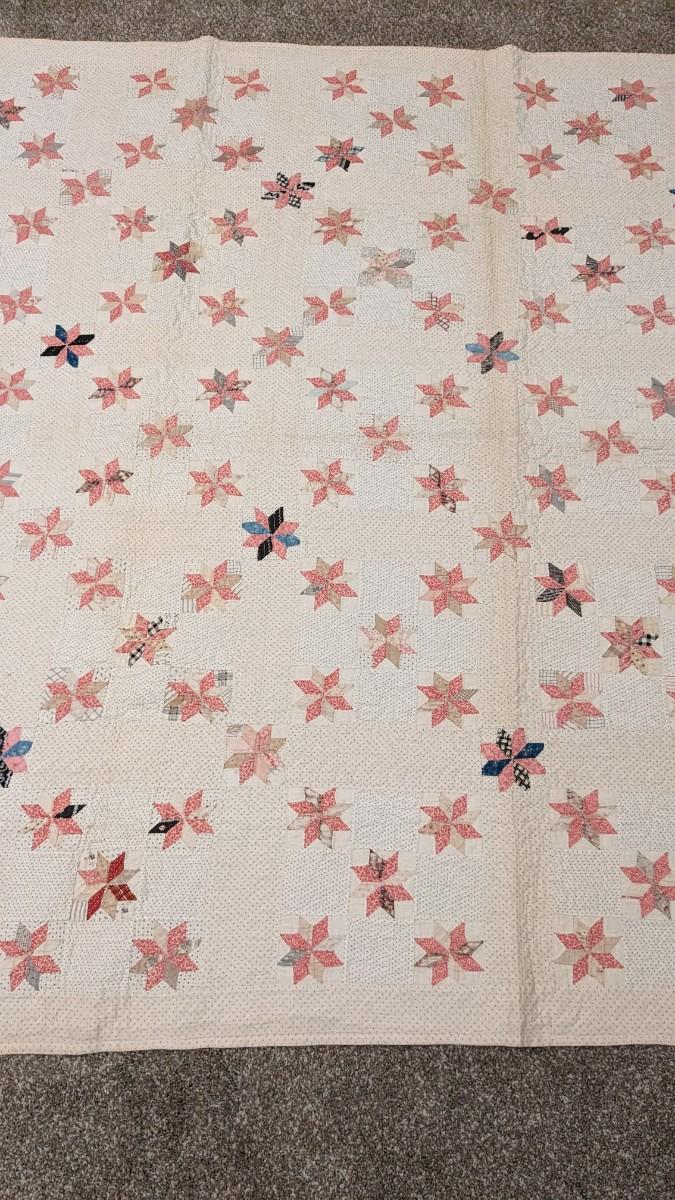 82"x 62.25". Another magnificent very early quilt with 3.25"x2.75" pinwheel squares. Light discoloration found along seam and multiple pinwheels show threadbear tears and one appears to be replaced entirely. Light cream color fabric fames the pieces as well as frames larger 9.75"x9" squares making it appear discolored but it is just the fabric color. For all intents and purposes this is still a marvelous quilt showing phenomenal early craftsmanship.