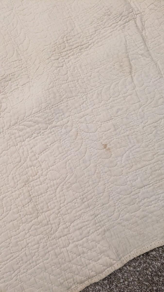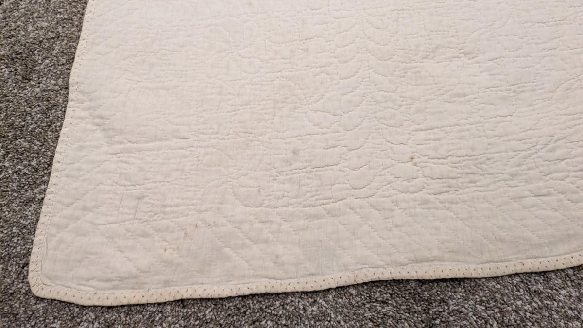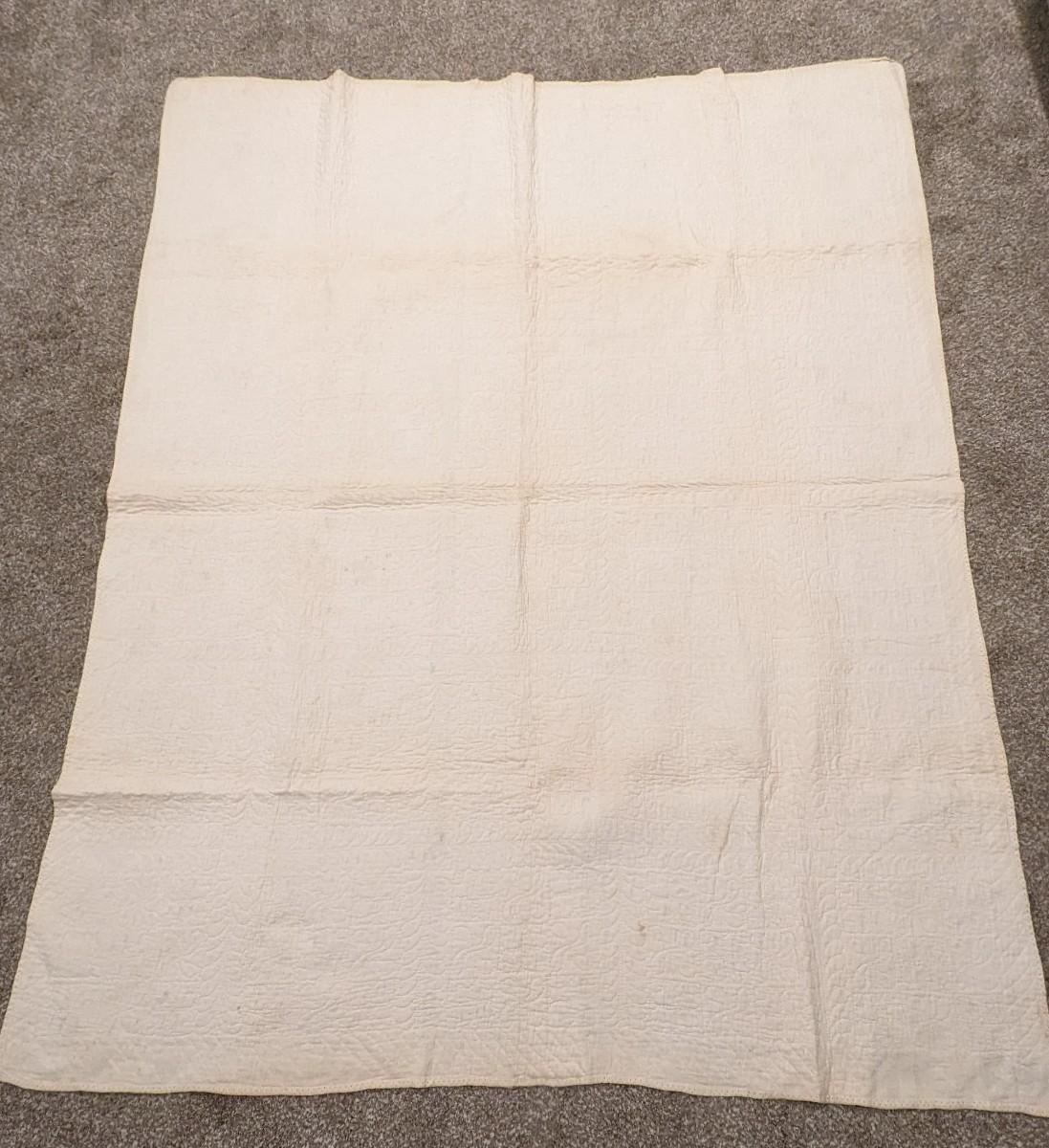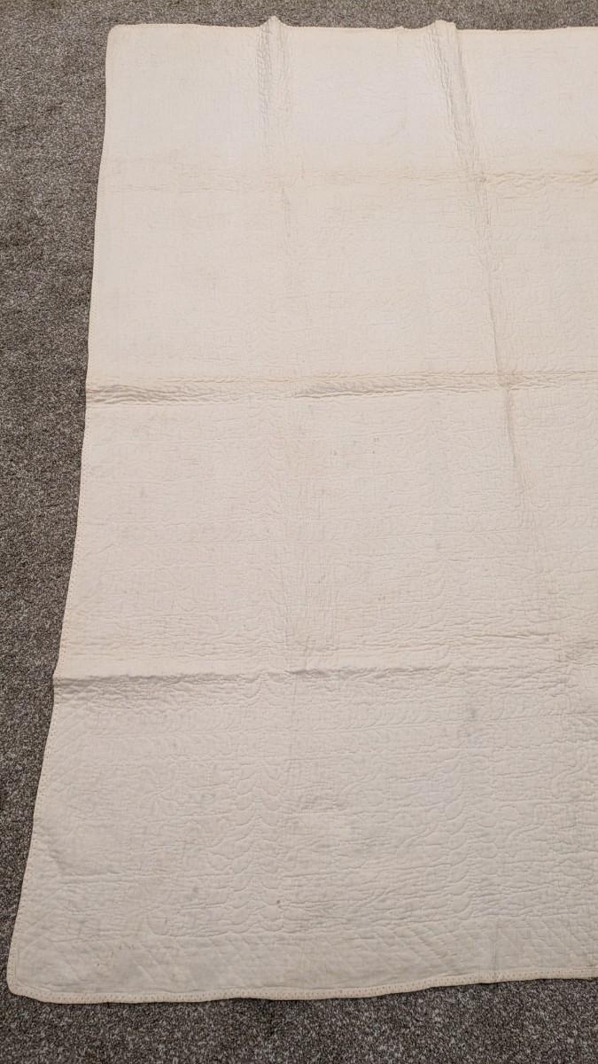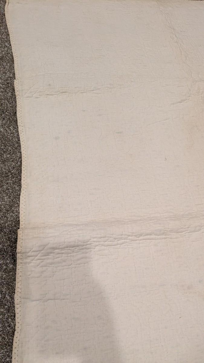 82"x 62.25". Another magnificent very early quilt with 3.25"x2.75" pinwheel squares. Light discoloration found along seam and multiple pinwheels show threadbear tears and one appears to be replaced entirely. Light cream color fabric fames the pieces as well as frames larger 9.75"x9" squares making it appear discolored but it is just the fabric color. For all intents and purposes this is still a marvelous quilt showing phenomenal early craftsmanship.